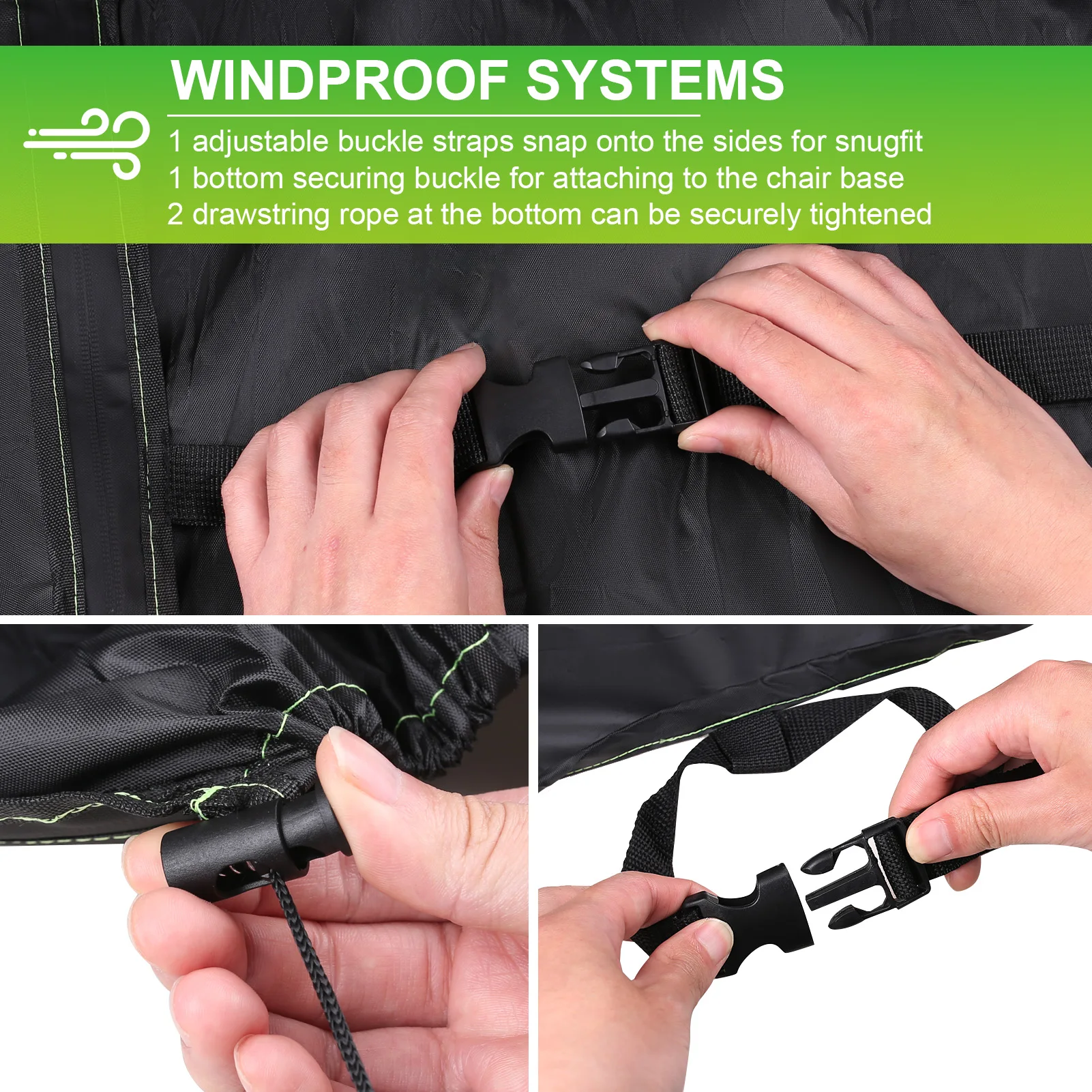 The egg chair cover with zipper and hem cord allows adjustment for a tight and custom-like fit, and secure cover on the windiest days, make your patio hanging chair's life last longer and stay strong. Tighten the tether and tie it under the chair frame to achieve a good windproof effect.