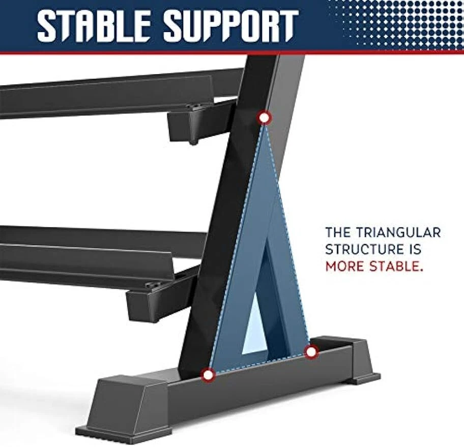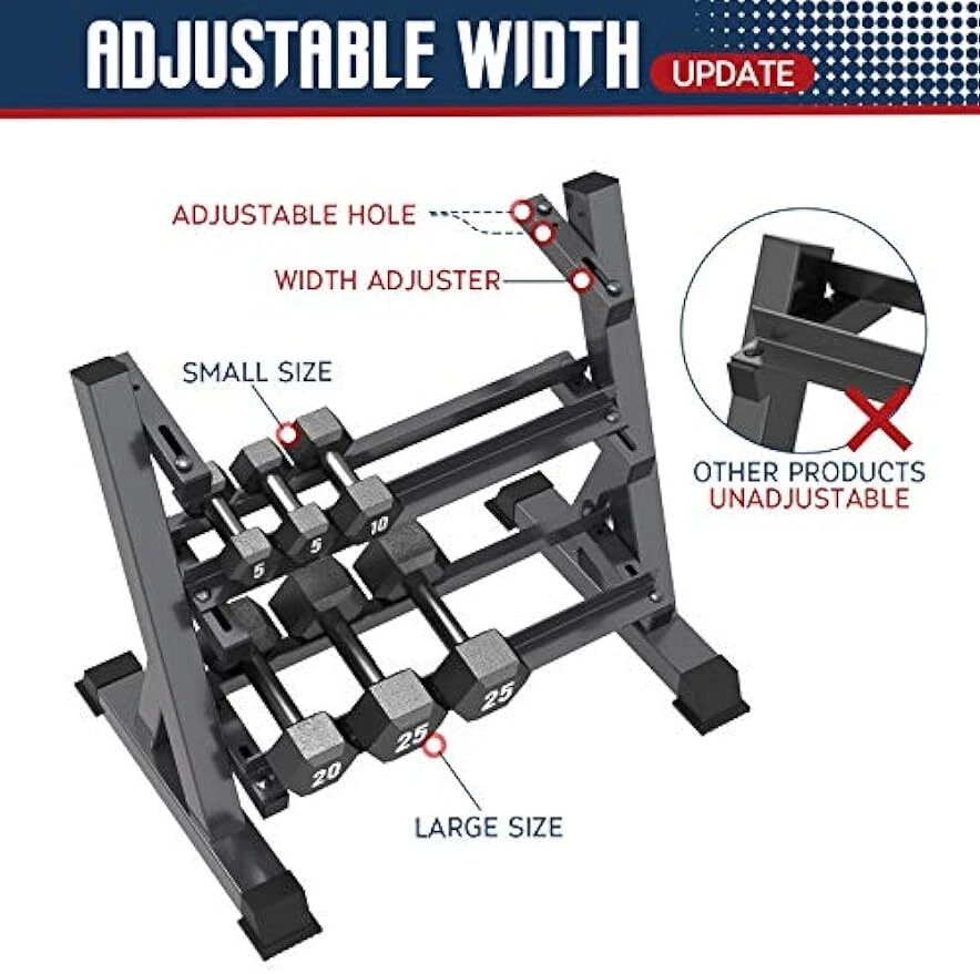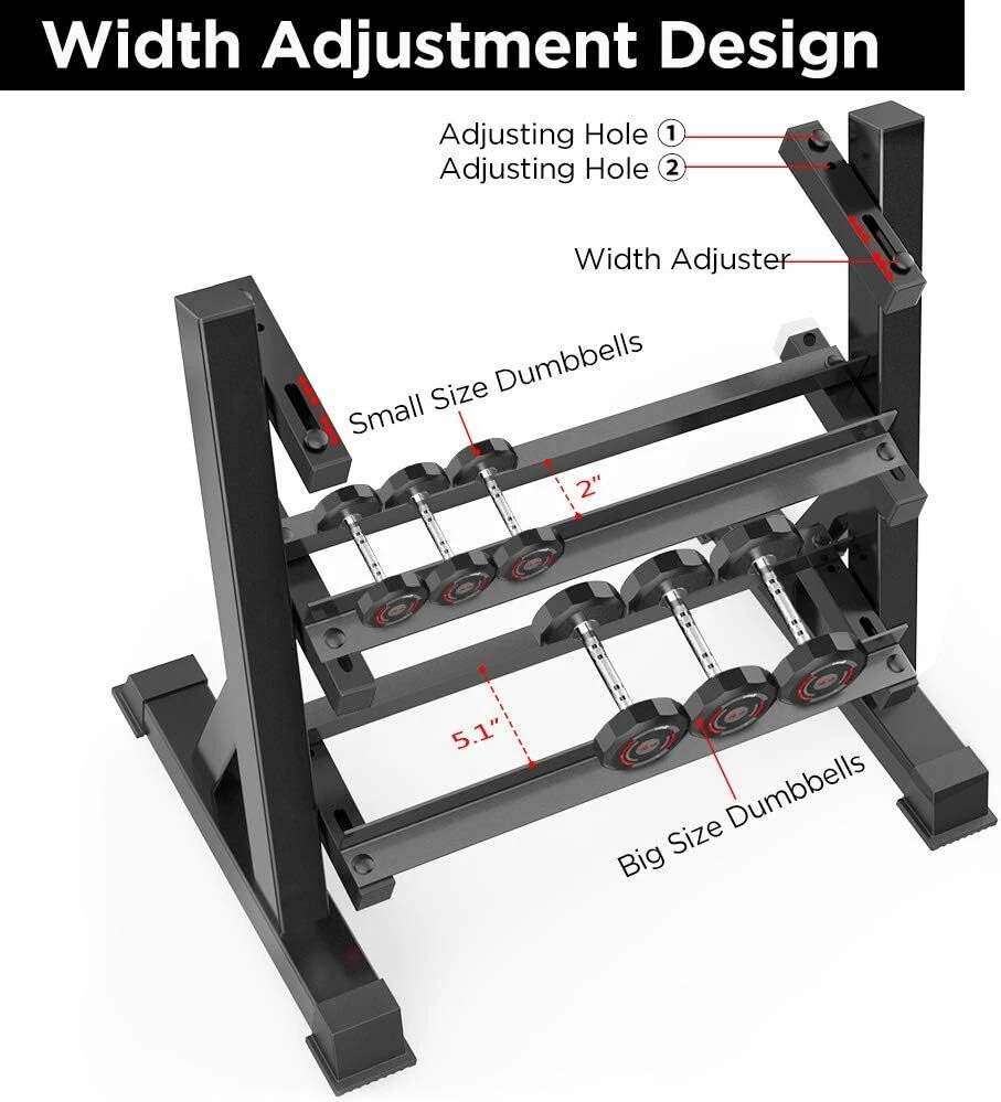 【ERGONOMIC DESIGN】The three-tier compact design is for ergonomic handling and measuring in at just 39” x 19.7” x 36.6”. Another special point is angled anti-slip individual racks which allow easy storage and prevent accidental dumbbell slip. This weight stand also focuses on holding high amounts of weight and still stay sturdy because the triangle base structure and solidly welded construction of this dumbbell stand can make it the best stability. 【WIDTH ADJUSTMENT】 Featuring in fitting different size dumbbell and weights, every tier of this weight holder has 4 screw holes and 2 bar width adjusters which allow adjusting the bar width from 2" to 5.1". So it can hold both bigger dumbbells and smaller dumbbells then you rest assured that your workout gear can be sorted and organized in an efficient way. 【SPACE SAVING】One of the major benefits of this compact dumbbell stand over other ones is that it can hold up to higher pounds without taking up the bulk of space in your home gym. The three-tier design saves you space while still giving you enough capacity to keep your most-used weights off the floor. *IMPORTANT NOTE: The weights are not included in the parcel.