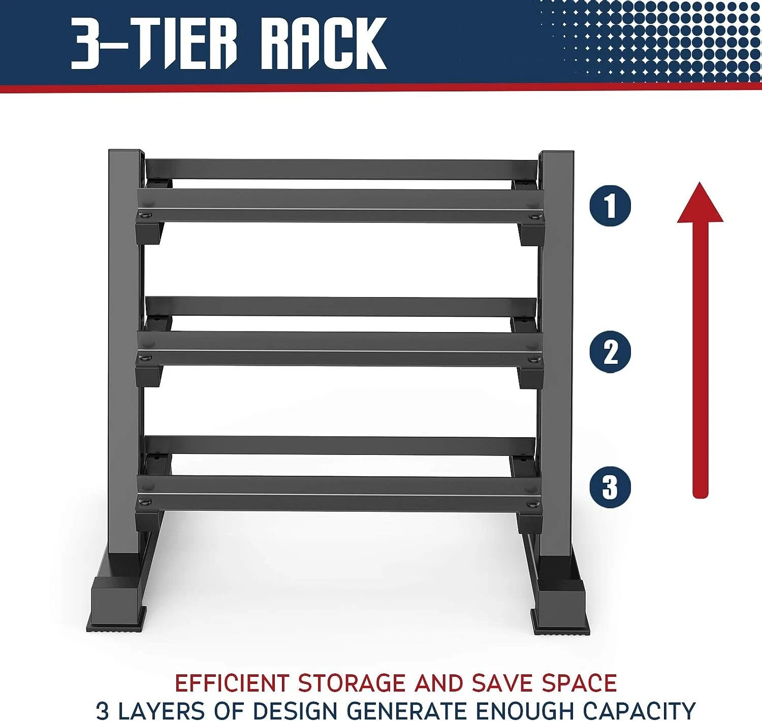 Features: 1) 3 tier and tilted angled weight racks are for more storage and easy handling. 2) Width adjustable design fits all different dumbbell sizes and styles. 3) Commercial heavy-duty steel provides lifetime use. 4)The compact structure takes up a small space.