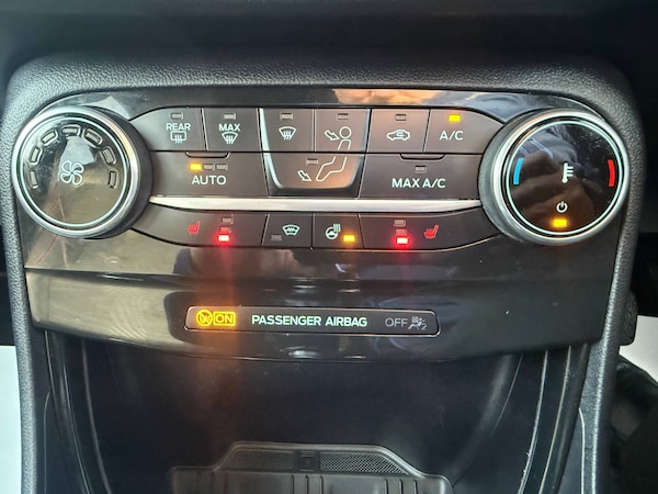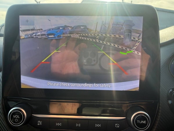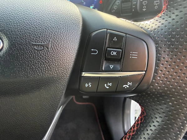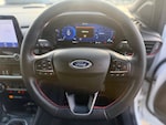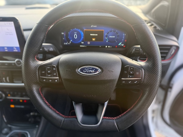 3 rear seatbelts, Autonomous emergency braking, Child safety lock, Electronic stability control (ESC) and hill start assist, Pedestrian/cyclist detection and post-collision braking, Pre collision assist system, Tyre pressure monitoring system (TPMS), Cruise control with Intelligent speed assist, Driver impairment monitor, Emergency call service, Ford easy fuel, Full digital 12.3 inch instrument cluster, Lane keeping aid with lane departure warning, Manual tailgate, Power assist steering, Power start button, Rear parking sensor, Selectable drive modes(Normal, Eco, Sport, Slippery and Trail), Speed sign recognition, Automatic headlights with auto high beam, Automatic rain sensing wipers, Body coloured door mirrors, Body coloured roof, Front fog lamps, Large body colour rear roof spoiler, LED daytime running lights, LED rear lamps, Power foldable heated door mirrors with puddle lamps, Privacy glass to side rear windows and tailgate glass, Projector headlamps, Quickclear heated windscreen, Rear side wing doors, Rear wiper, Solid paint, ST-Line body styling kit with unique grille, Third brake light, 3 seat bench in 2nd row, Centre console with armrest and stowage, Ford megabox extended bootspace, Front and rear head restraints, Front floor mats, Manual 4 way driver seat adjust with lumbar adjustment, Manual 4 way passenger seat with lumbar seat adjustment, Sensico partial premium upholstery, Single front passenger seat, ST-Line flat bottomed sensico leather steering wheel with leather handbrake and aluminium gear knob, Wireless charging pad with electronic air temperature control (EATC), BandO Premium Audio system + Ford SYNC 3 navigation pack - Puma, Sport suspension, Carbon look interior deco spears, Thatcham alarm, 18 inch 5 spoke matt black finish alloy wheels, Tyre inflation kit