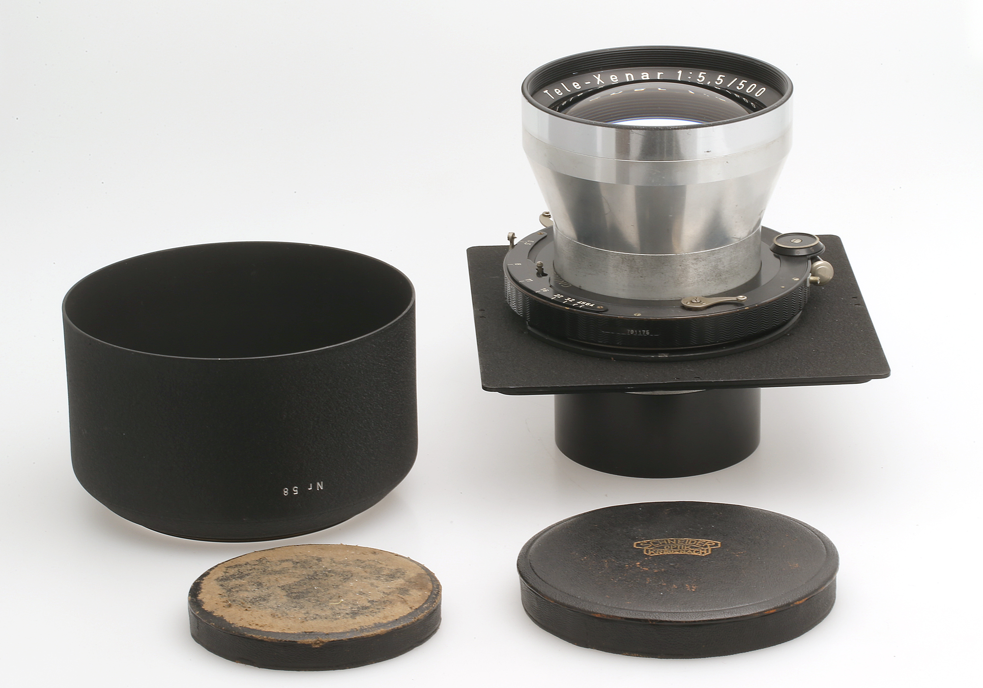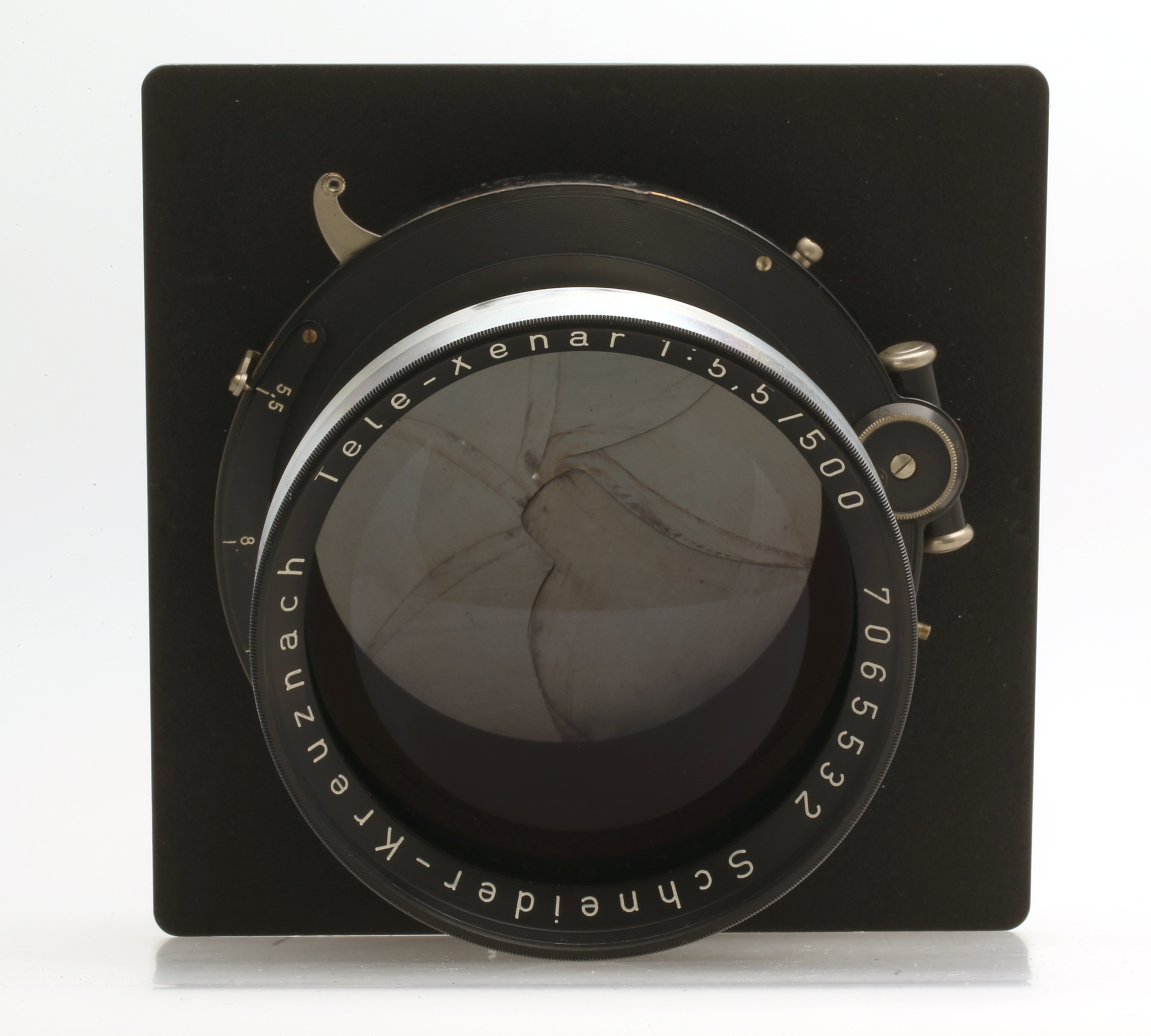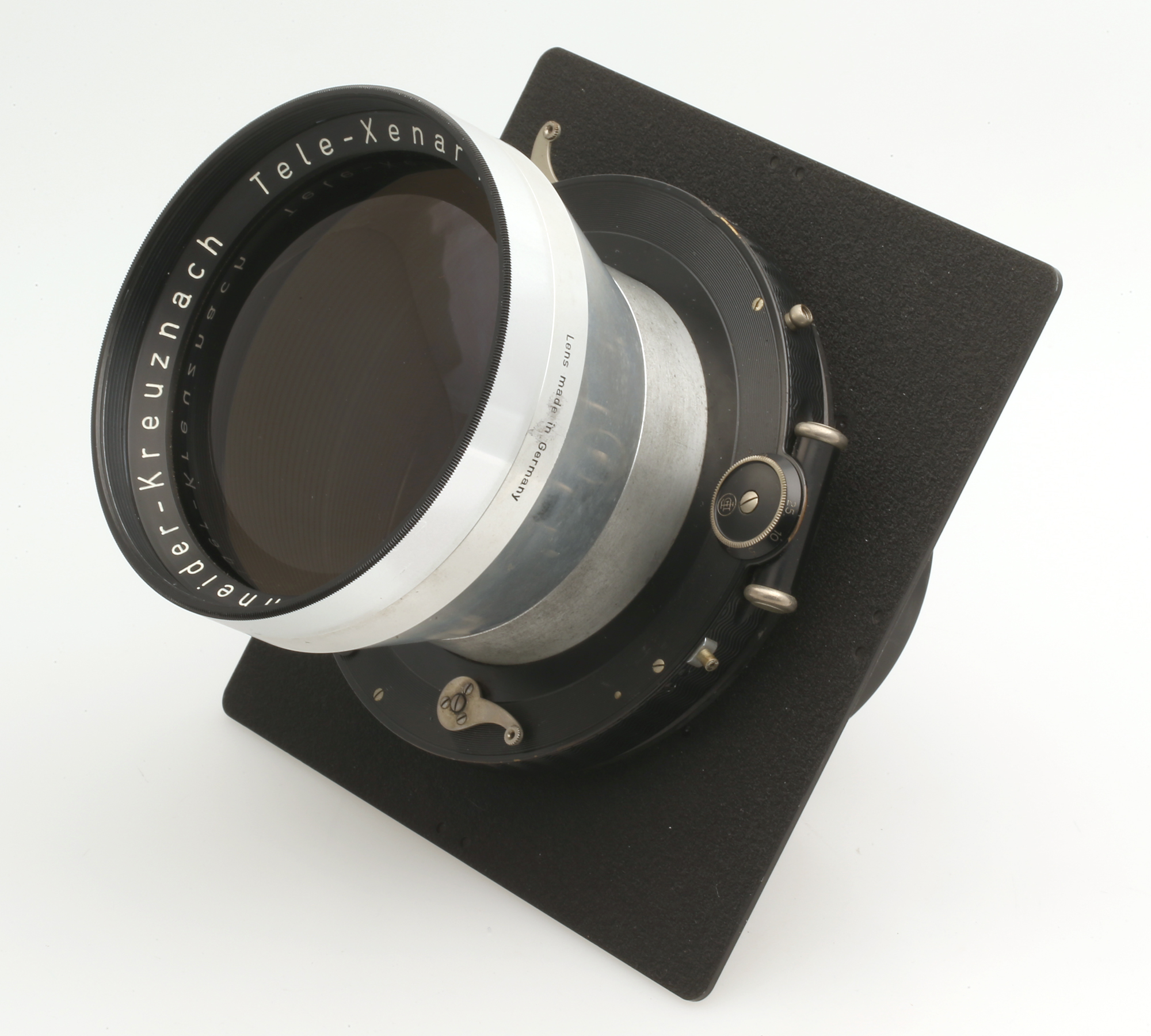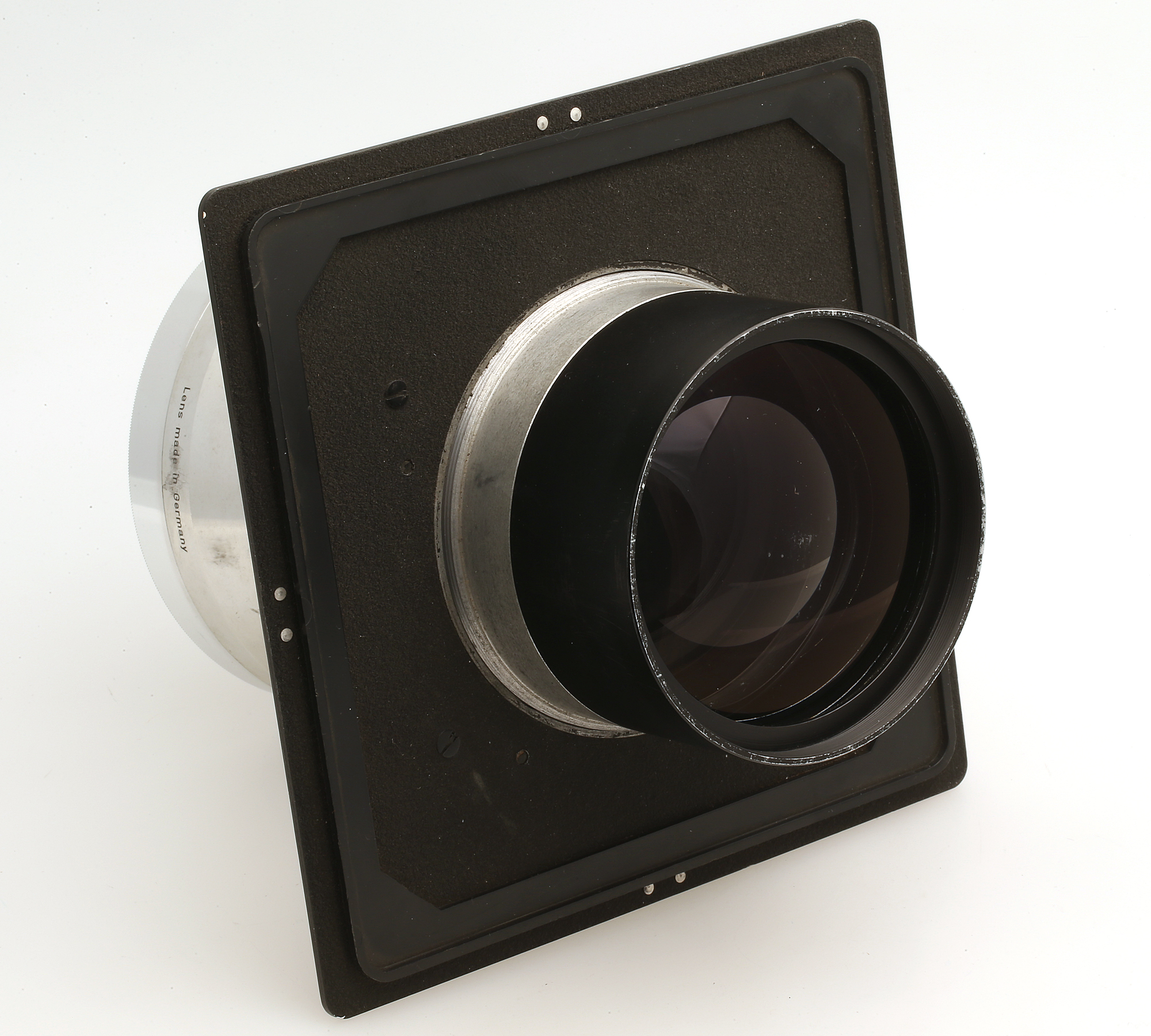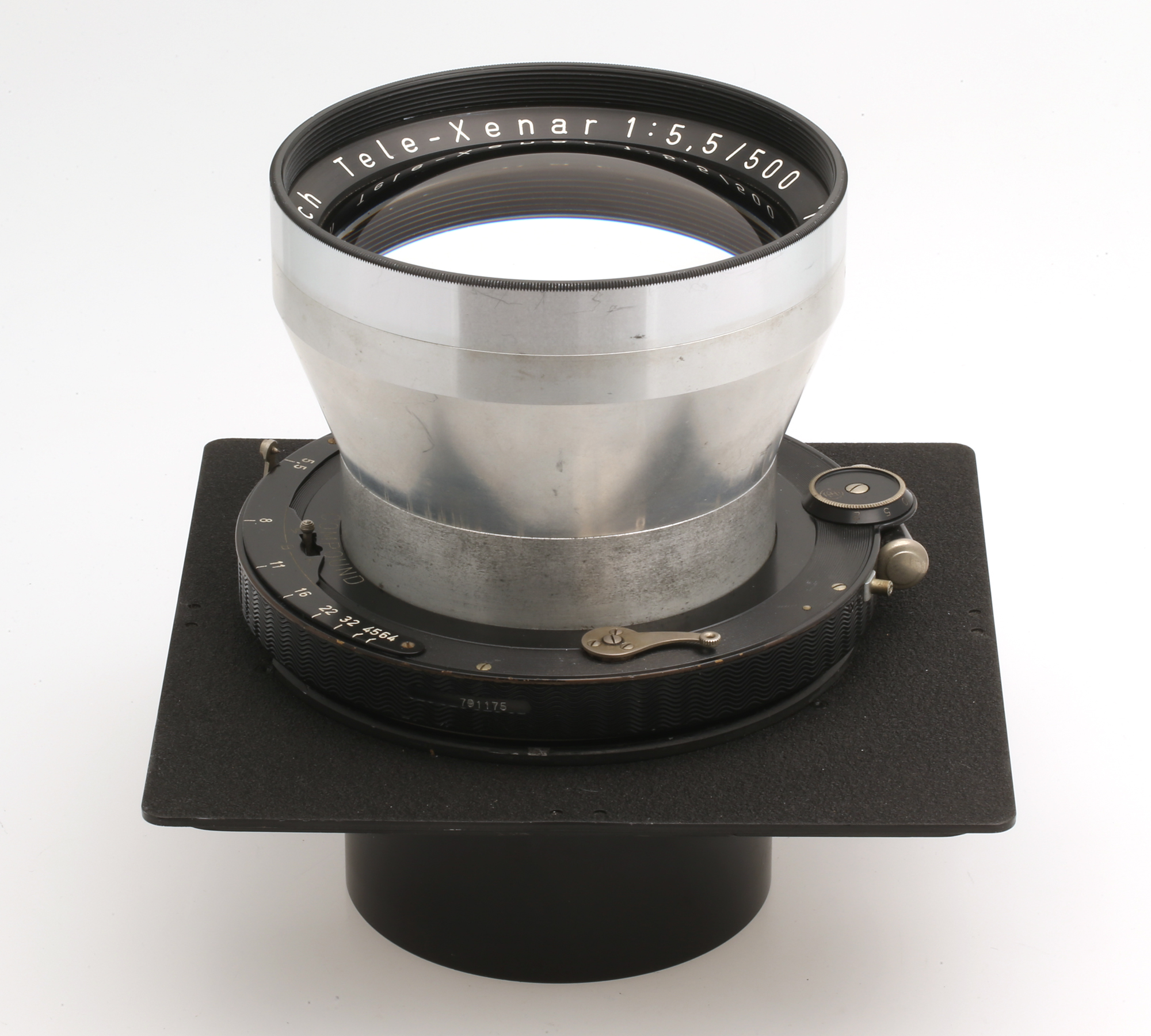 Großformat-Teleobjektiv mit Compound Zentralverschluß auf einer 162x162 mm großen Linhof Technika Platine.
