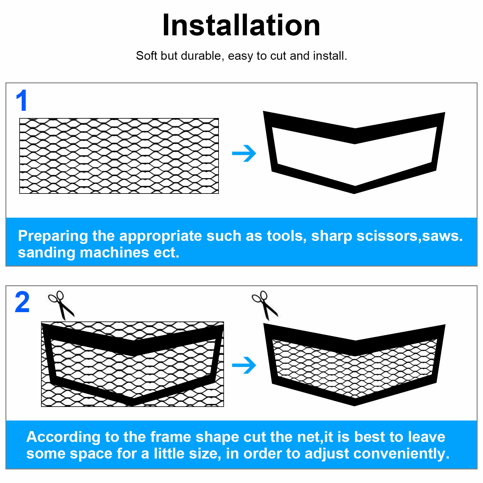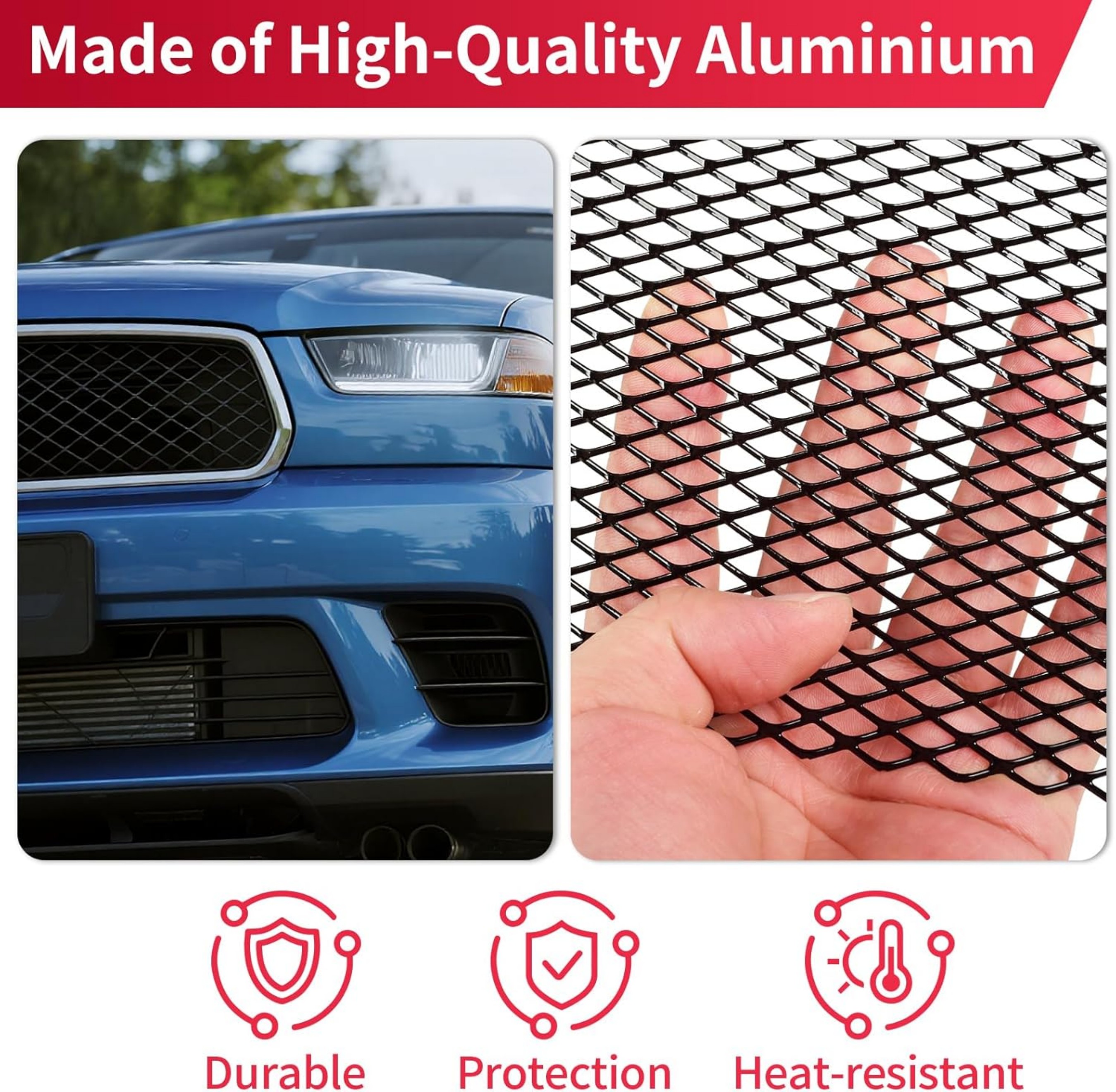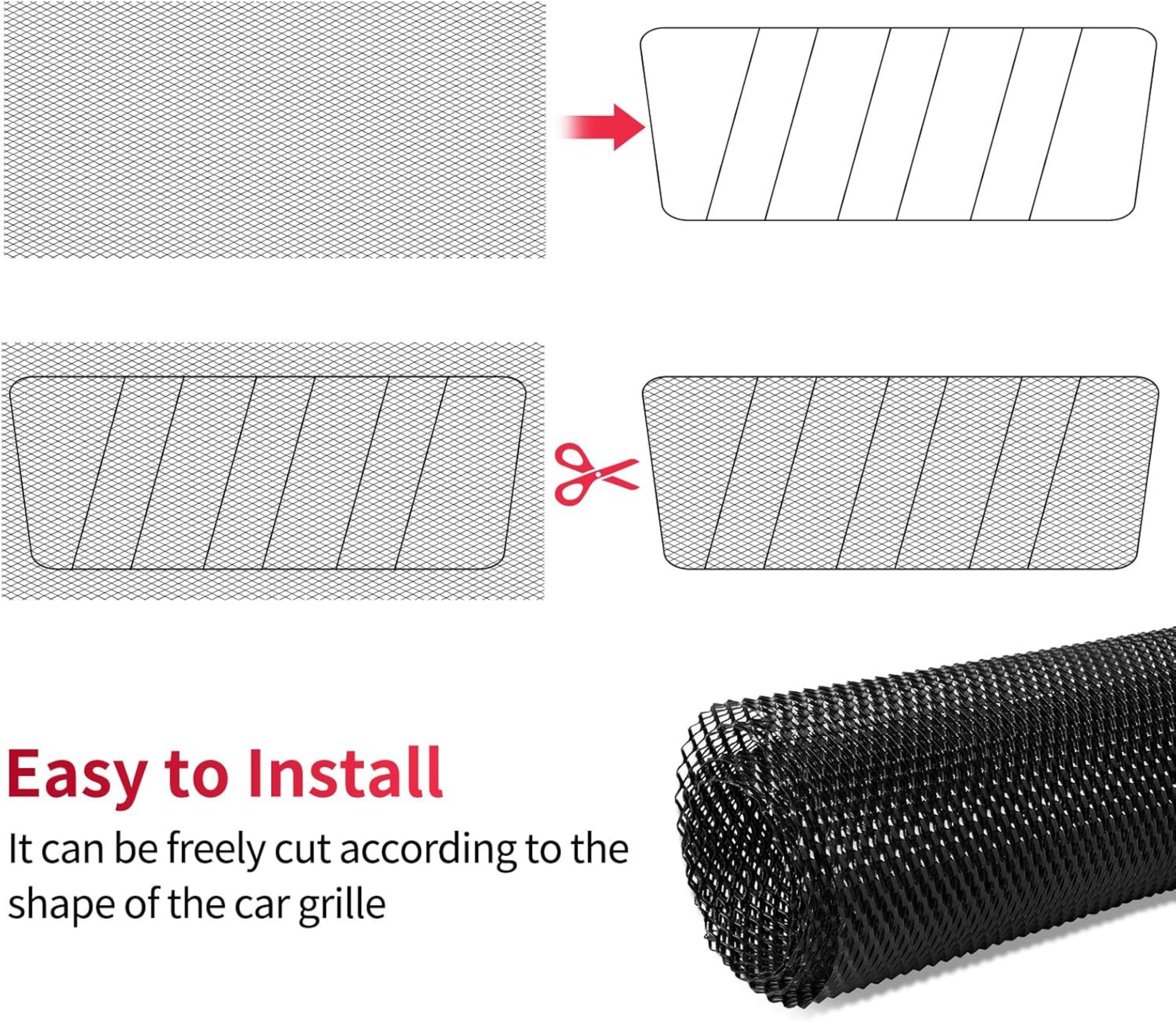 Premium Material: The car mesh grille honeycomb is made of aluminum, soft but durable, easy to cut and install.Dimension: The size of grill mesh is 40"x13", Each mesh grid size is 6mmx12mm/0.23inx0.47in,please ensure the size what you need before payment.Protection: The grille mesh sheet can prevent small items from damaging intercooler, radiator, and engine bay, such as road rocks, debris, garbage, leaves.Installation: You can install the car mesh grill on the place you need, like any bumper, body kit, mudguard, hood vent, vehicle opening, etc.(prepare cutting tools by yourself)Package Included: There are 1 black grille meshes in the package, the black color is Elegant black, definitely make your car look better.