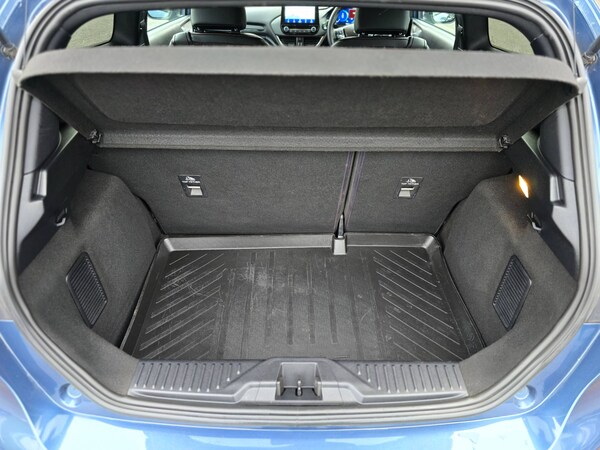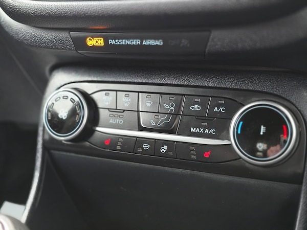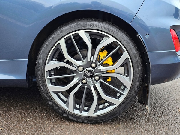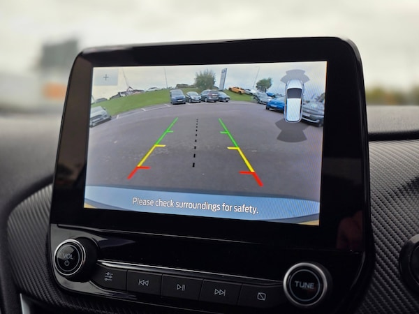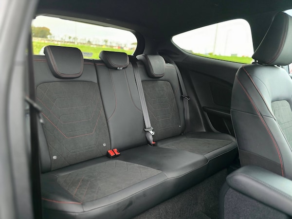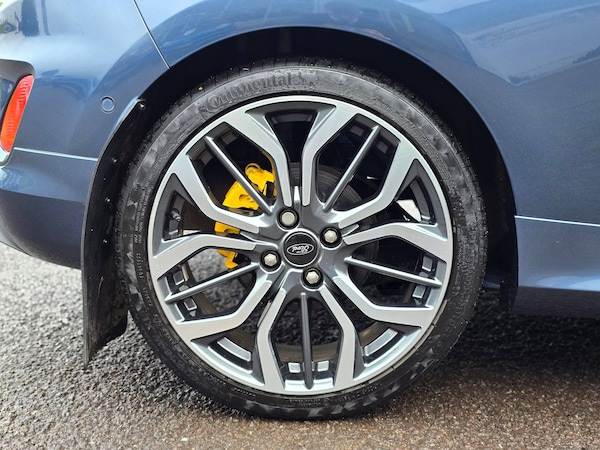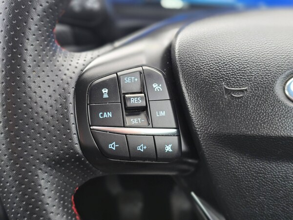 3 point seatbelts on all rear seats, Electronic stability control with hill start assist, Tyre pressure monitoring system, 12.3 inch Full digital cluster, Cruise control with adjustable speed limiter and intelligent speed assist, Driver alert system, Electric power steering, Ford easy fuel, Ford SYNC 3 Nav with DAB radio, 8 inch touch screen, voice control, emergency assist, Apple CarPlay/Android auto, 2x USB, 6 speaker, Ford pass connect, Rear parking distance sensors, Rear view camera, Selectable drive modes (Normal, Sport, Track), Speed sign recognition, Traffic sign recognition, Trip computer, Wrong way alert, Auto high beam, Body colour bumpers, Body colour large rear spoiler, Body coloured electrically operated with side indicators, Electric front windows/one touch facility, Front unique ST scuff plates, LED headlights with LED daytime running light and integrated fog light, LED Night signature to rear lights, LED third brake light, Quickclear heated windscreen, Rain sensing wipers and auto dimming rear view mirror, Rear privacy glass, Rear wiper, Solid paint, Unique ST-Line upper grille and full bodystyling kit with ST-Line wing badges, 3 seat bench in 2nd row, 4 way manually adjustable passenger seat, Adjustable head restraints, Black headlining, Centre console with opening armrest, 2x cupholders, 12v and USB, Drivers and Passenger lumbar support, EATC - Electronic Auto Temperature control, Front floor mats in velour, Leather gaiter, LED ambient lighting, Manual 4-way driver seat adjust, Sensico partial premium leather upholstery with red stitching, Sensico wrapped steering wheel, Single front passenger seat, NCAP Pack - Fiesta, Winter pack [GTBAB]- Fiesta, Sports suspension, Ford keyfree system with Keyless entry and keyless start, MyKey system, Remote central locking, Thatcham alarm with power door dead locks, 6 speakers, 18 inch 5x2 spoke alloys with pearl grey machined finish, Tyre repair kit
