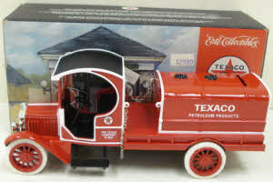 This is an Ertl 19542V 1919 Texaco GMC Tanker Truck. Features include die-cast metal construction, locking coin bank, 1/28th scale, realistic detail, and real rubber tires. It measures approximately 6 inches long.
