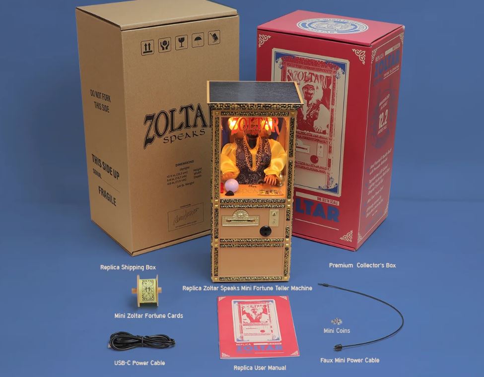 We are proud to present our Zoltar Miniature Fortune Teller Machine. Our Zoltar Speaks Mini Replica includes all the same details and features as the full-size, famous animatronic fortune teller found in arcades, theme parks, gift shops, homes, and various attractions all around the world, but at a fraction of the size & cost. LOOKS, SOUNDS, and WORKS like the World Famous Zoltar Speaks Fortune Teller Machine!