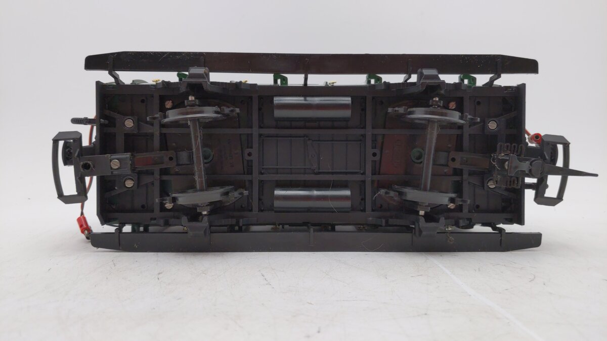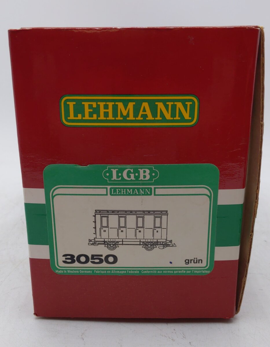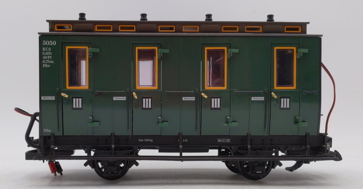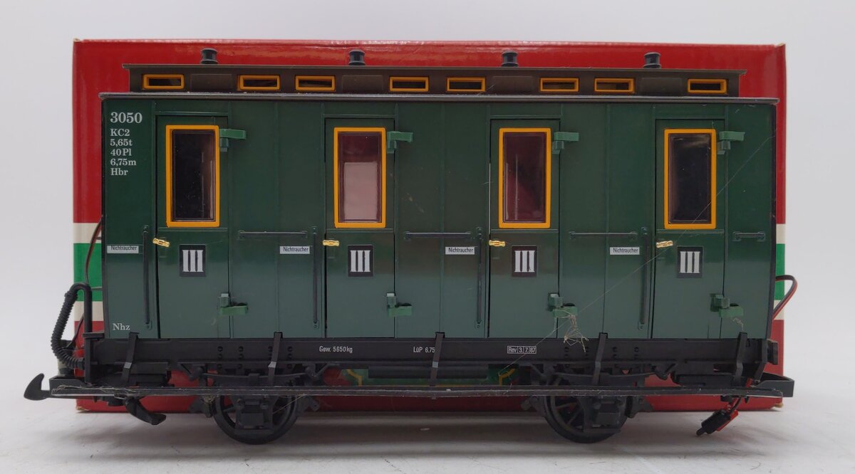 This is an LGB 3050 G Scale European 4-wheel Illuminated Passenger Car. Features include opening doors, plastic trucks, plastic latch couplers, and plastic wheels and axles. It measures approximately 9 1/2 inches in length.