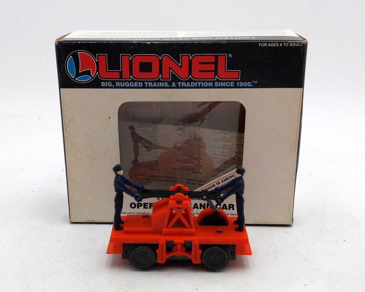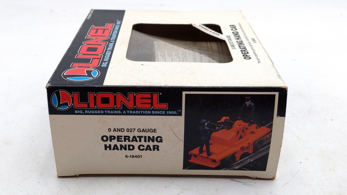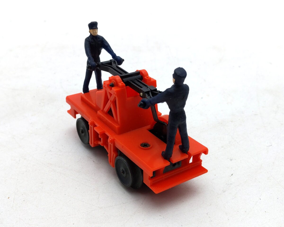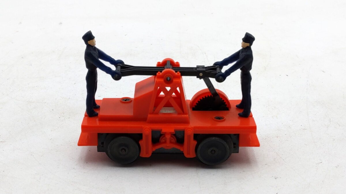 This is a Lionel 6-18401 O Gauge Operating Workmen Hand Car from 1987-88. As it moves down the track the two figures pump the handle up and down as if they are actually powering it around the track. It measures 4 inches long.
