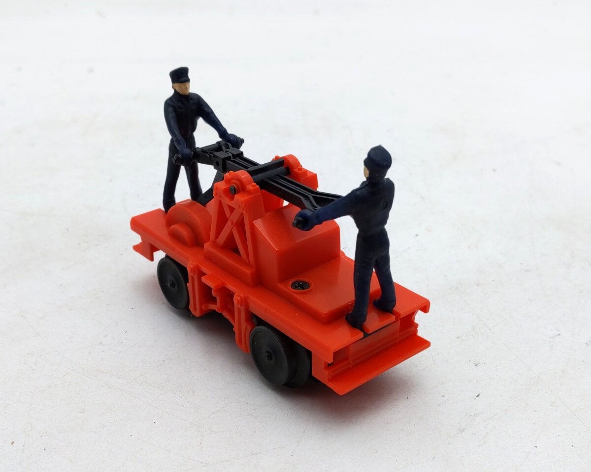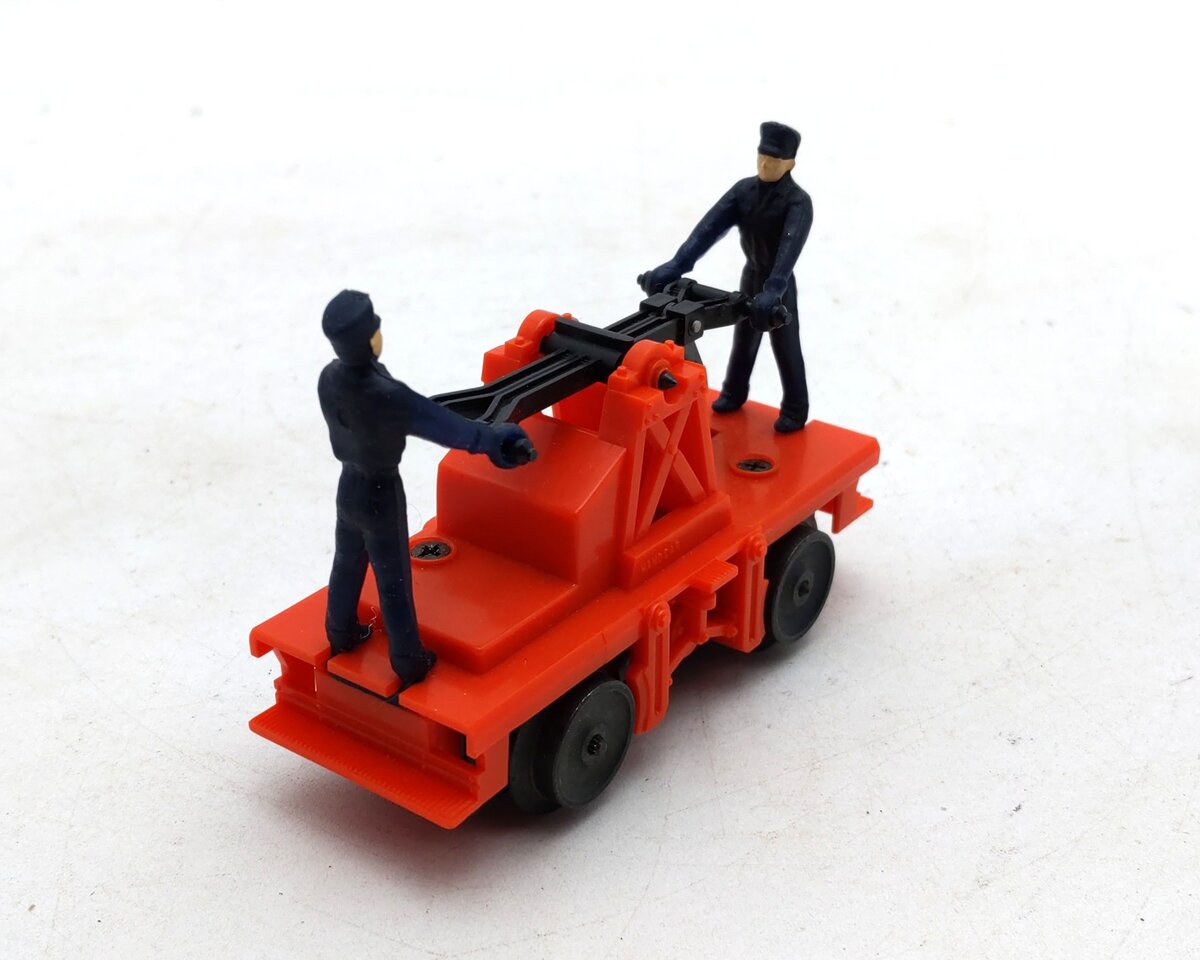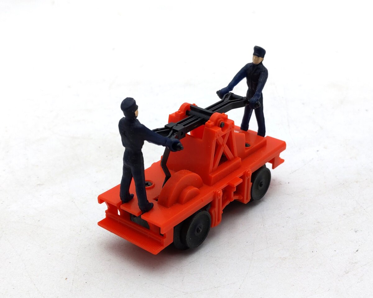 This is a Lionel 6-18401 O Gauge Operating Workmen Hand Car from 1987-88. As it moves down the track the two figures pump the handle up and down as if they are actually powering it around the track. It measures 4 inches long.