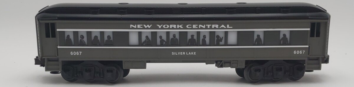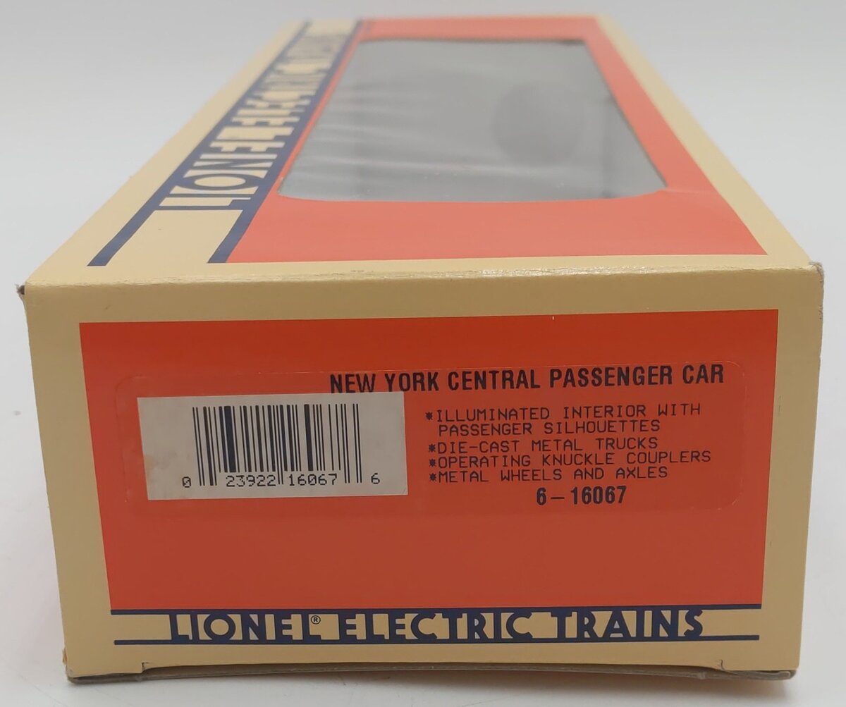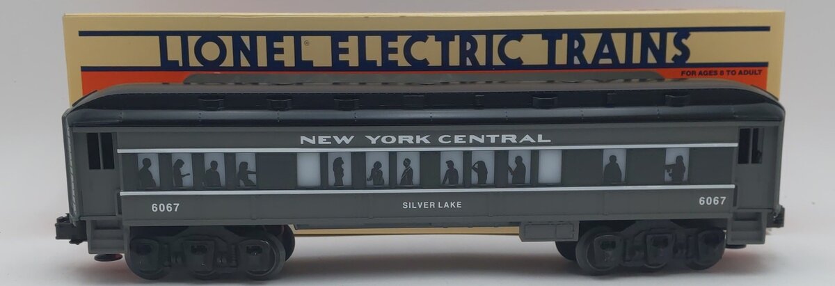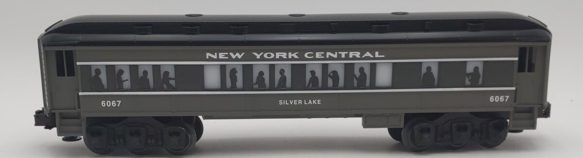 This is a Lionel 16067 NYC "Silver Lake" Passenger Car from 1994. It features s durable ABS body, an illuminated interior with passenger silhouetted windows, die-cast trucks with operating metal couplers and it measures 12 inches long.