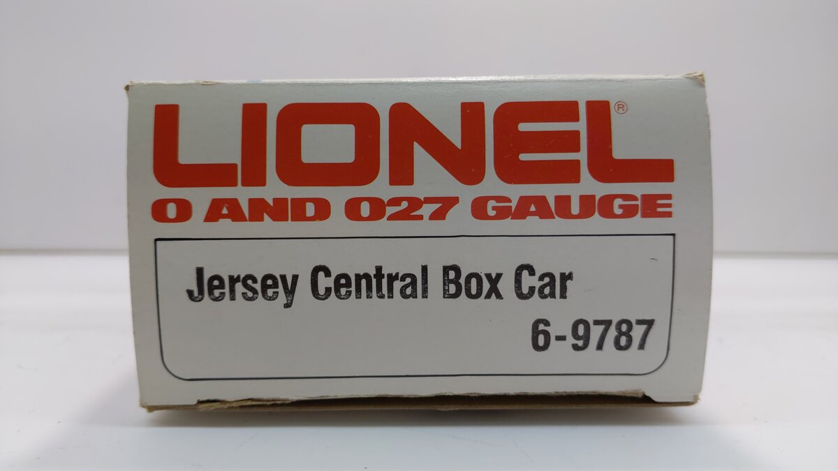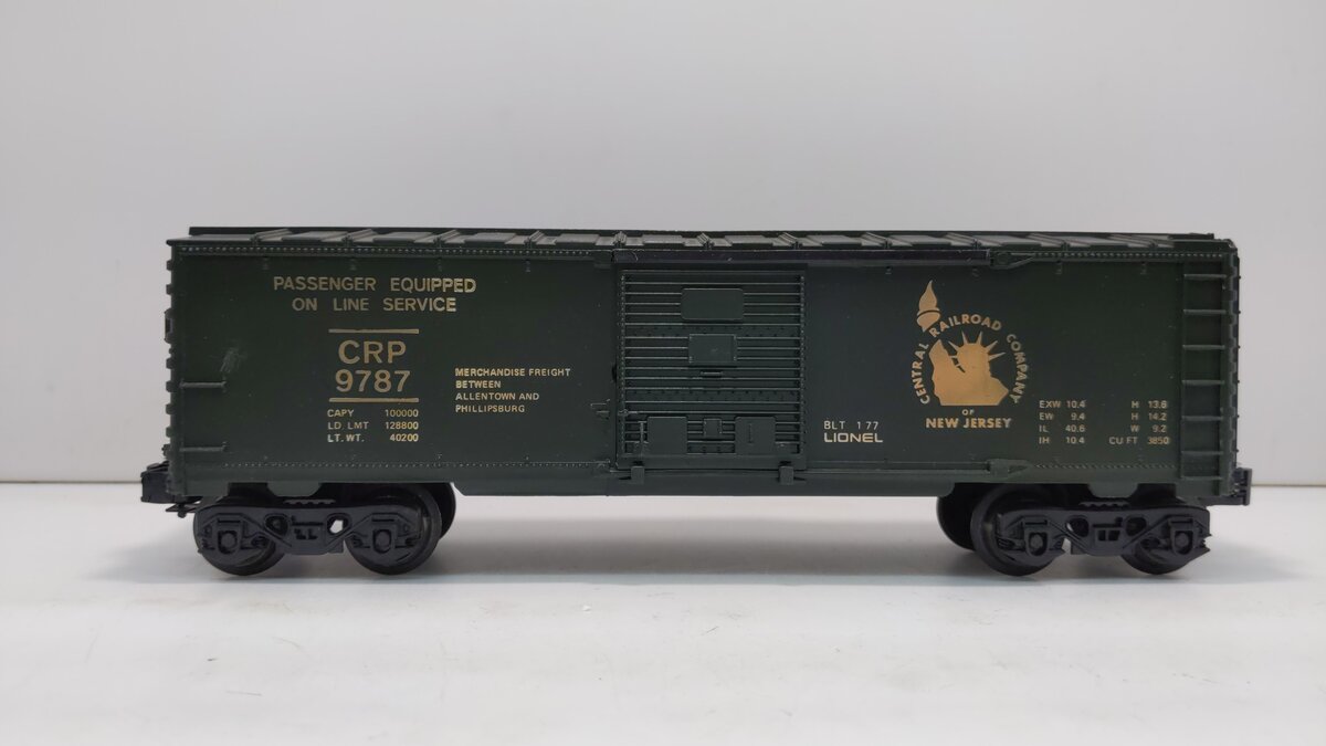 This is a Lionel 6-9787 O Gauge Central of New Jersey Box Car from 1977-79. This car features die-cast metal sprung trucks, metal wheels and axles, and operating knuckle couplers.