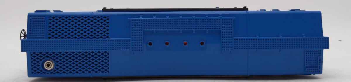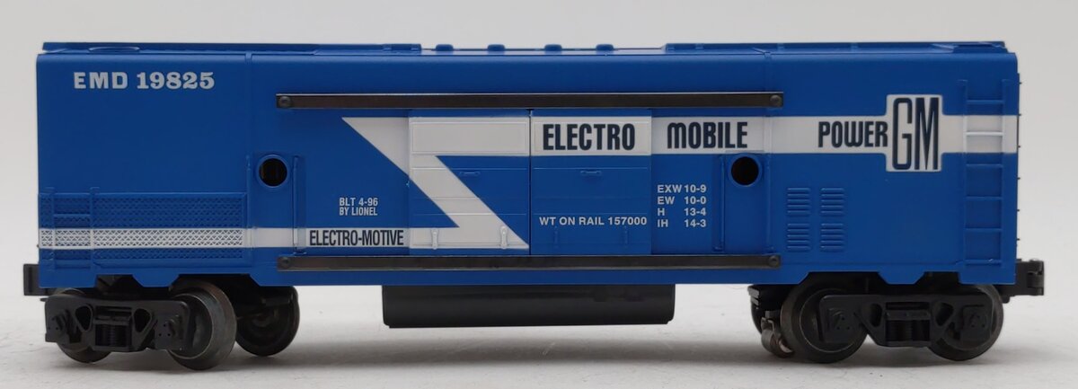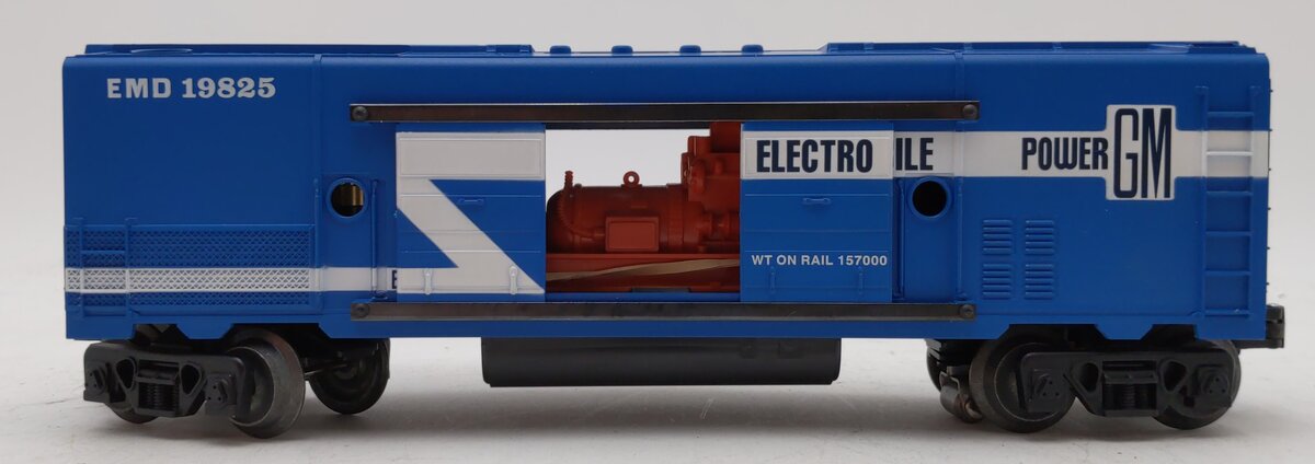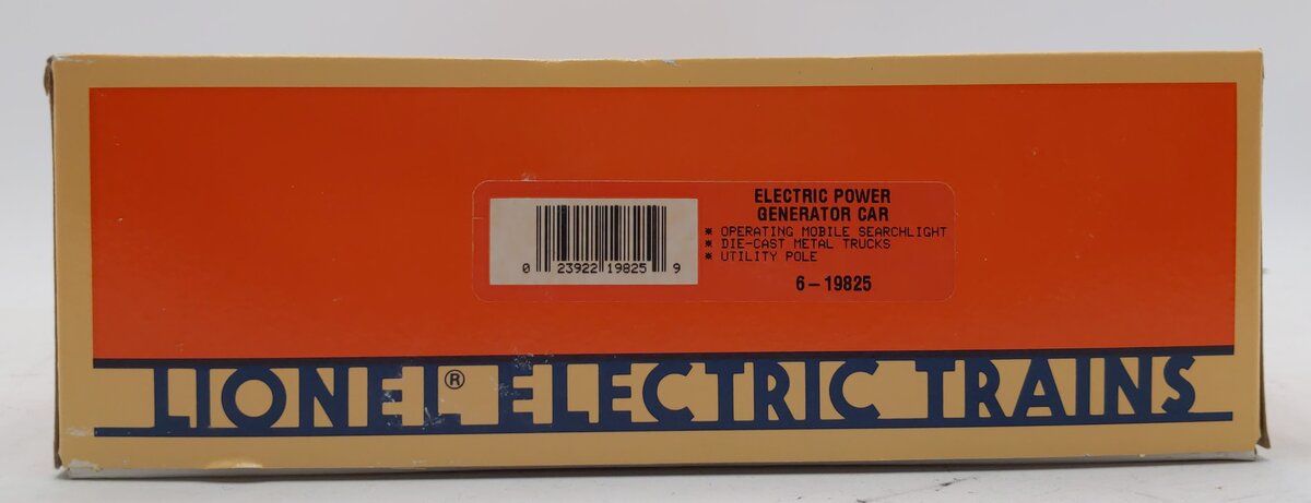 This is a Lionel 6-19825 O Gauge EMD Electric Power Generator Car #19825 from 1996. This car is a reissue of the Lionel postwar 3530 car, and it includes an operating mobile searchlight and a utility pole. The searchlight can be plugged into the car and lit up. This generator car features sliding doors, die-cast metal trucks, die-cast metal operating knuckle couplers, metal wheels and axles.