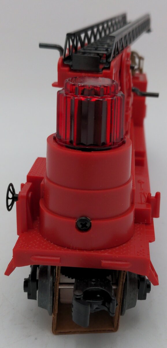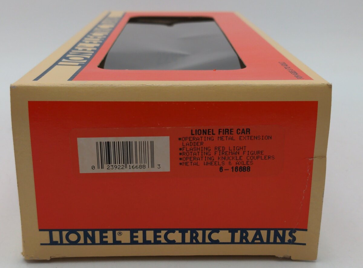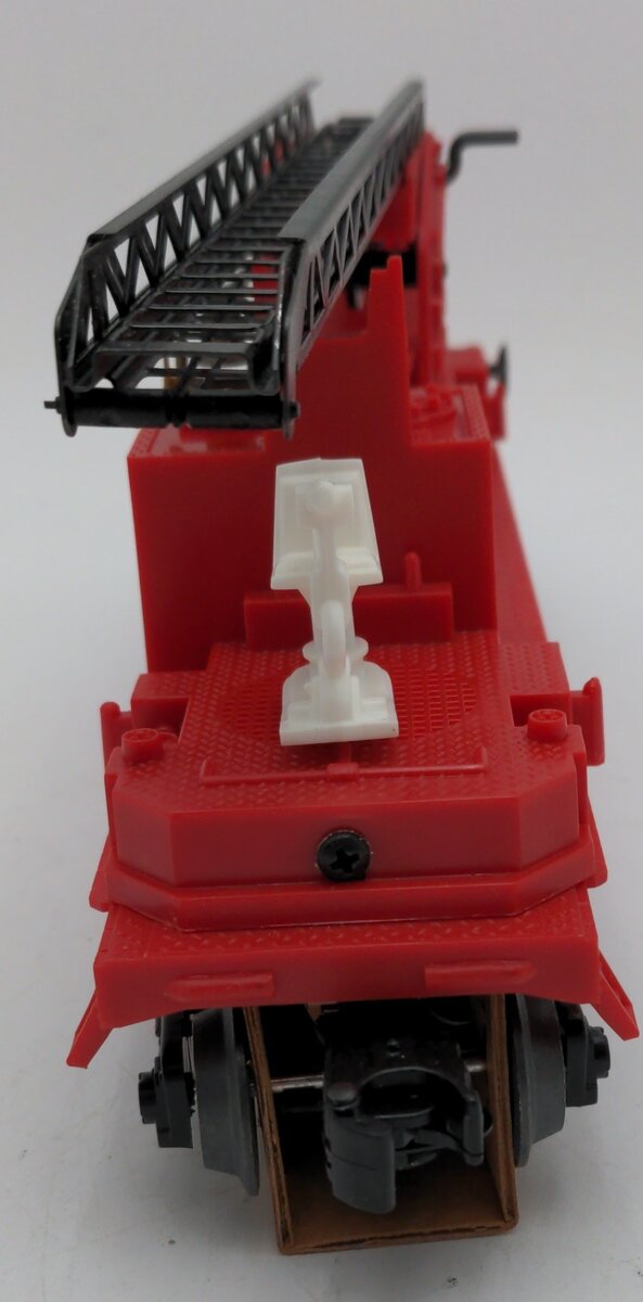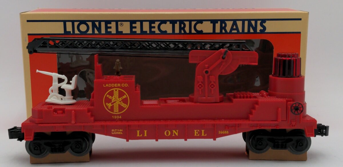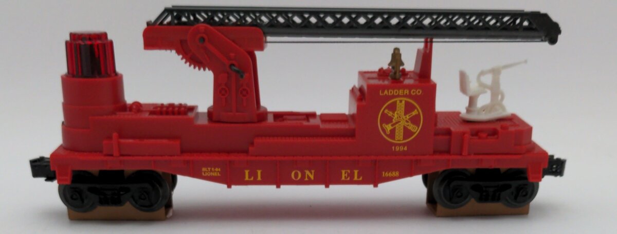 Here is a Lionel 6-16688 O Gauge Red Operating Fire Ladder Car. This car is a reissue of the Lionel 3512 from the late 1950s. It features a telescoping ladder that also swivels, a fireman on a seat that rotates back and forth as the car rolls down the track, the red light also shines back and forth as the cars rolls down the track as well. This car features plastic trucks, operating knuckle couplers, metal wheels and axles.