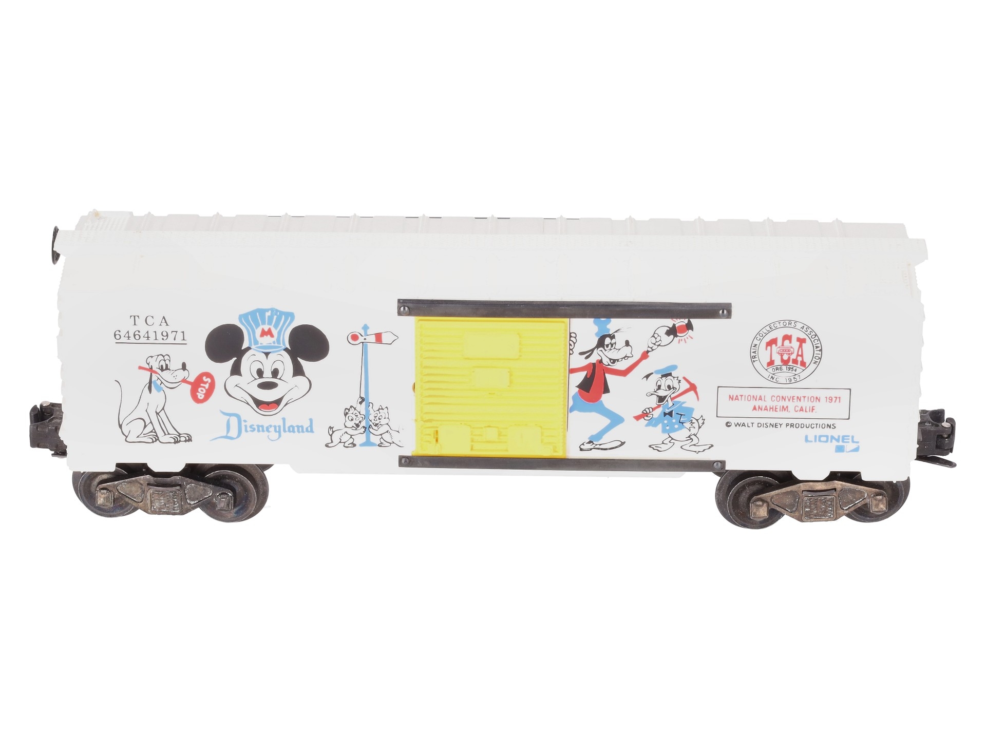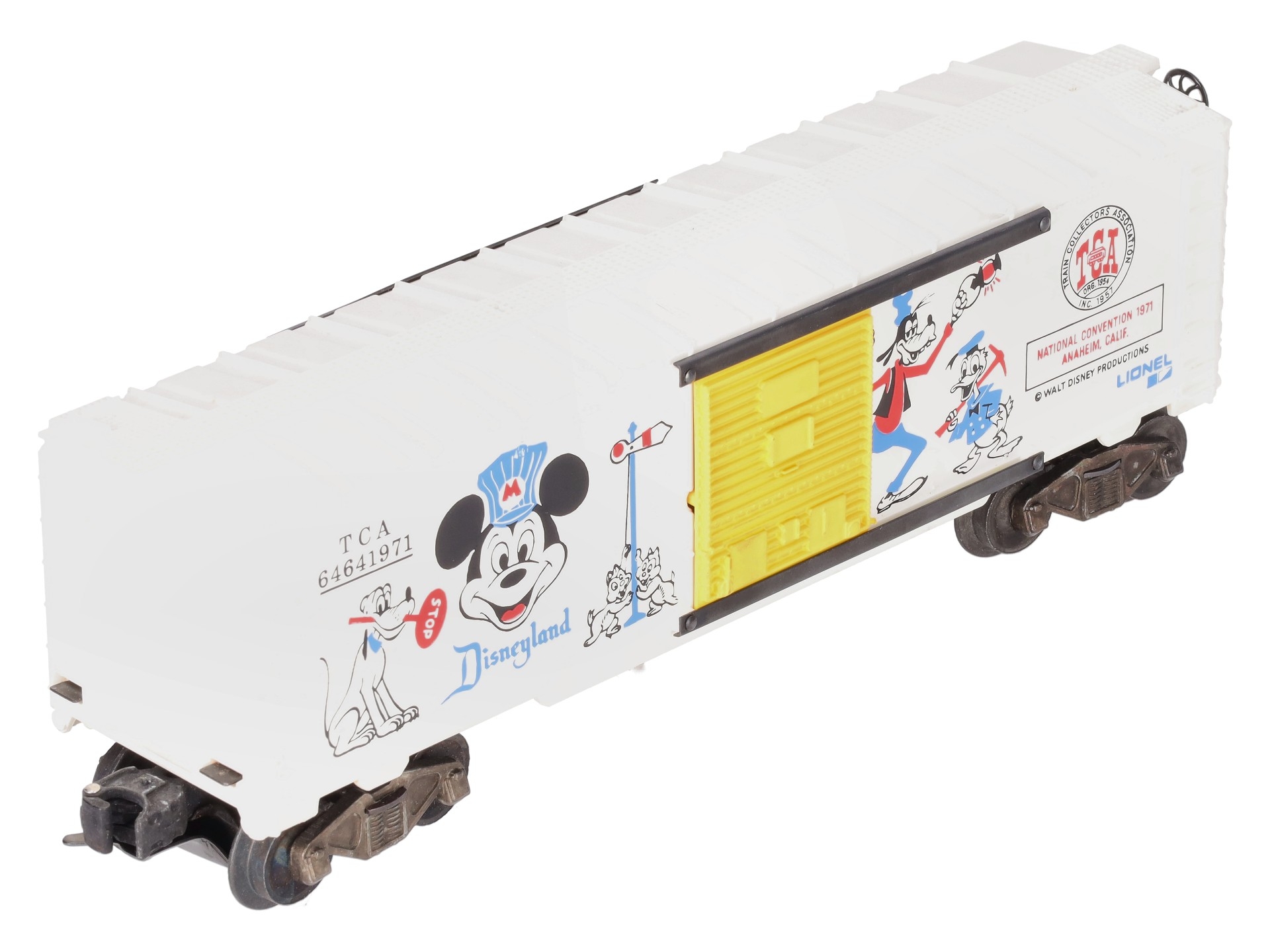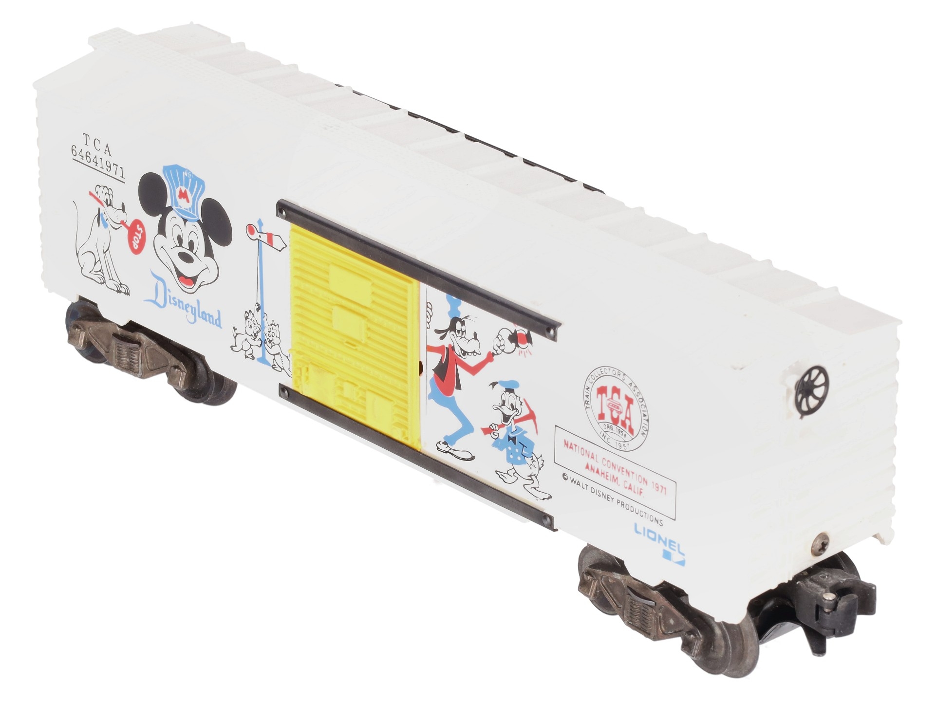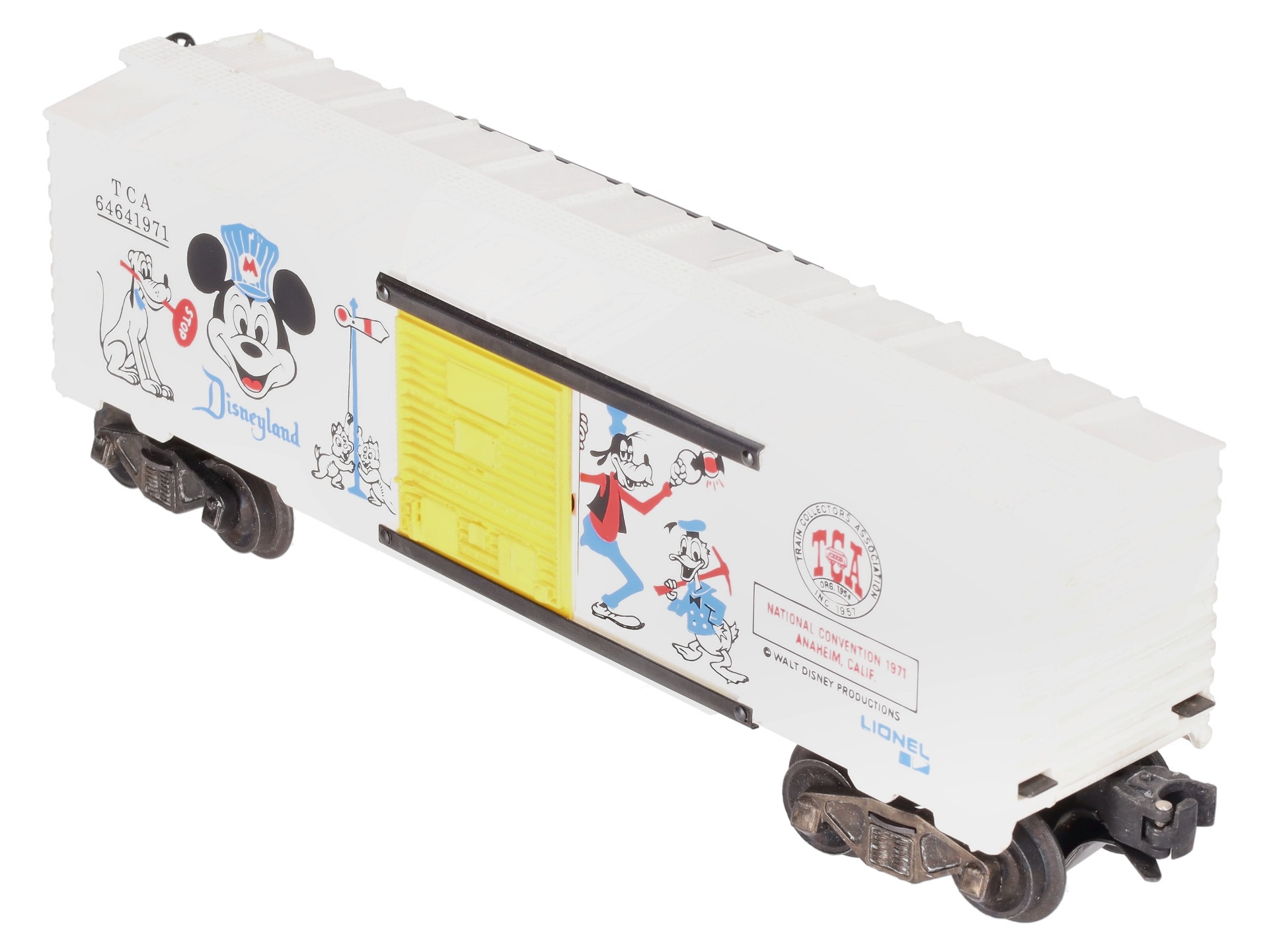 Here is a Lionel 6464-1971 O Vintage TCA Anaheim Disneyland Box Car. This boxcar features a plastic body, die-cast trucks, metal wheels, and operating metal knuckle couplers.