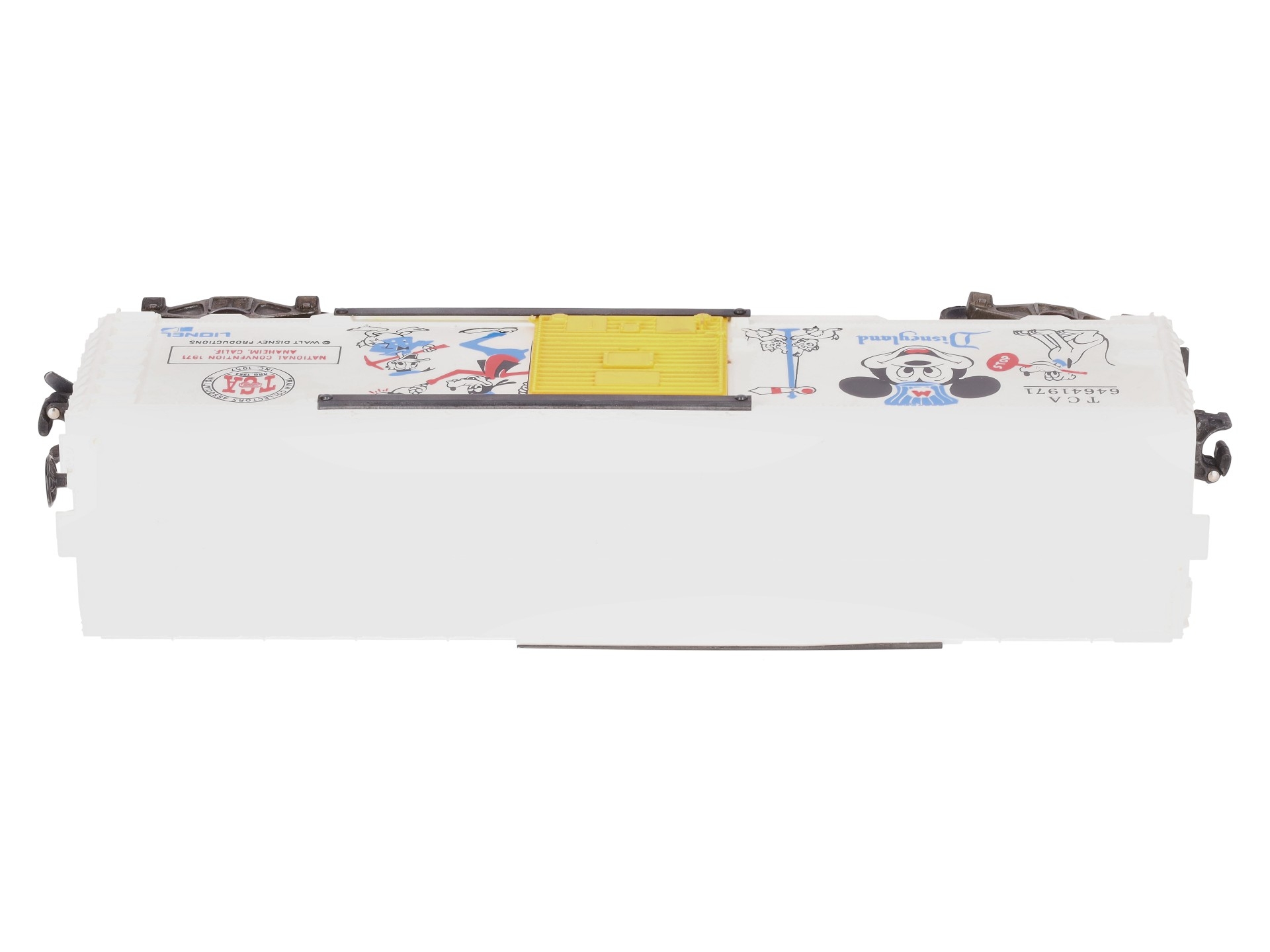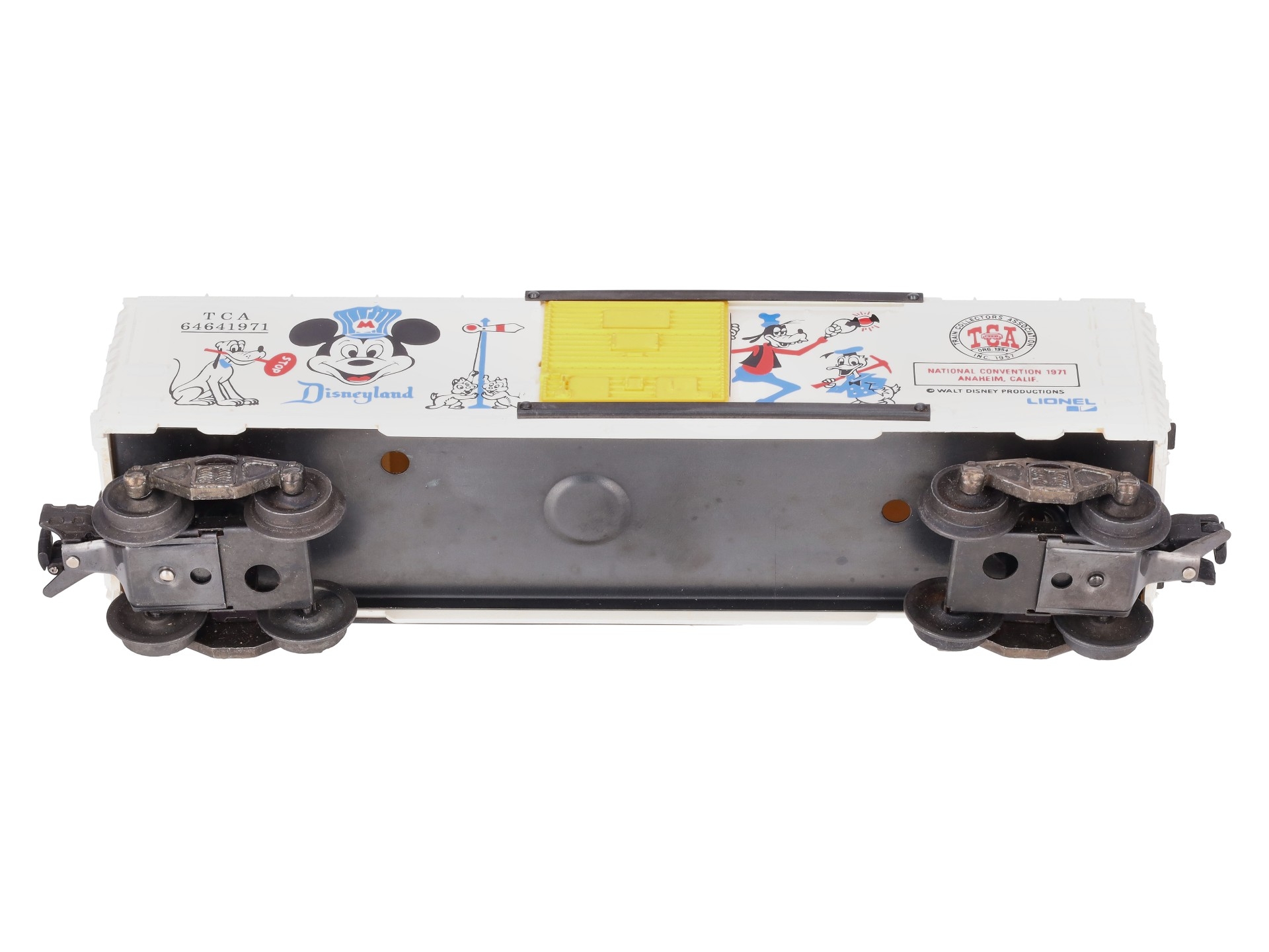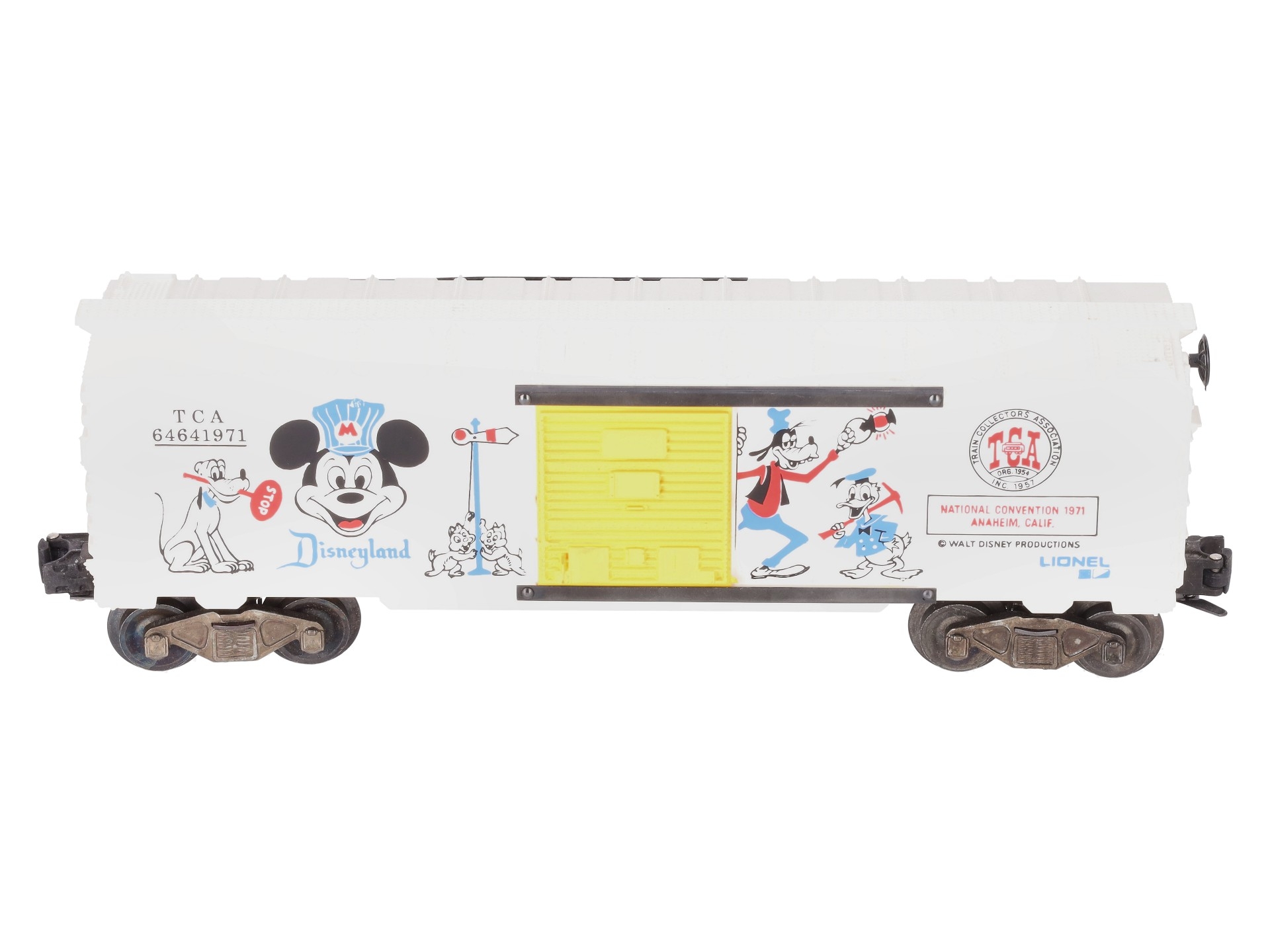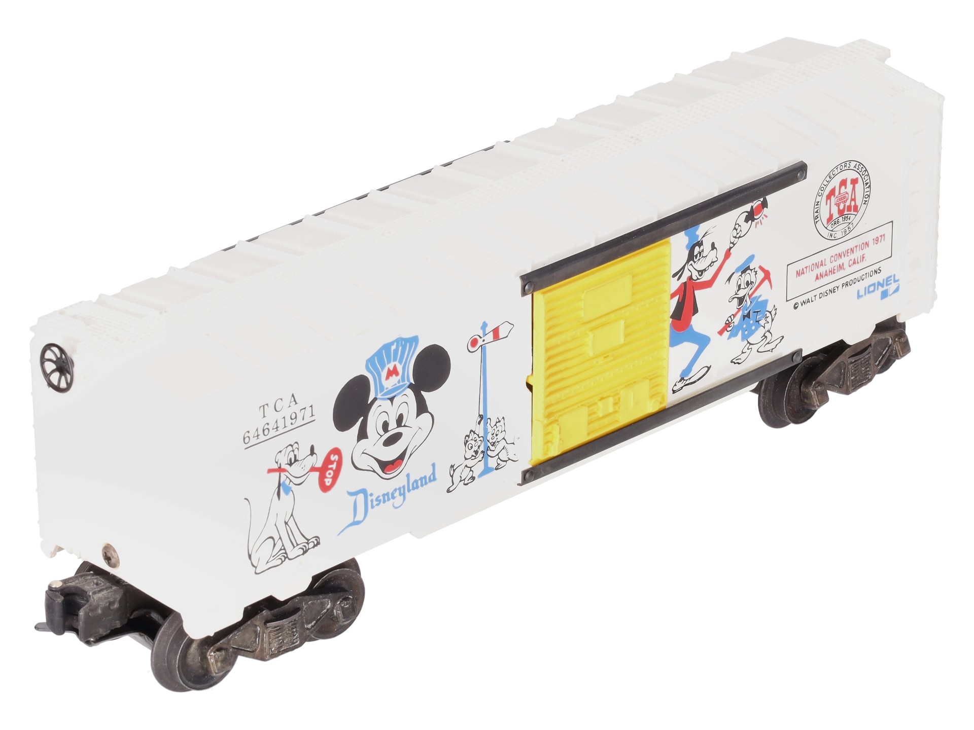 Here is a Lionel 6464-1971 O Vintage TCA Anaheim Disneyland Box Car. This boxcar features a plastic body, die-cast trucks, metal wheels, and operating metal knuckle couplers.