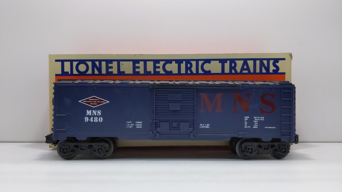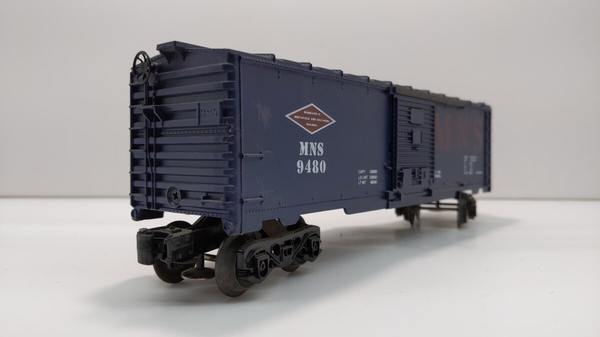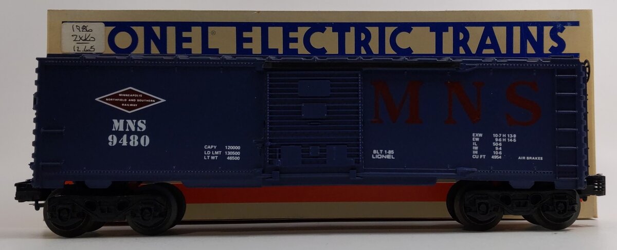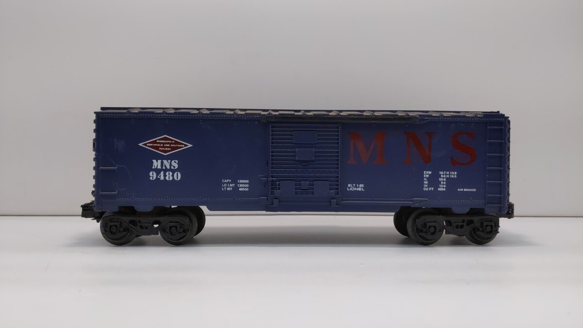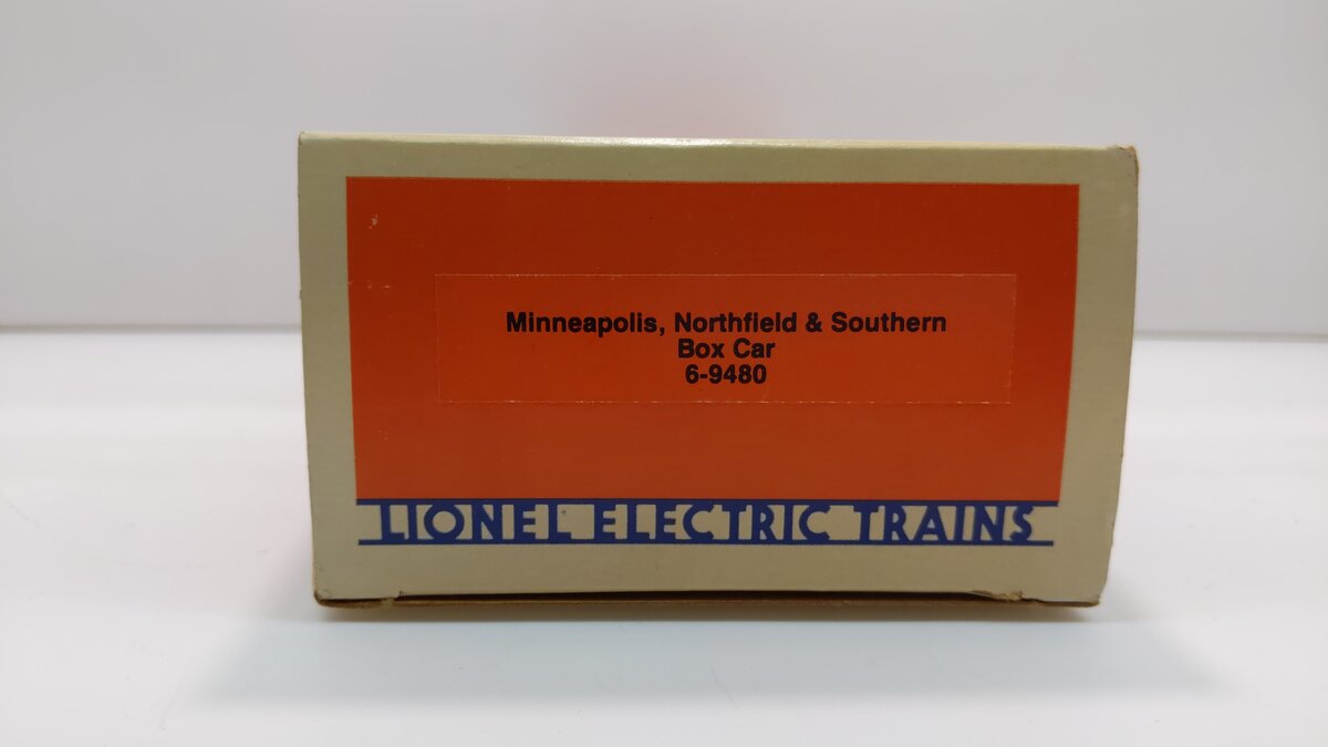 Here is a Lionel 6-9480 O Gauge Minneapolis, Northfield, & Southern Box Car #9480 from 1985. This car features sliding doors, plastic trucks, operating knuckle couplers, metal wheels and axles.