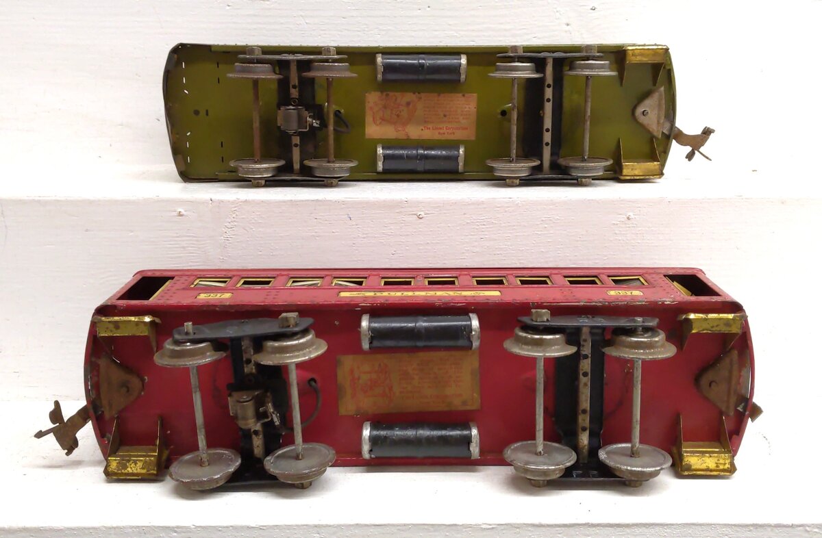 Here is a Lionel Vintage Standard Gauge Passenger Cars: 338, 337 [2]. These cars feature a metal construction, metal trucks, metal wheels and axles, and latch couplers.