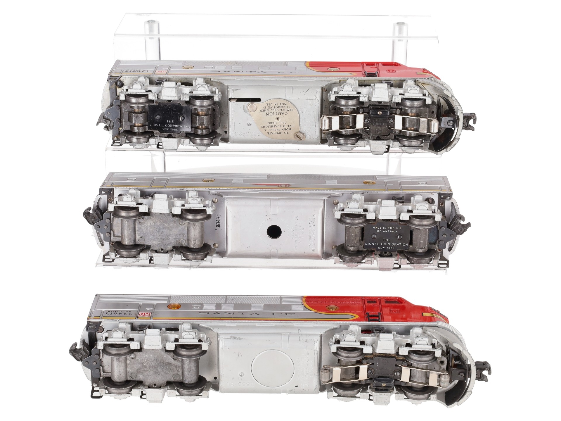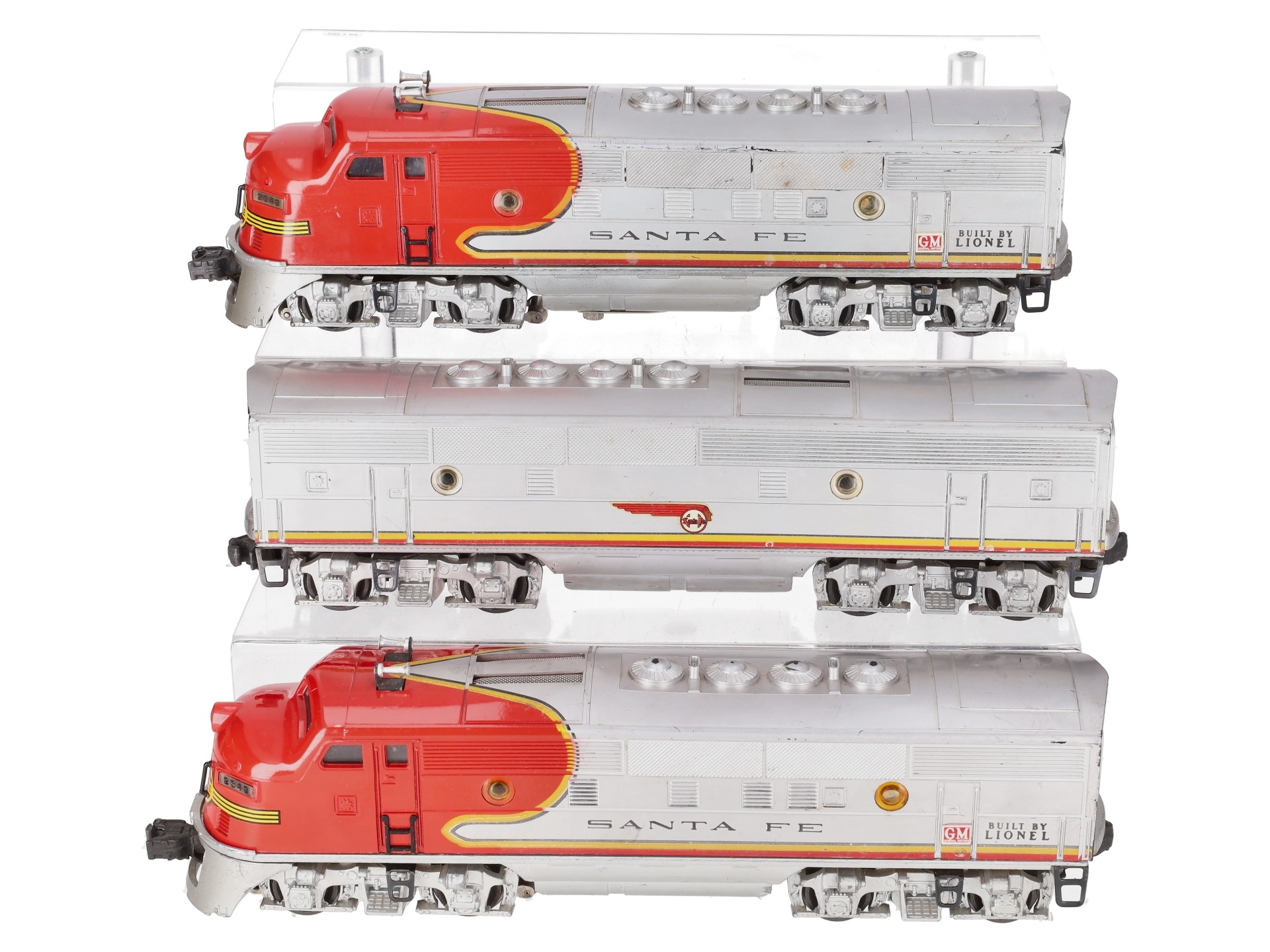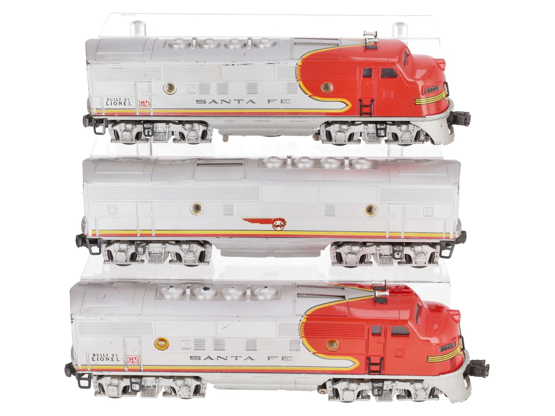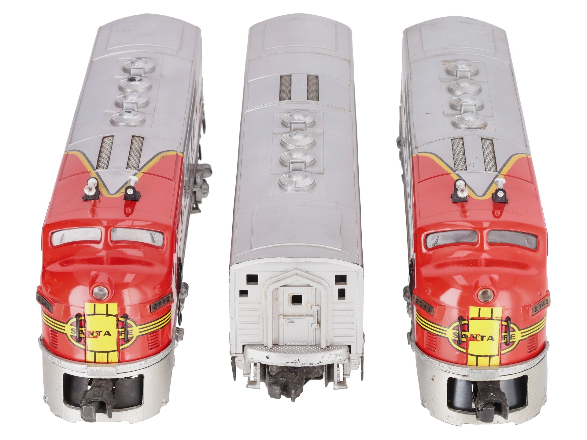This is a Lionel 2343 Vintage O Santa Fe F3 ABA Diesel Locomotive Set from 1950-1952. One of the icons of the Postwar Era, the 2343 improved upon the original 2333 with the addition of Magnetraction. The powered unit features dual motors, a remote activated operating horn, an operating headlight, illuminated number boards and cab, die-cast metal frame and trucks, a die-cast operating coupler on the front and a fixed die-cast coupler on the rear. The non-powered unit features an operating light, a die-cast frame, trucks, metal wheels & axles. This set also includes the 2343C B Unit with a screen top.