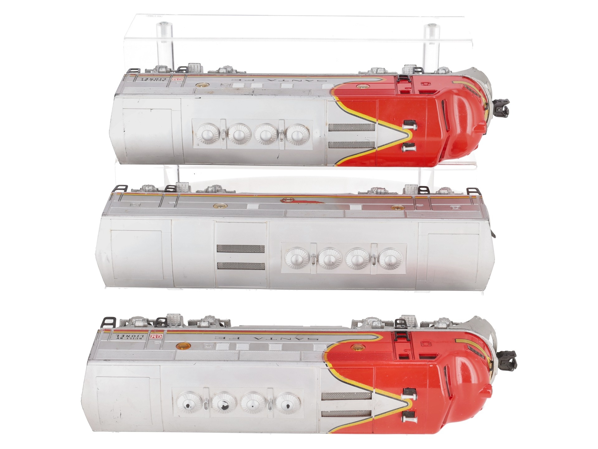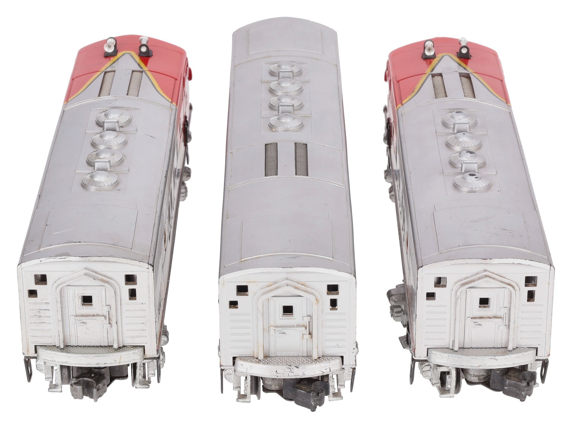 This item has been graded per TCA standards C-6: Very Good based on visual appearance. The horn was not tested due to heavy corossion on the battery contact. Each locomotive shows yellowed port-hole windows. Each locomotive shows flaked nose decals. Each locomotive shows scratches and paint loss throughout various sections of the shell and chassis. Each locomotive shows rust on the chassis and trucks. The instruction manual is not included. The original box is not included. Please check the photos for a detailed look at this item. Overall condition is Very Good.
