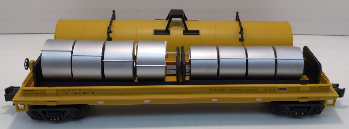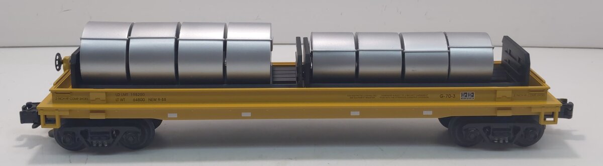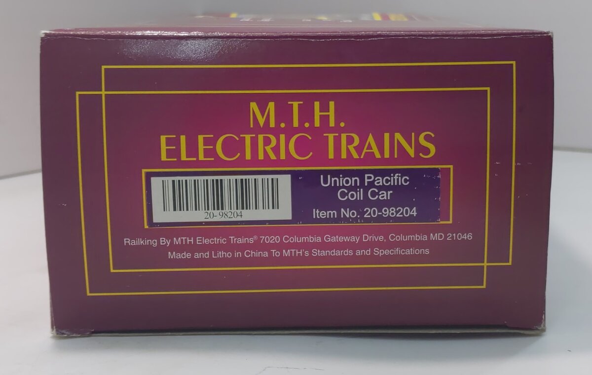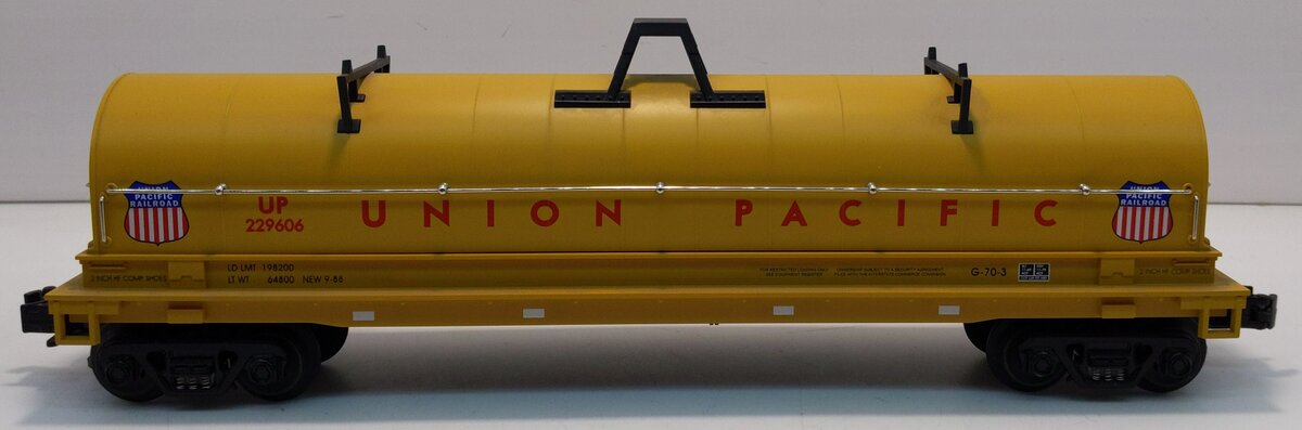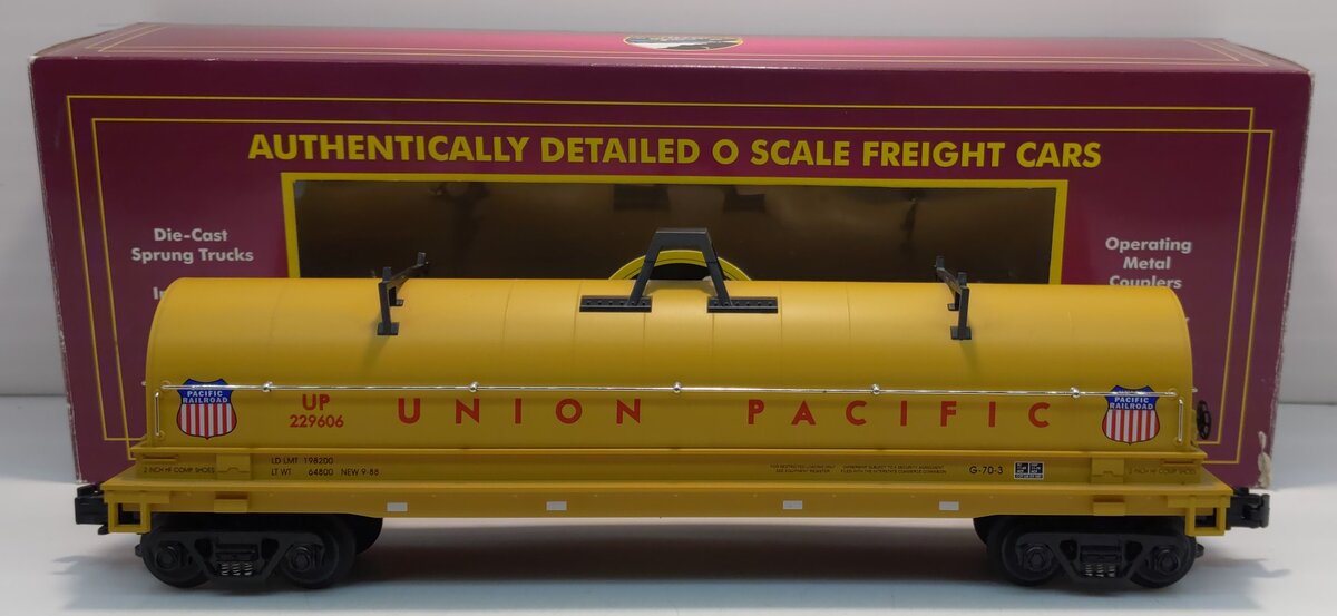 Here is a MTH 20-98204 O Gauge Union Pacific Steel Coil Car w/Cover #229606. This car features die-cast metal sprung trucks, die-cast metal operating knuckle couplers, and metal wheels and axles. It is from MTH's Premier Line and is scale length.