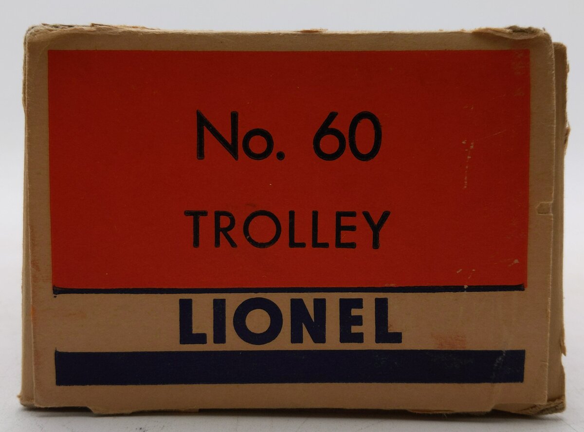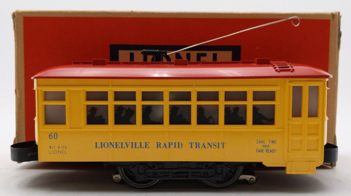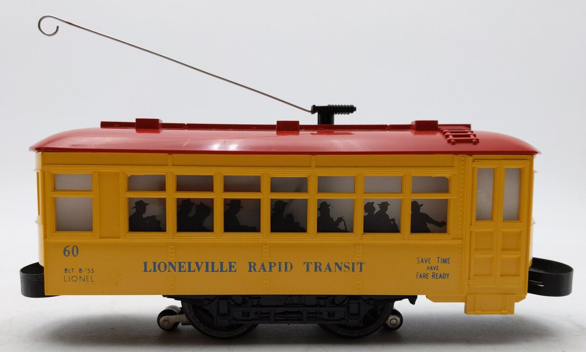 This is a Lionel 60 Vintage O Lionelville Motorized Rapid Transit Trolley from 1955-58. This trolly car features bumpers on each end that cause it to change directions whenever it runs into anything, like a bumper. It features interior illumination, a reverse unit, operating function, silhouetted window strips, and metal wheels and axles. Something to note is that when the direction of the trolley changes, the trolley pole on top also spins around to the proper trailing position. It was a real postwar favorite, and Lionel has remade it in several varieties over the years..