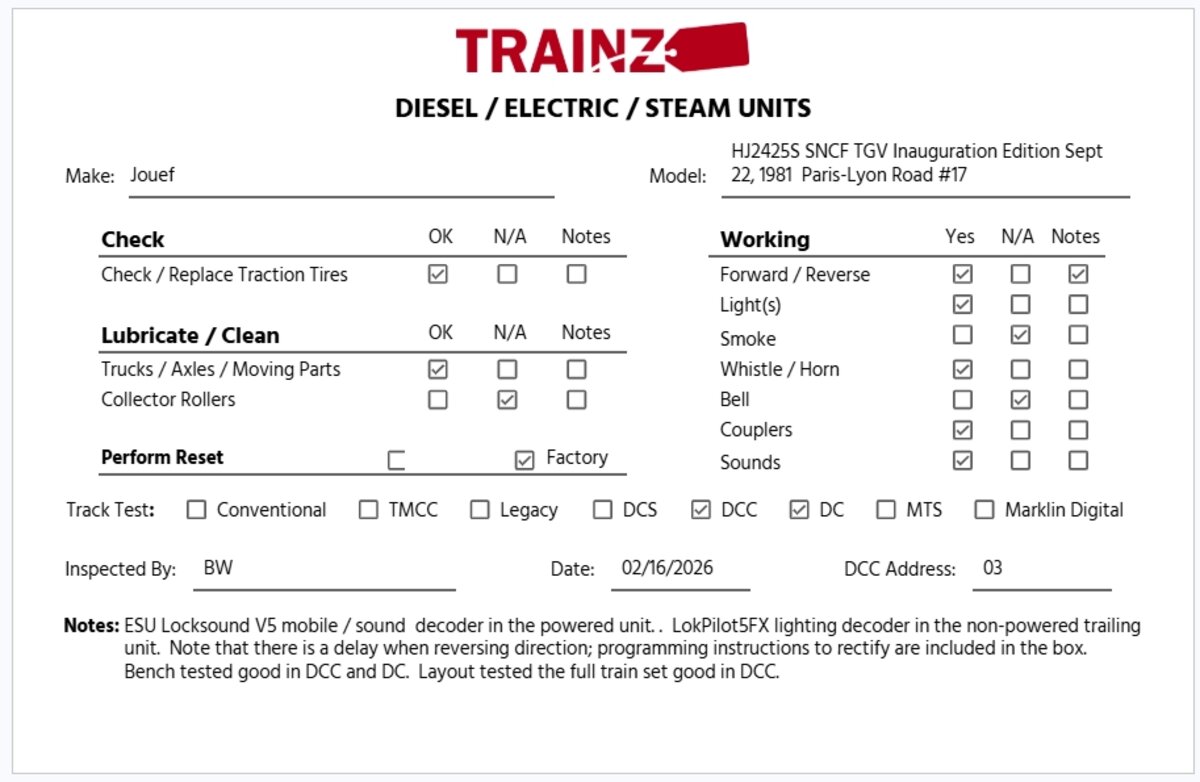 This item has been graded per TCA standards C-7: Excellent based on visual appearance. The locomotive shows a slight delay when reversing. The powered locomotive has pieces broken off of the pantograph. This item has been inspected by our repair shop. Please see the attached picture for inspection details and additional operation information. The instruction manual is included. The original box is included. Please check the photos for a detailed look at this item. Overall condition is Excellent.