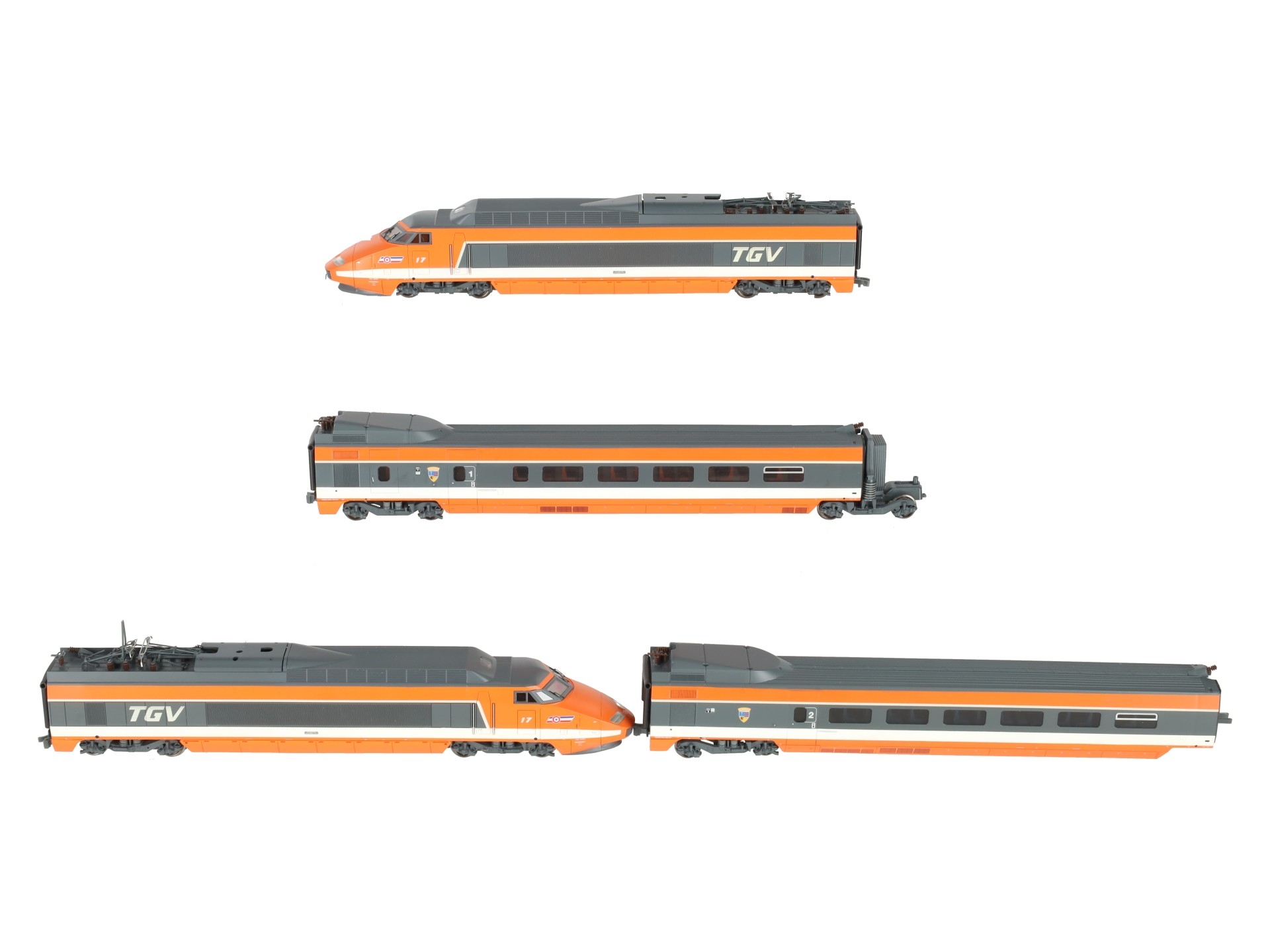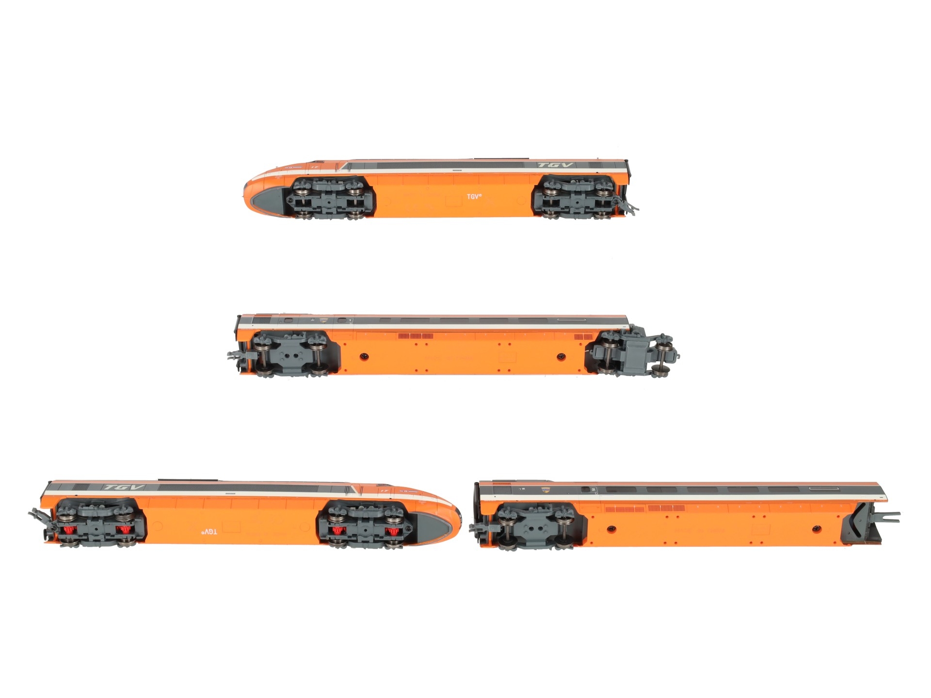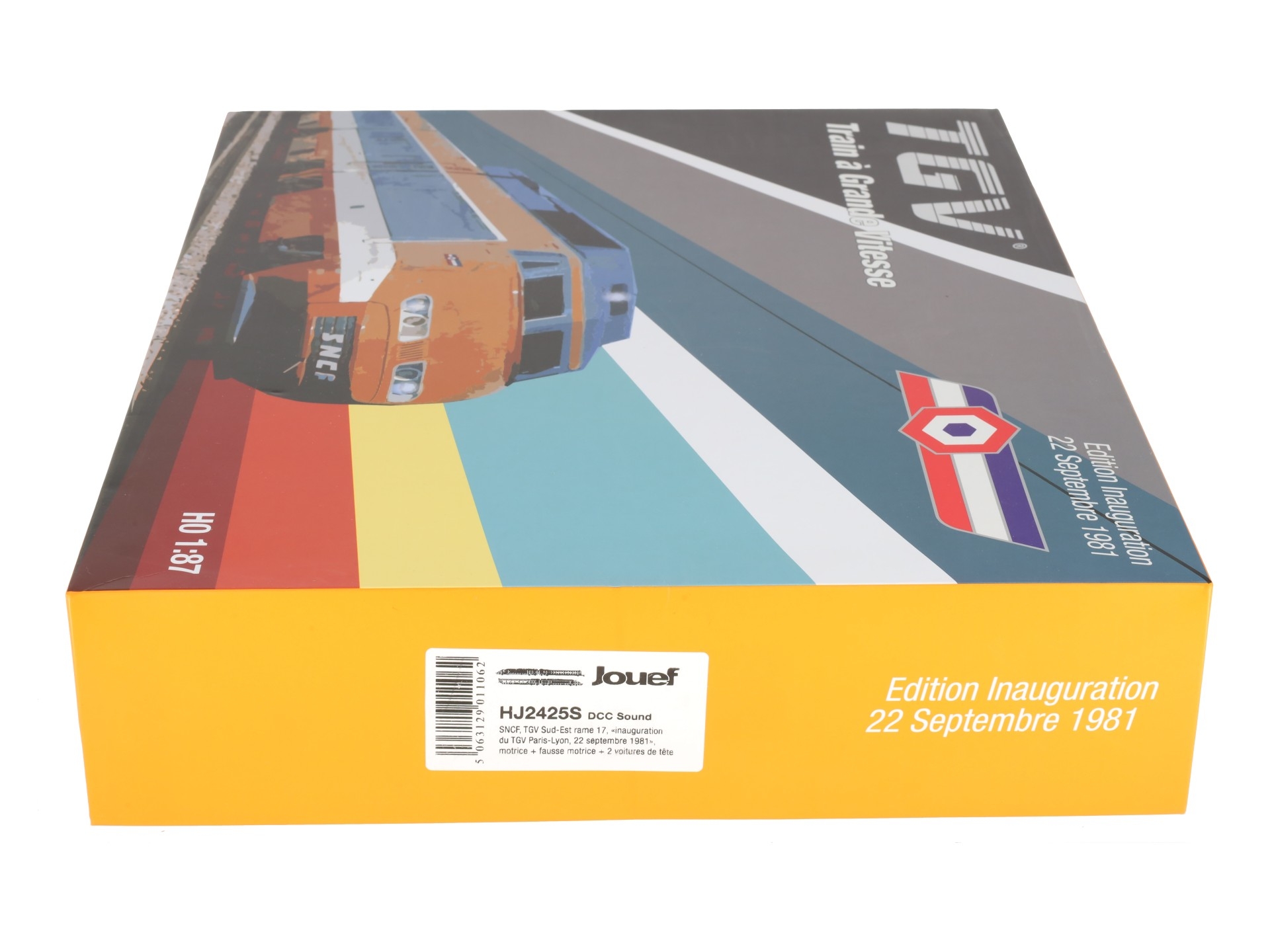 Here is a Jouef HJ2425S HO TGV Inauguration Edition Electric Passenger 4-Unit Set. This set includes [1] powered locomotive, [1] non-powered locomotive, and [2] passengre cars. Each car features plastic construction, plastic trucks, metal wheels and axles, and fleischmann couplers.