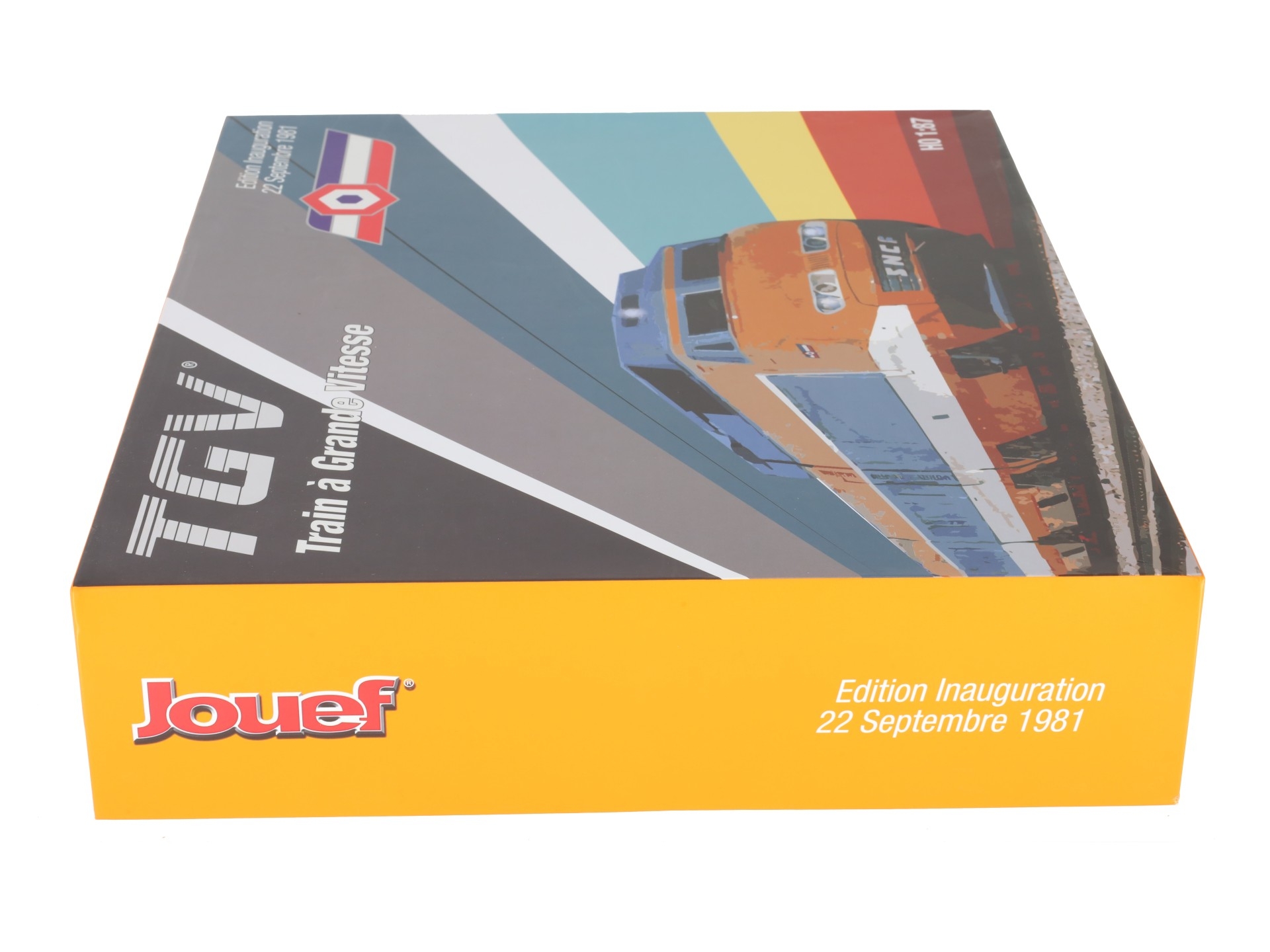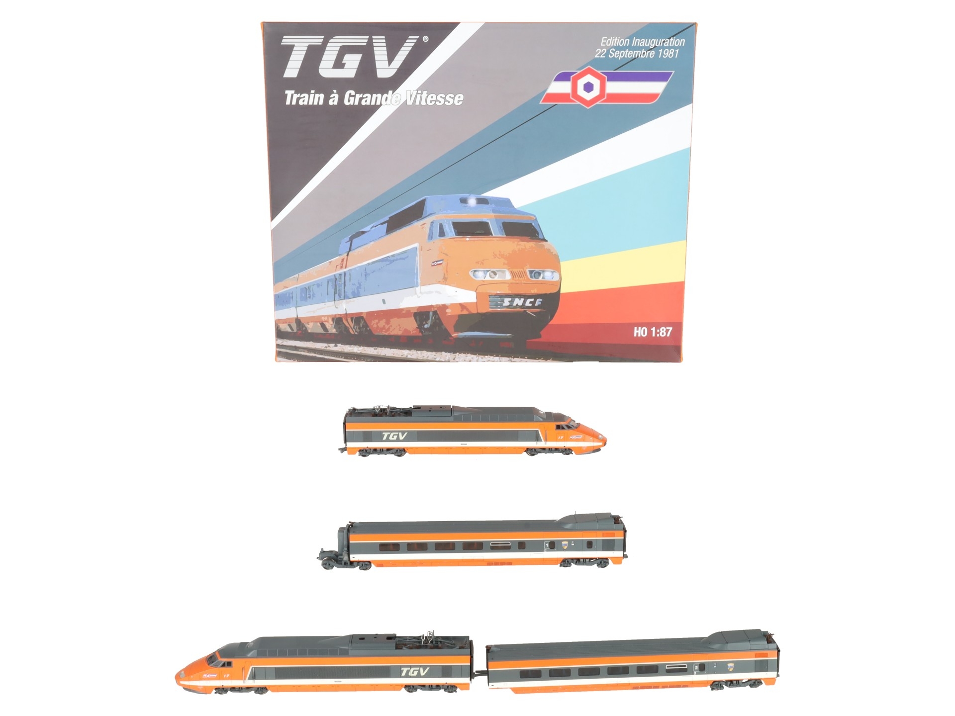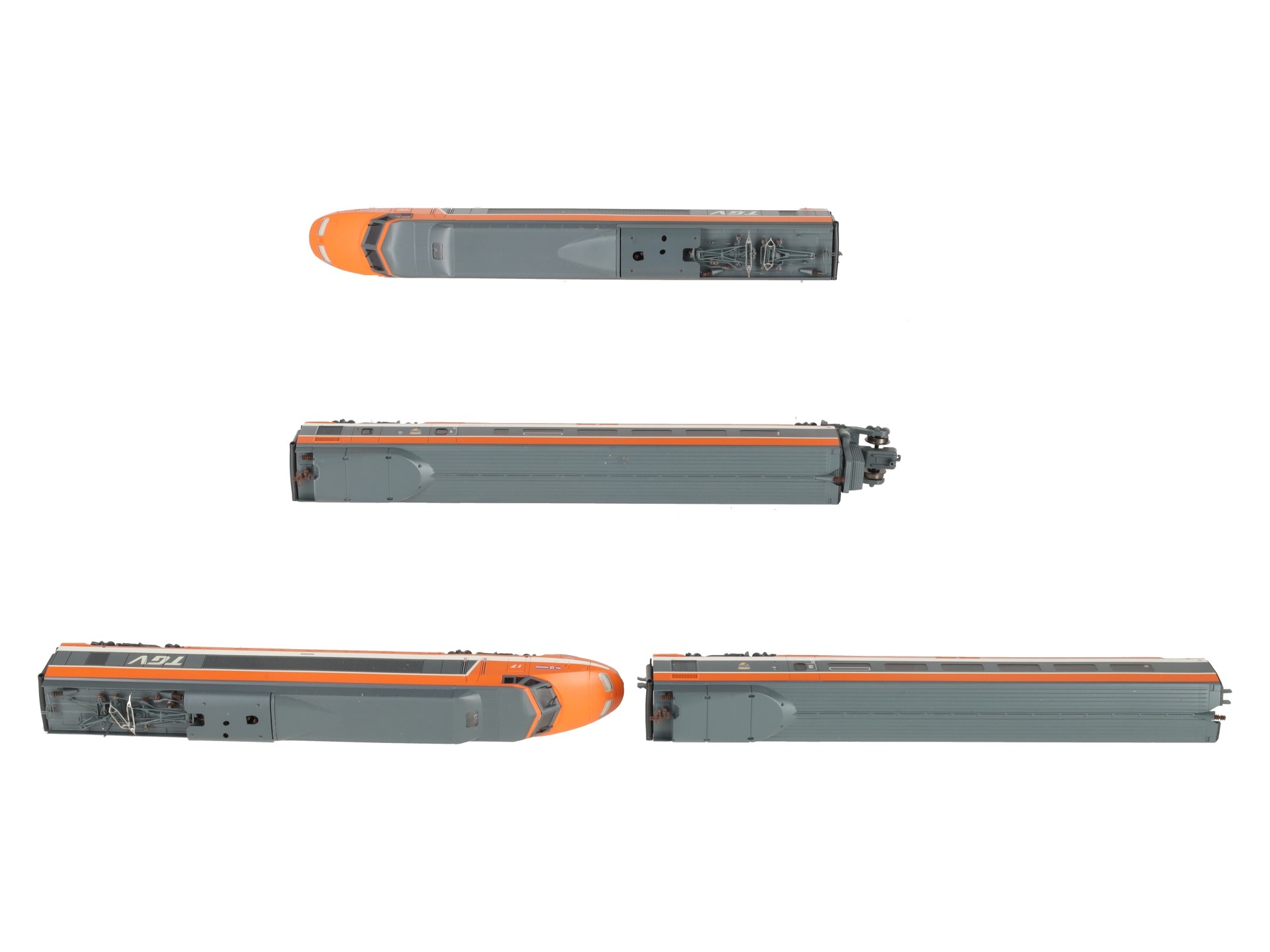 Here is a Jouef HJ2425S HO TGV Inauguration Edition Electric Passenger 4-Unit Set. This set includes [1] powered locomotive, [1] non-powered locomotive, and [2] passengre cars. Each car features plastic construction, plastic trucks, metal wheels and axles, and fleischmann couplers.