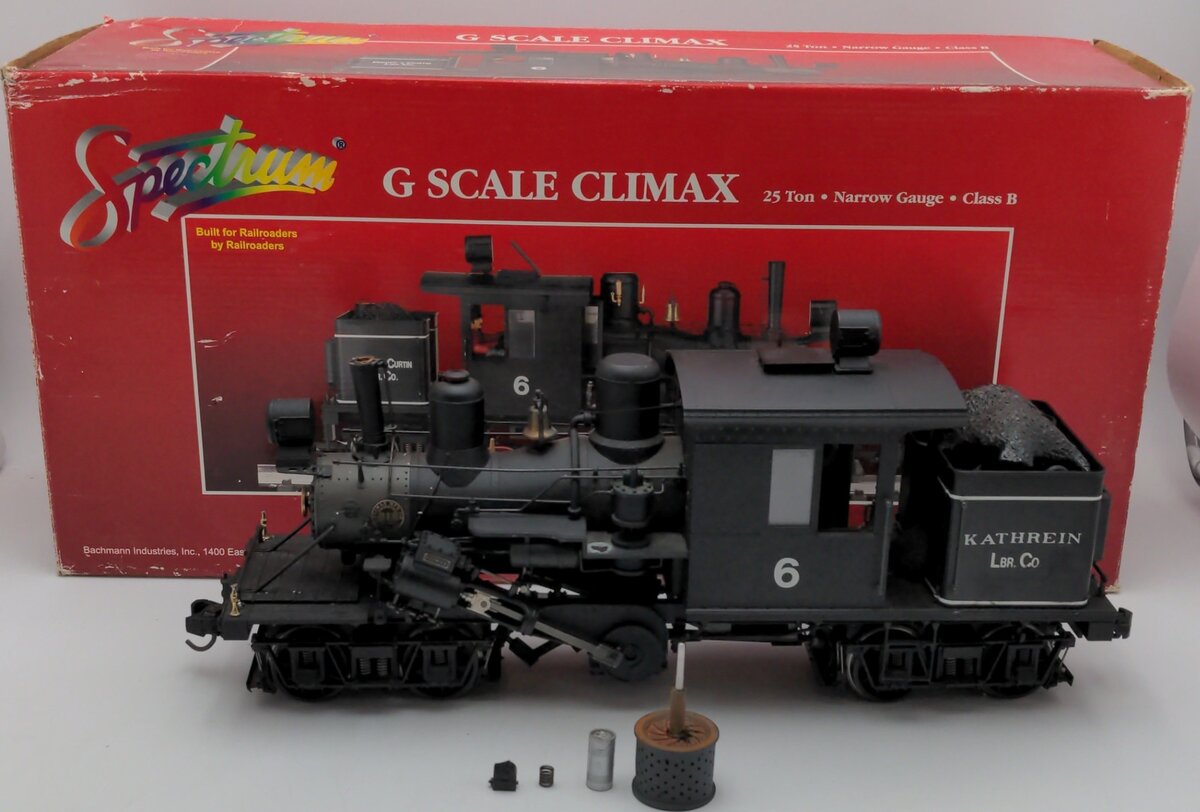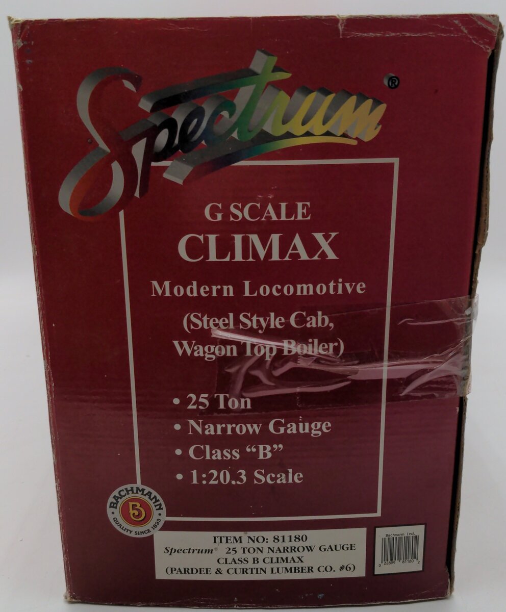 Here is a Bachmann 81180 G Pardee & Curtin Lumber Climax Steam Locomotive #6. Features include a decorative bell, motor, reverse unit, an operating headlight, and operating smoke unit, plastic construction, wagon top boiler, 2 figures and extra parts.