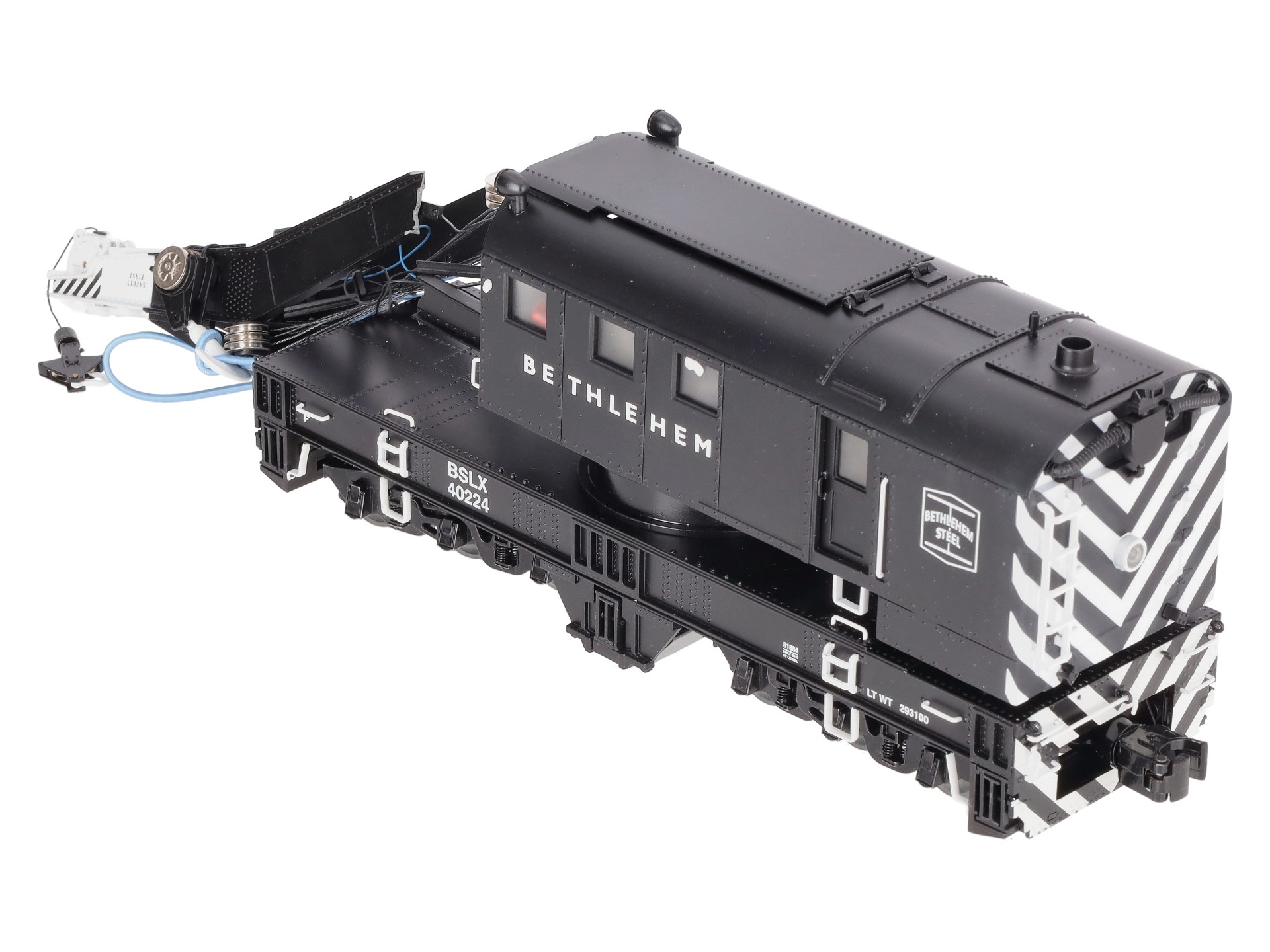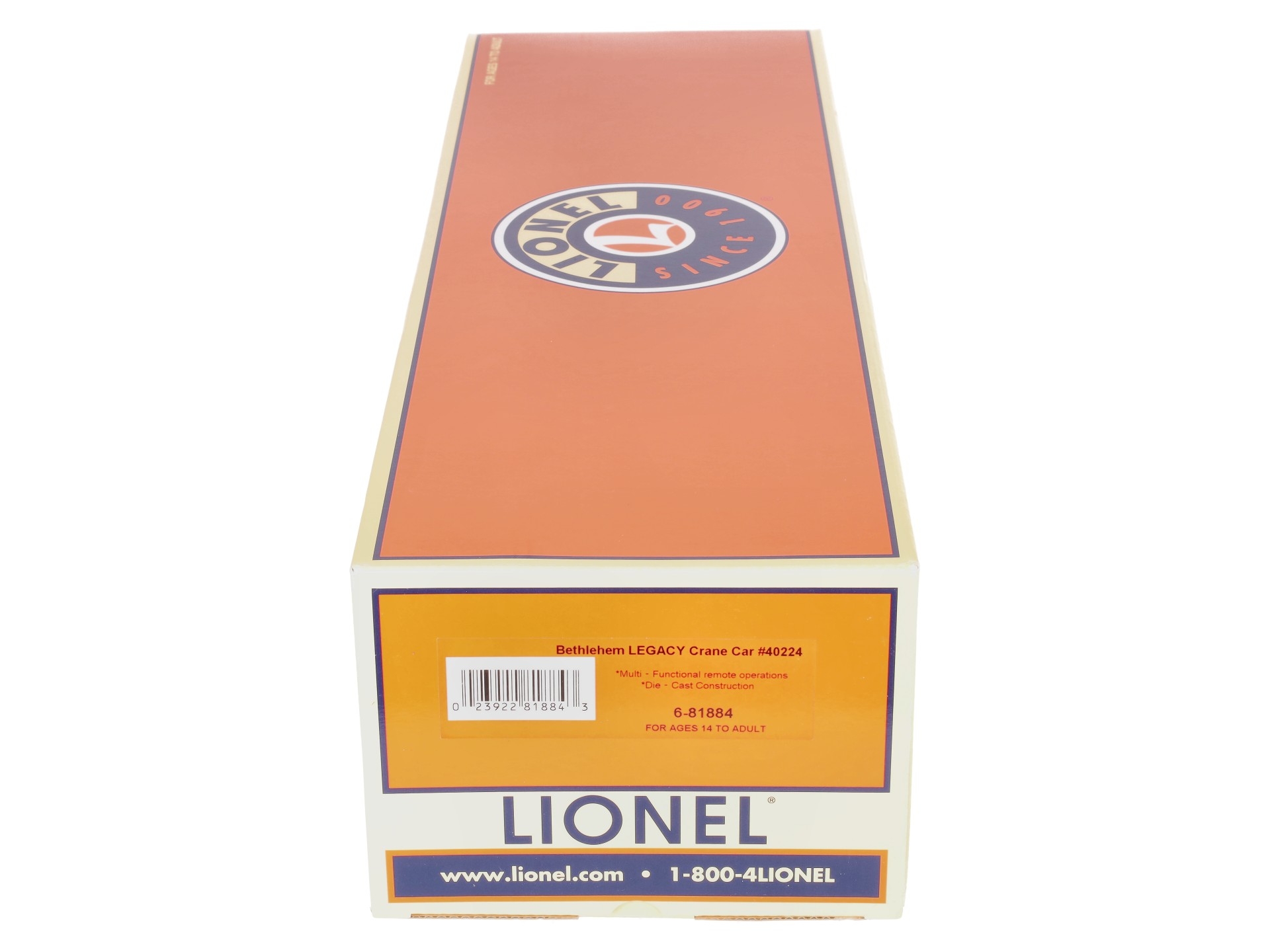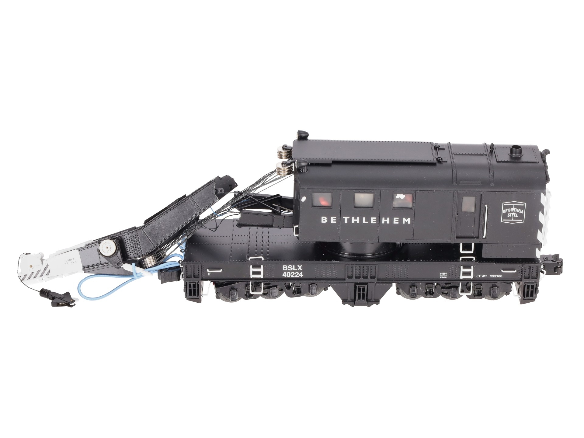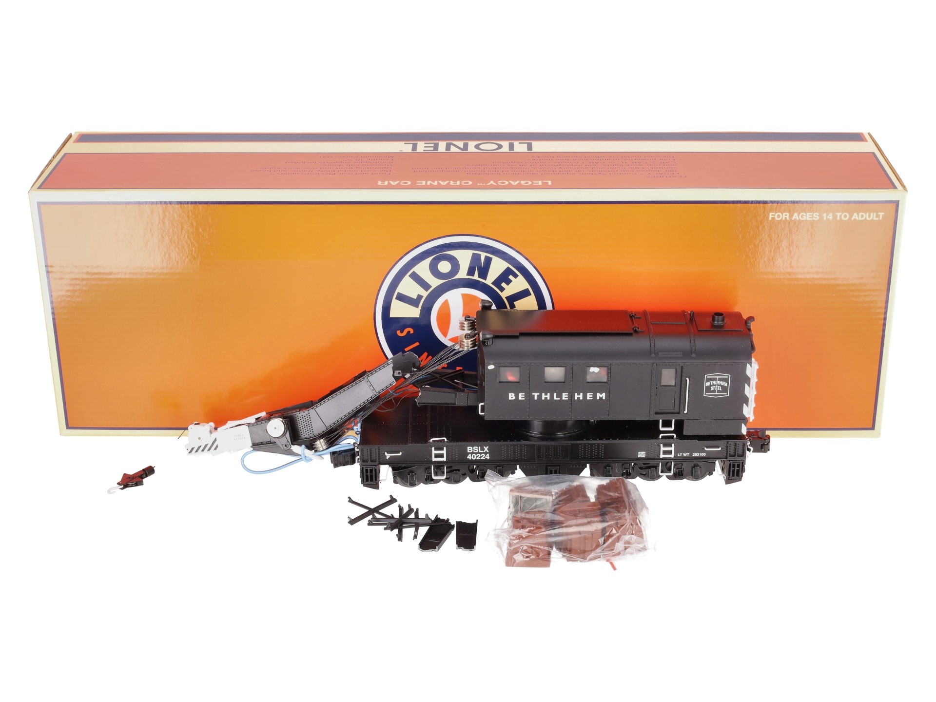 This is a Lionel 6-81884 O Bethlehem Steel Command Control Scale Crane Car. Features the Command control crane cars equipped with the LEGACY Control System bring the highest level of action to Scale railroading. Pull the car into position and run M.o.W. operations anywhere on your layout. Offering fullest remote control operation from a CAB-2 Remote Controller, they are also operable from your CAB-1 or CAB-1L remote. Rotate the cab 360 degrees, lower and raise the boom and two hook lines, deploy the six outriggers and control front and rear lights — all from your remote controller!