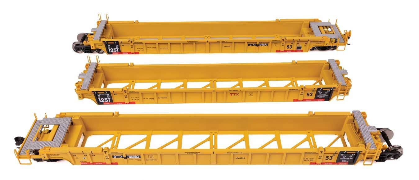 This is a Walthers 910-55830 HO TTX NSC Articulated 3-Unit 53' Well Car Ready-to-Run #786993. Features: One time run of these roadnumbers, order now - limited quantity available! Prototypes in service from 2012 to the present. Carries 20', 40' & 53' cars in the well. Detailed brake gear w/air lines. Separately applied side ladders. Correct 33"" (outside trucks) and 38"" (inside trucks) RP-25 metal wheelsets. Die cast metal body for excellent performance empty or loaded. Proto MAX(TM) metal knuckle couplers. Add SceneMaster(TM) Containers for the finishing touch, each sold separately.