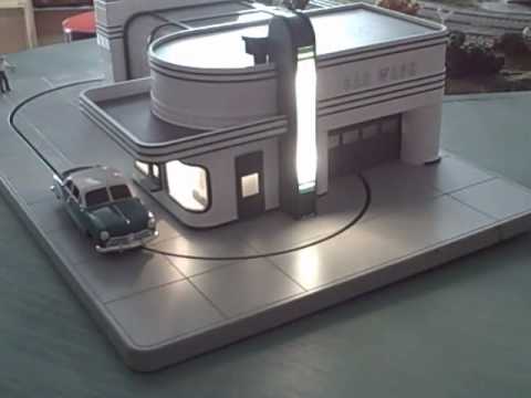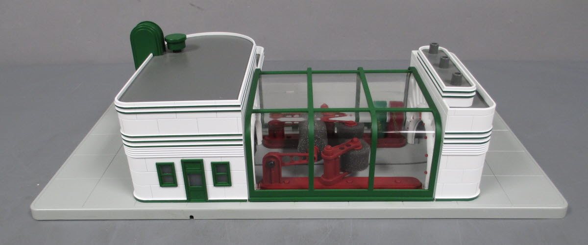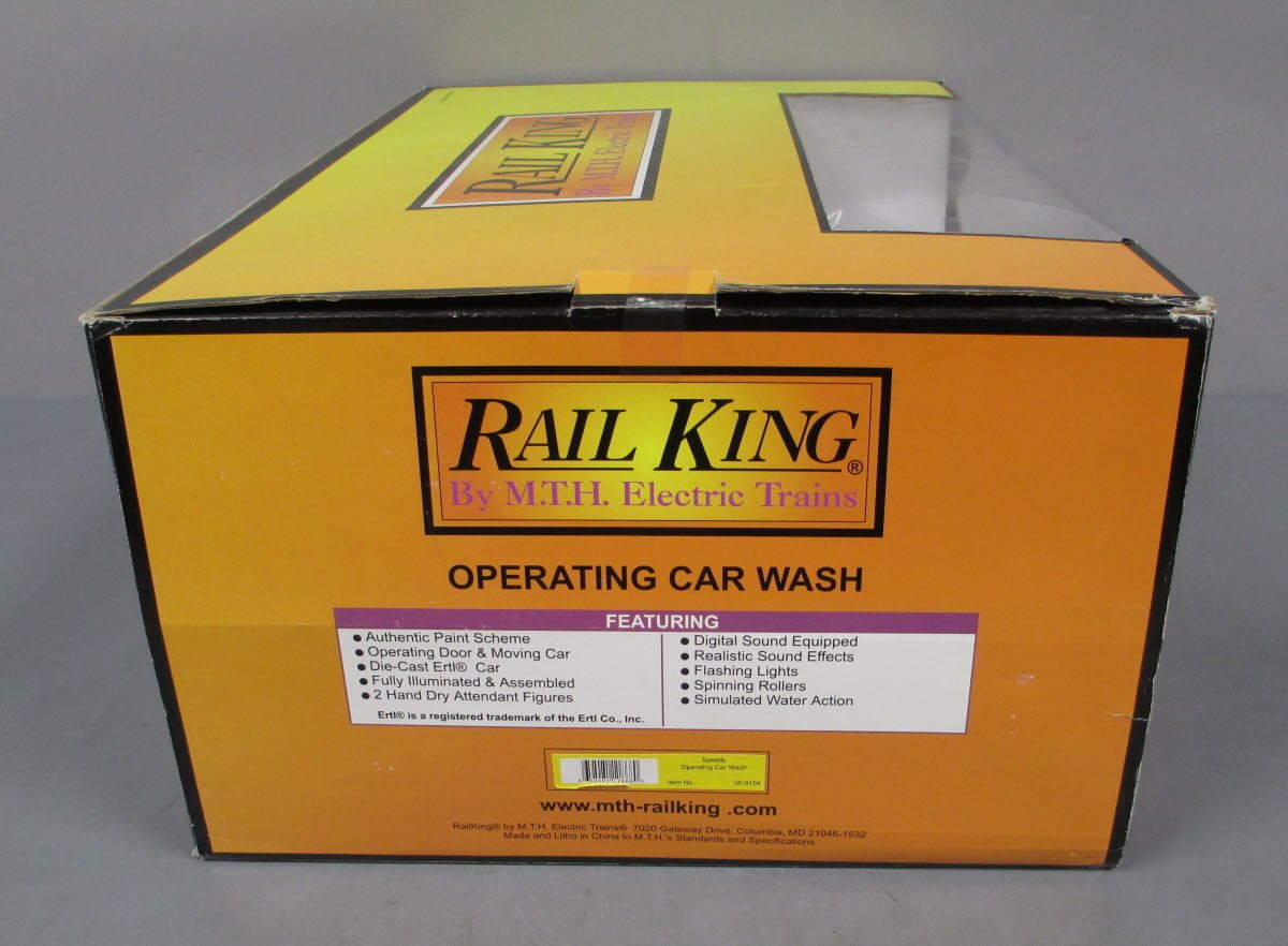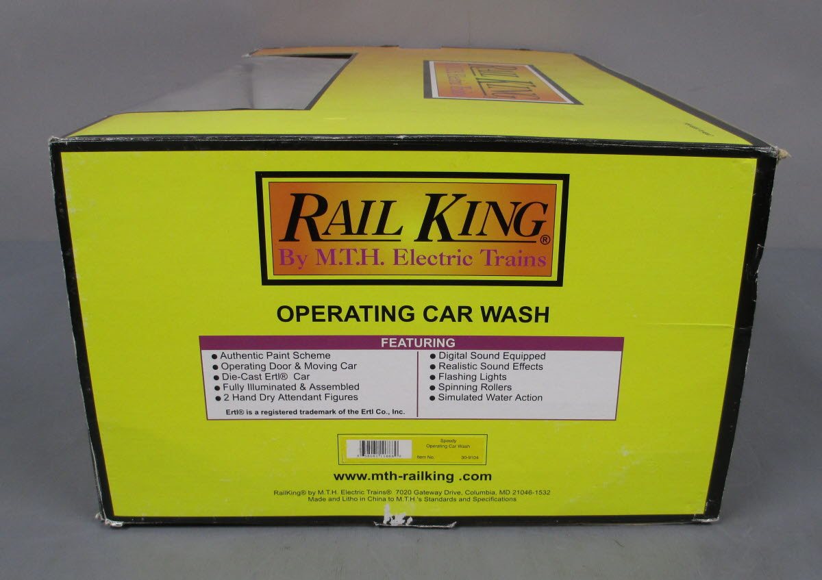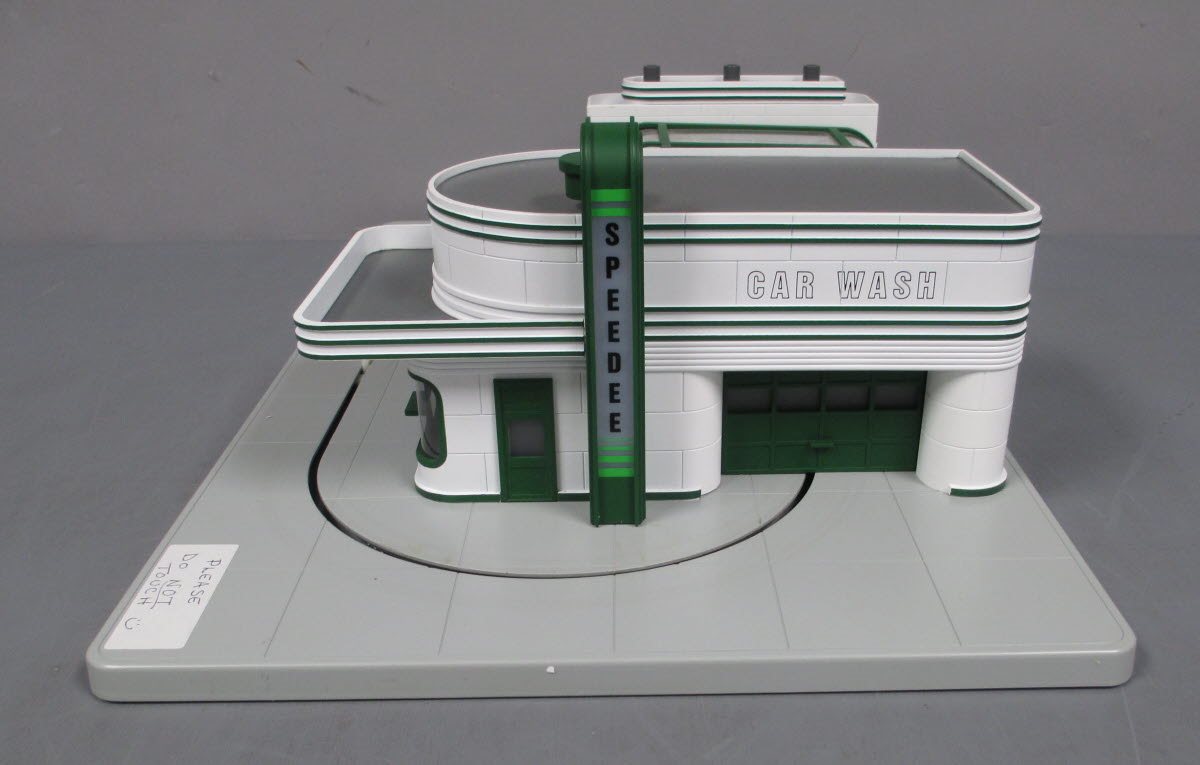 Here is an MTH 30-9104 Speedy Operating Animated Car Wash from 1998. It features all sorts of great animation with a digital sound system to produce realistic sound effects, flashing lights, spinning rollers and simulated water action. It features an authentic paint scheme, operating door and a moving die-cast Ertl car, that goes completely through a cycle of driving in and through the car wash and coming back out again. It is fully illuminated and assembled and also has 2 moving hand dry attendant figures. Please see my pictures for additional features.