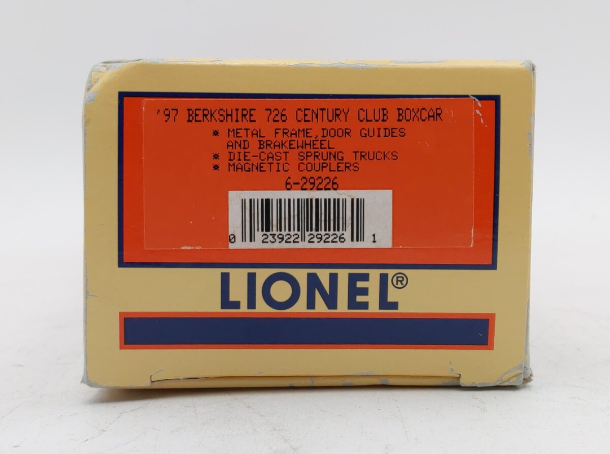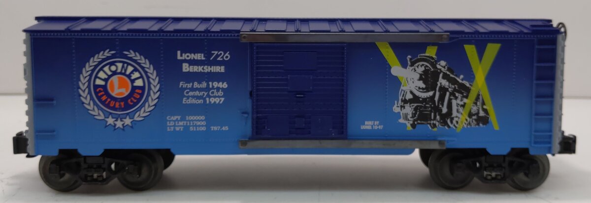 Here is a Lionel 6-29226 O Gauge 726 Berkshire Century Club Boxcar. This boxcar features sliding doors, die-cast metal sprung trucks, die-cast metal operating knuckle couplers, metal wheels and axles.