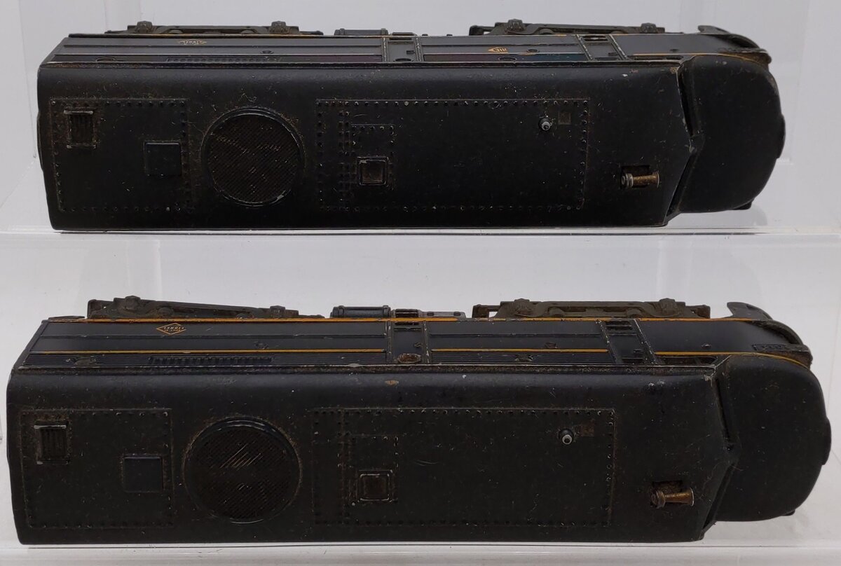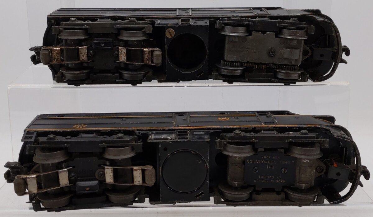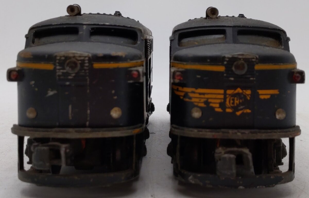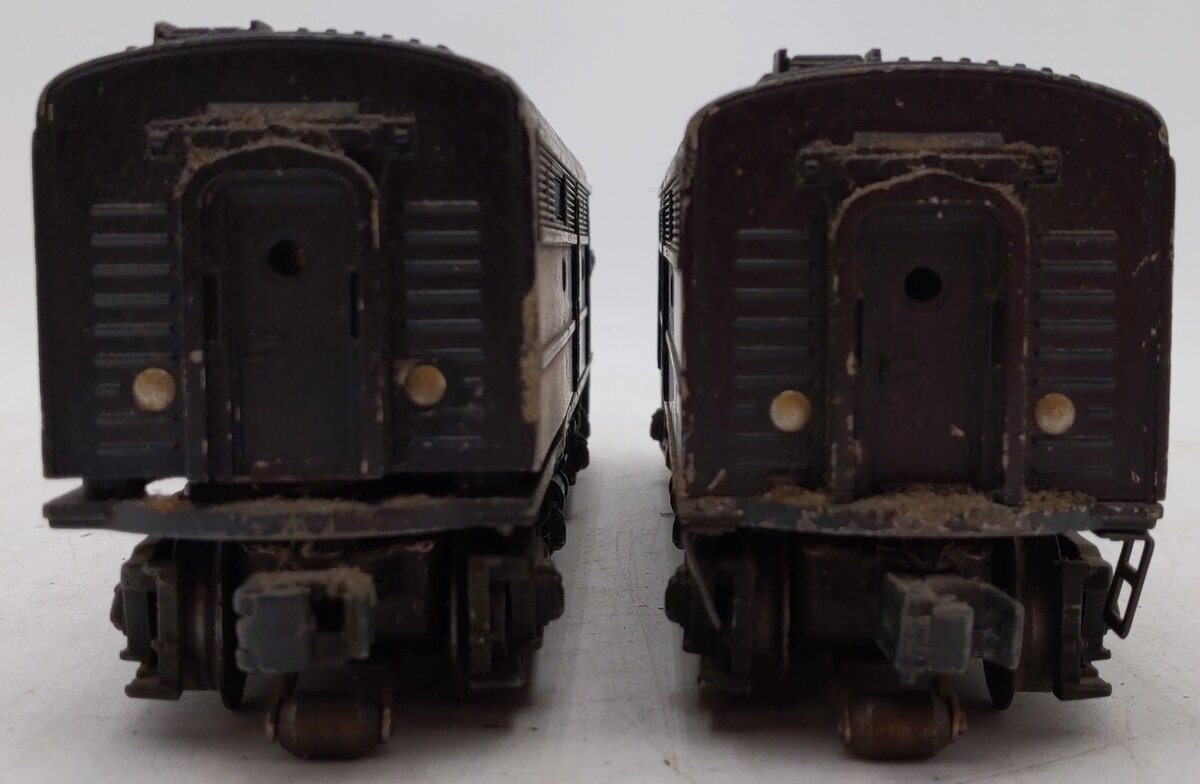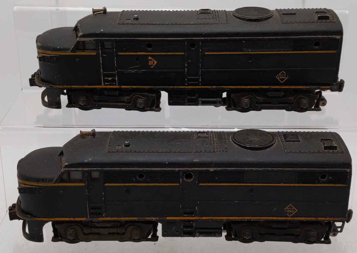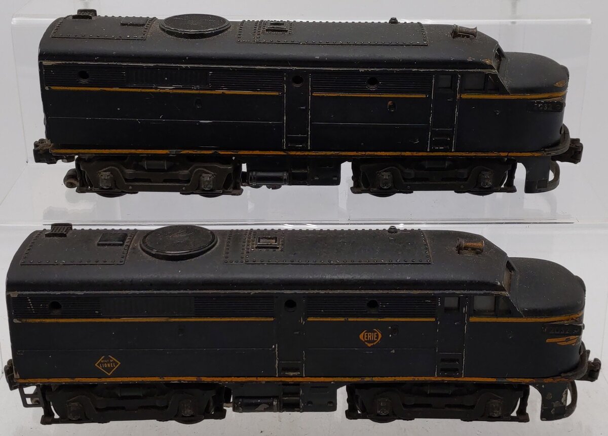 Here is a Lionel 2032 Vintage O Erie Alco AA Diesel Locomotive Set from 1952-54. Features include die-cast metal frames, an operating headlight, an operating remote controlled horn (battery not included), die-cast metal trucks, die-cast metal operating knuckle couplers and metal wheels. There is one powered and one non-powered unit.