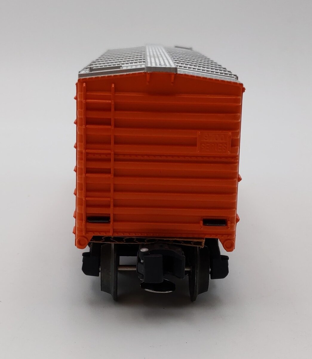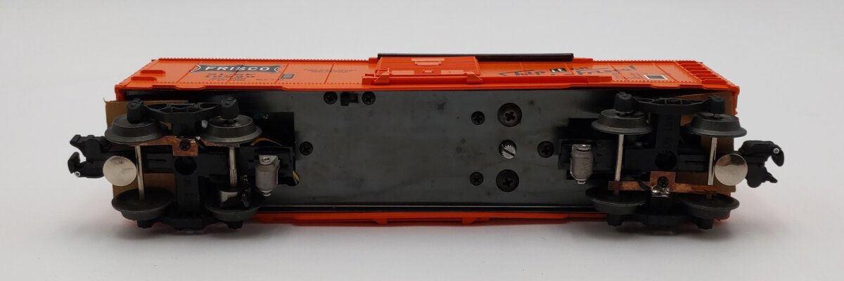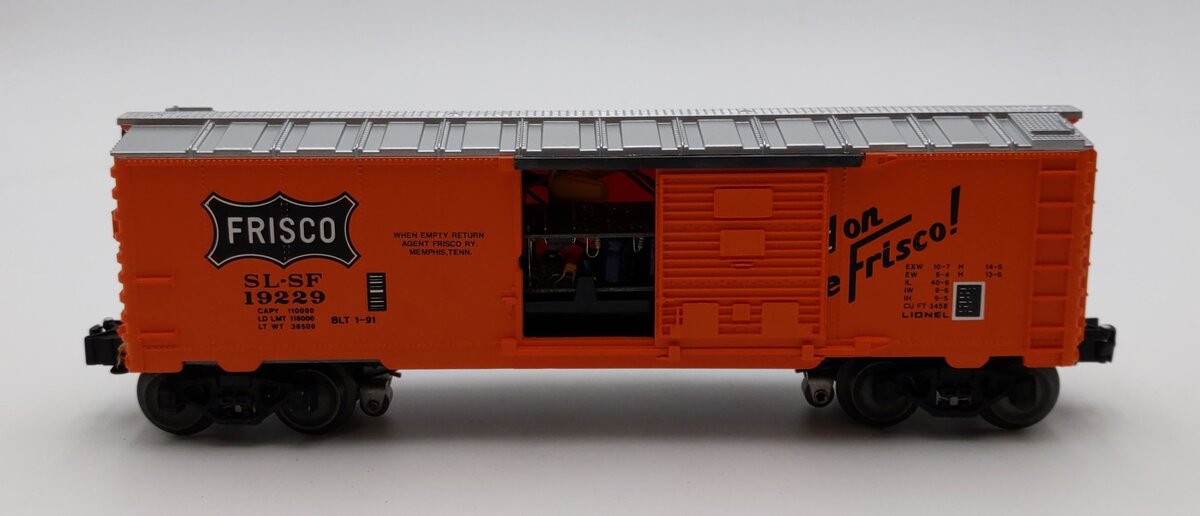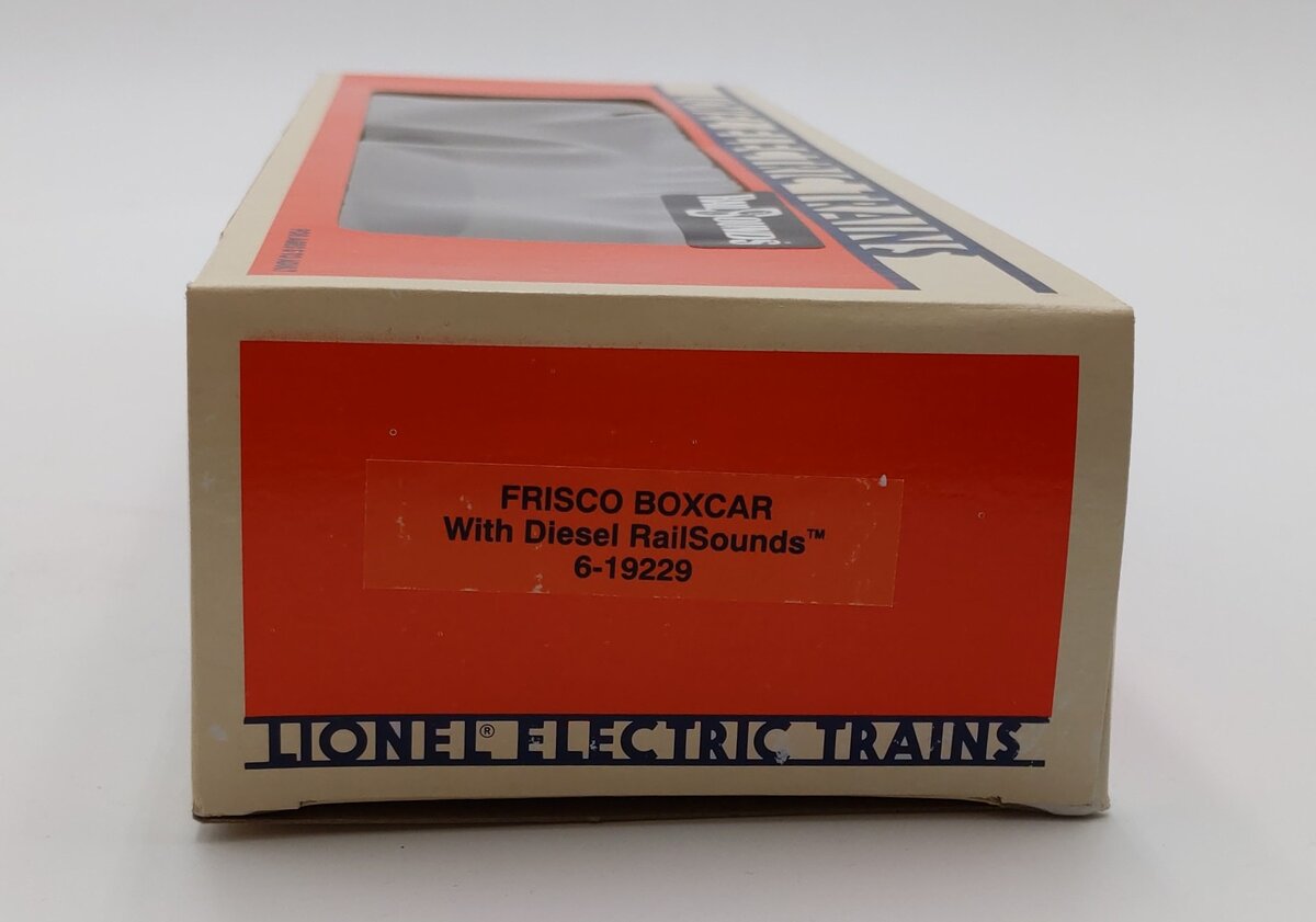 This is a Lionel 6-19229 O Gauge Frisco Boxcar with Diesel Railsounds. This boxcar features sliding doors, die-cast metal sprung trucks, die-cast metal operating knuckle couplers, metal wheels and axles. The sounds include diesel roar, horn, and bell.