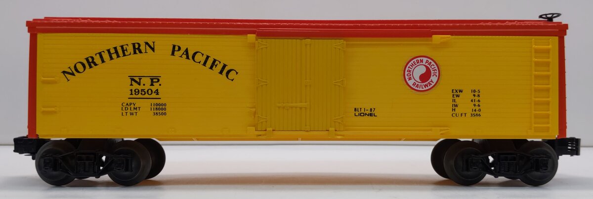 Here is a Lionel 6-19504 O Gauge Northern Pacific Woodside Reefer Car #19504 from 1987. This reefer features a plastic construction with sliding doors, plastic trucks, operating knuckle couplers, metal wheels and axles, and attractive molded detailing.