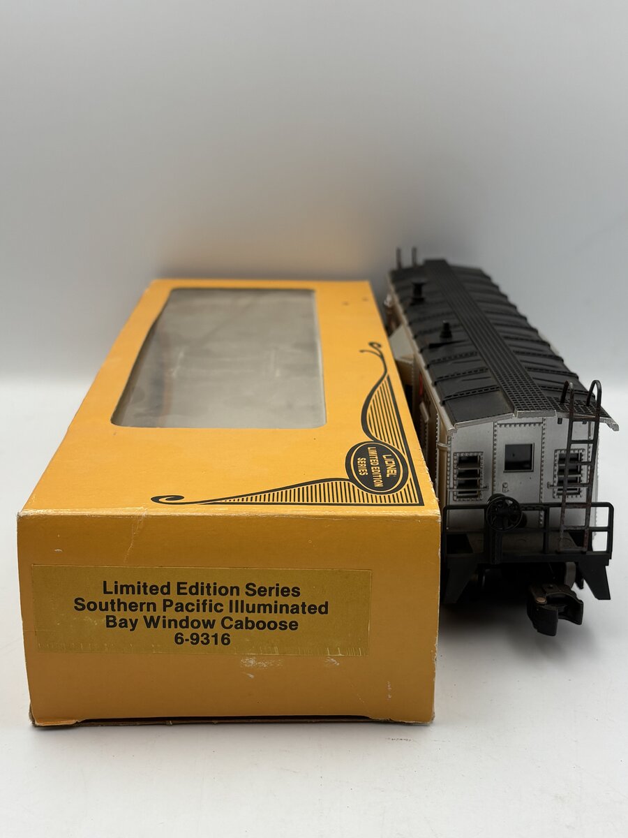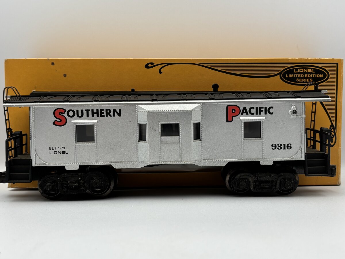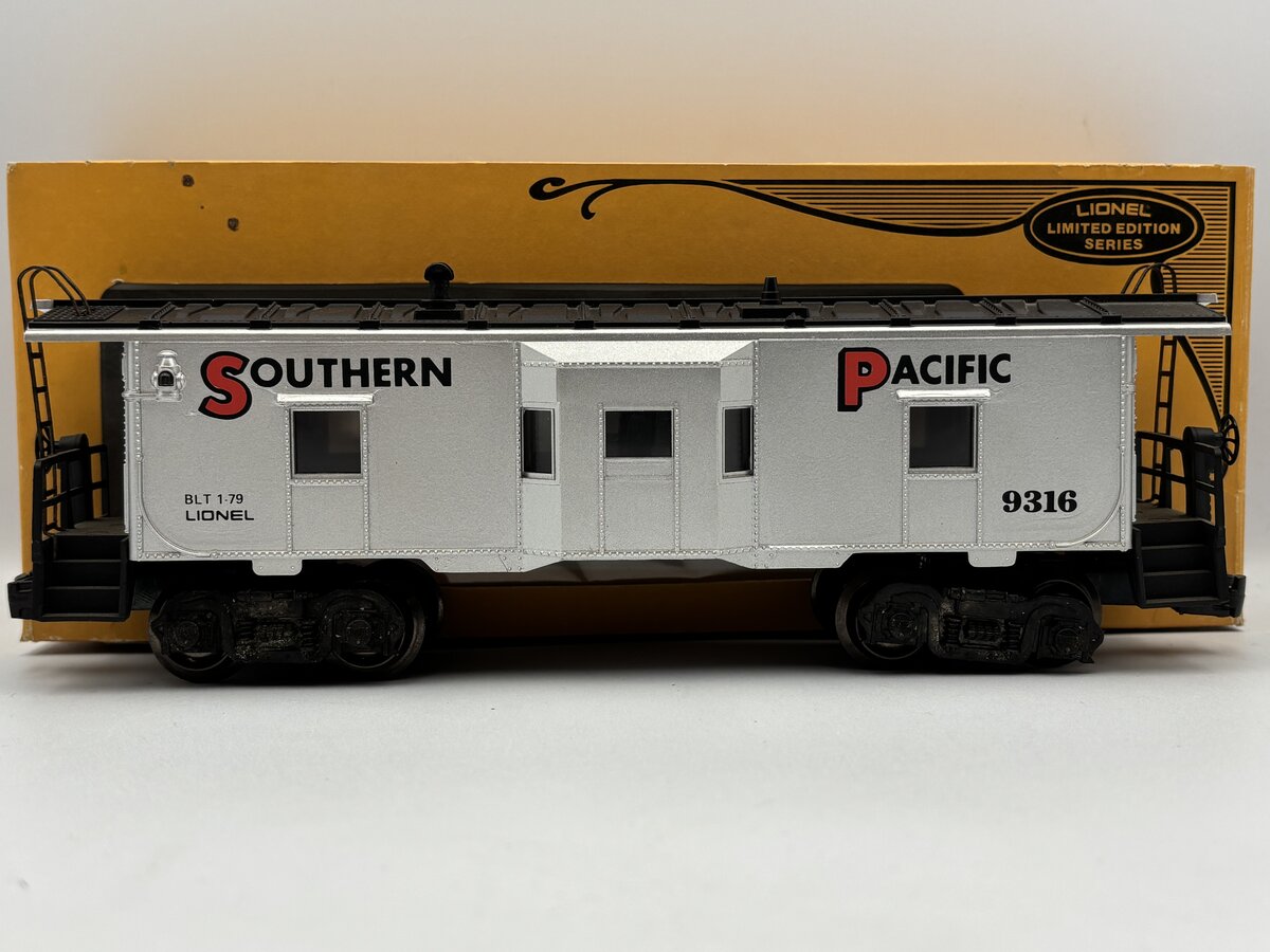 Here is a Lionel 6-9316 O Gauge Southern Pacific Bay Window Caboose from 1979. This car was part of the 1970 Southern Pacific Limited set. It is lighted and features die cast trucks and operating couplers.