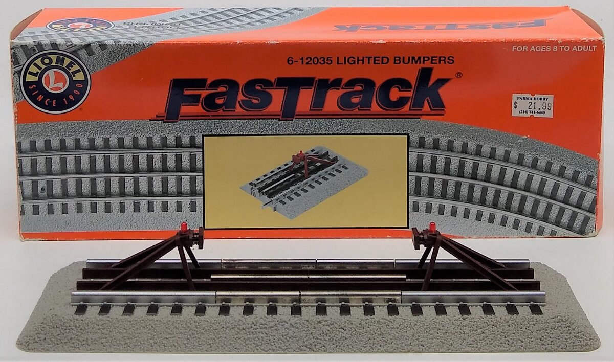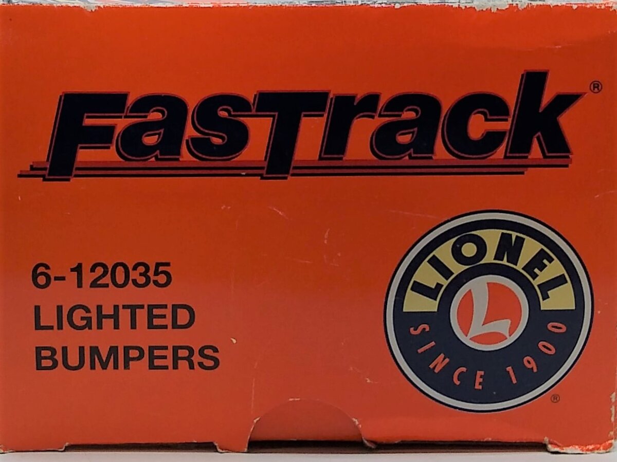 This is a Lionel 6-12035 O Gauge FasTrack Lighted Bumper. The bumper features a die-cast bumper with sprung bumper plates and illuminated red warning lights. The section is 5 inches long.