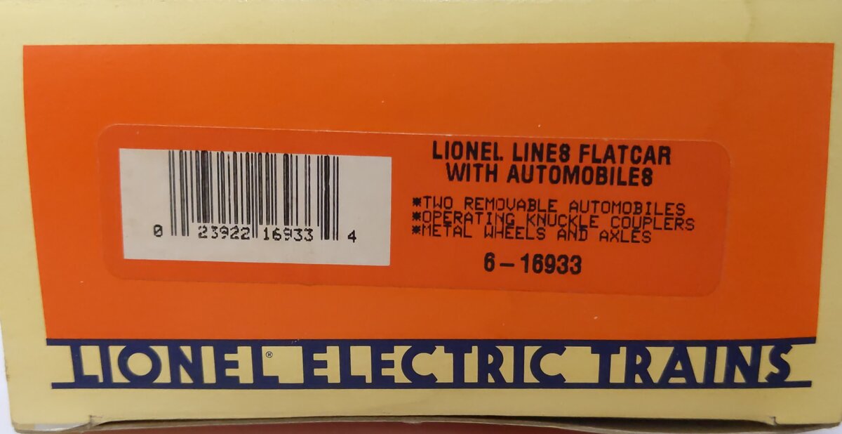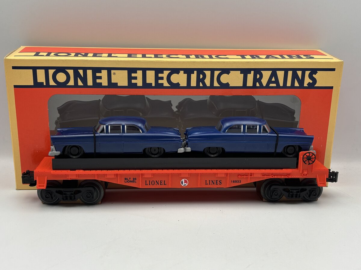 Here is a Lionel 6-16933 O Gauge Lionel Lines Flatcar with 2 Blue Automobiles. This car features plastic trucks, operating knuckle couplers, metal wheels and axles.