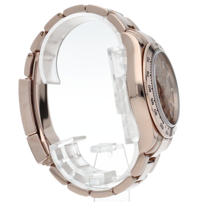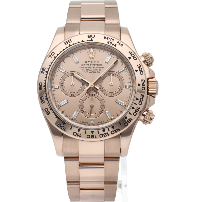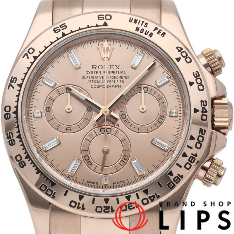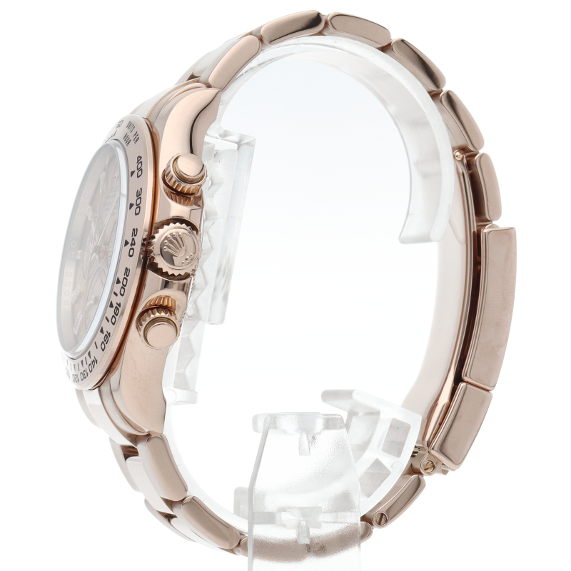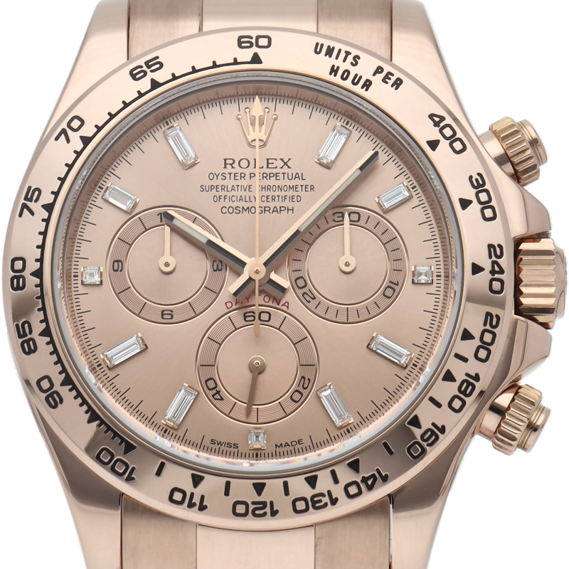 | The Daytona is the pinnacle of Rolex's sports models. It is a popular watch that combines functionality and design, equipped with the in-house developed chronograph movement, Cal. 4130. Everose gold is an alloy developed exclusively by Rolex, creating a luxurious atmosphere. |