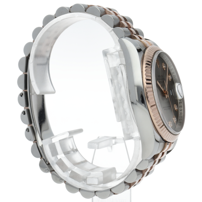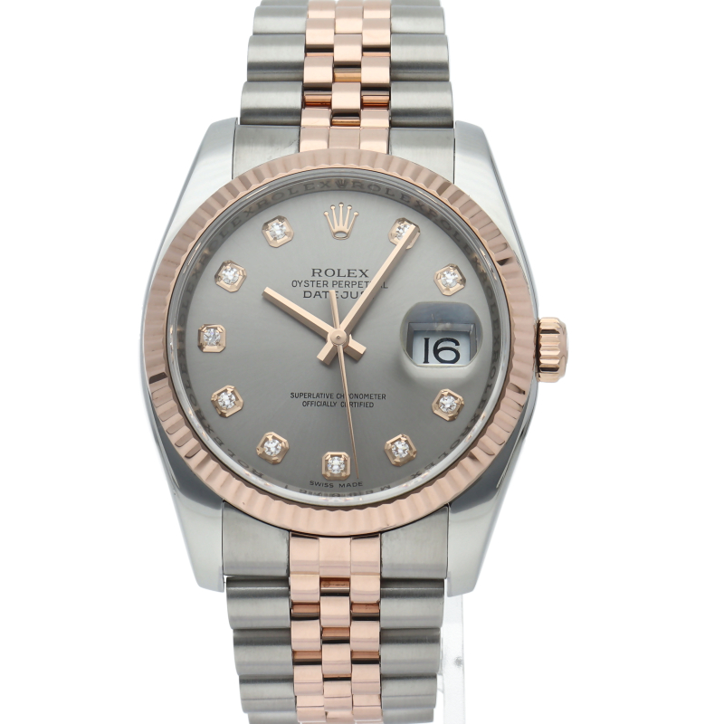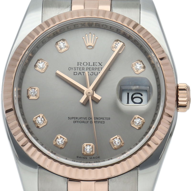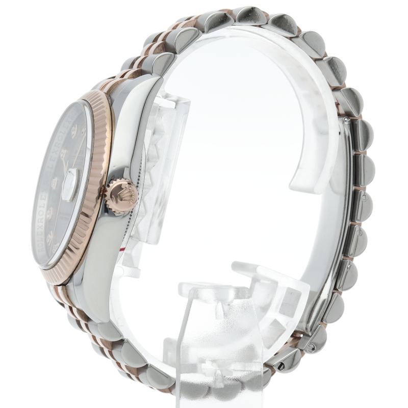 | The Datejust is a Rolex dress watch that is loved by a wide range of age groups. It features a combination of soft pink gold and stainless steel and 10P diamonds. |