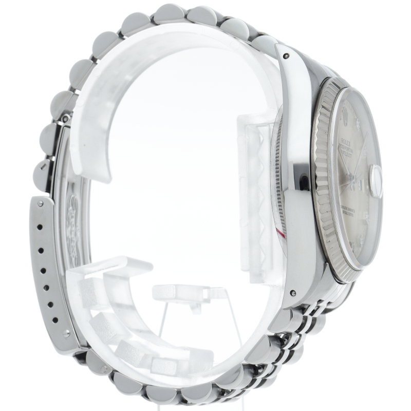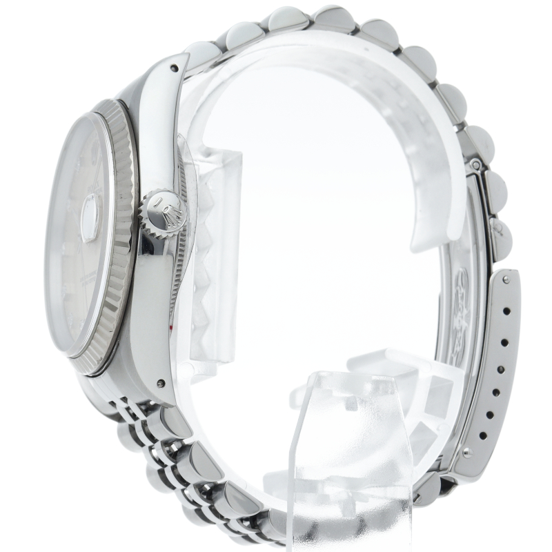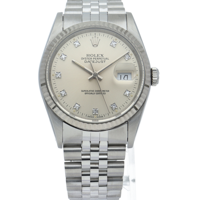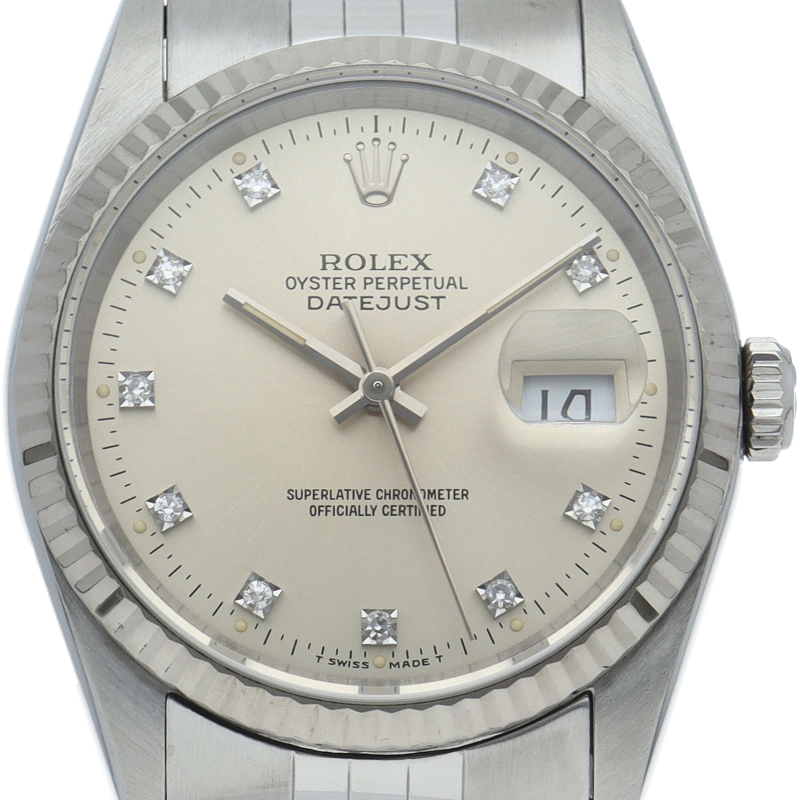 | "Datejust" is a Rolex dress watch loved by people of all ages. 10P diamonds are applied to the combination specification of white gold and stainless steel. |
