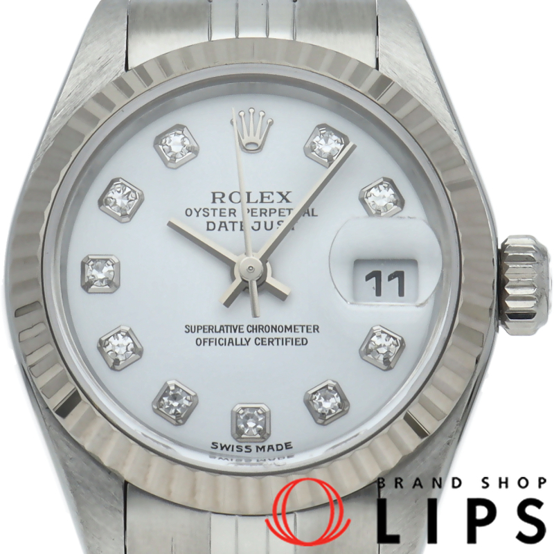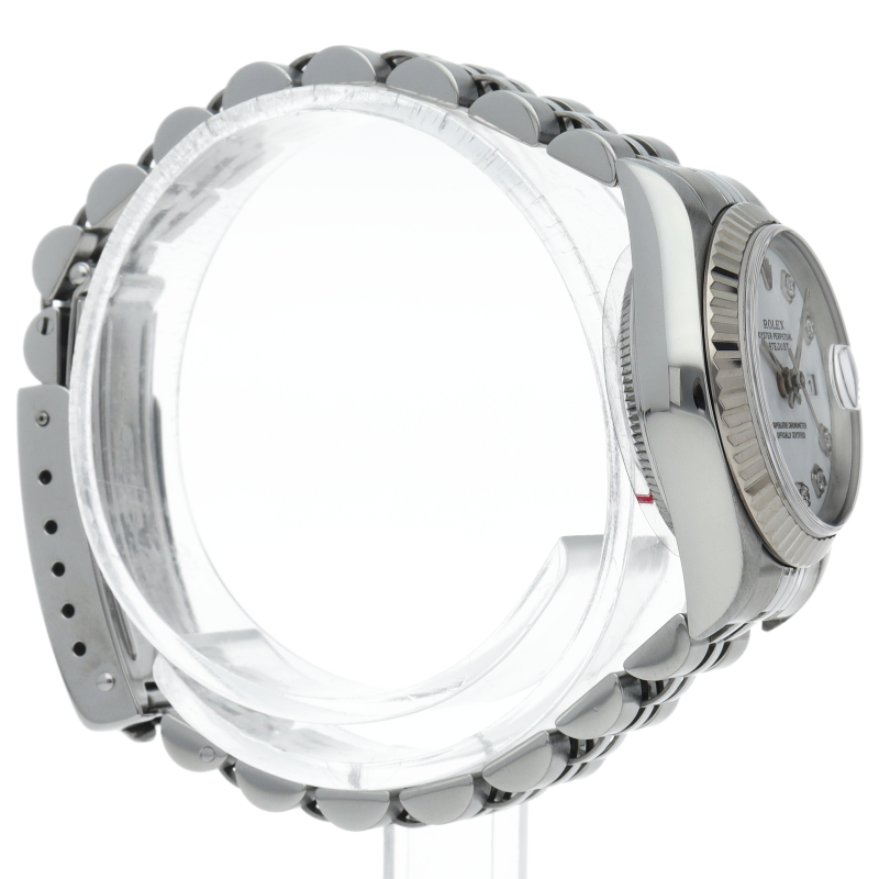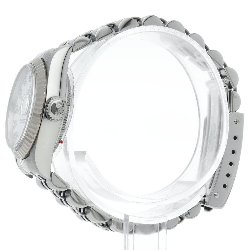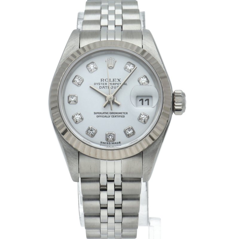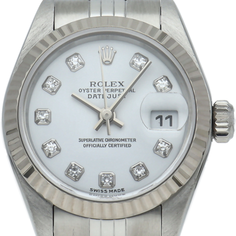 | The Datejust is a Rolex dress watch loved by people of all ages. The combination of white gold and stainless steel is gorgeous with 10P diamonds. |