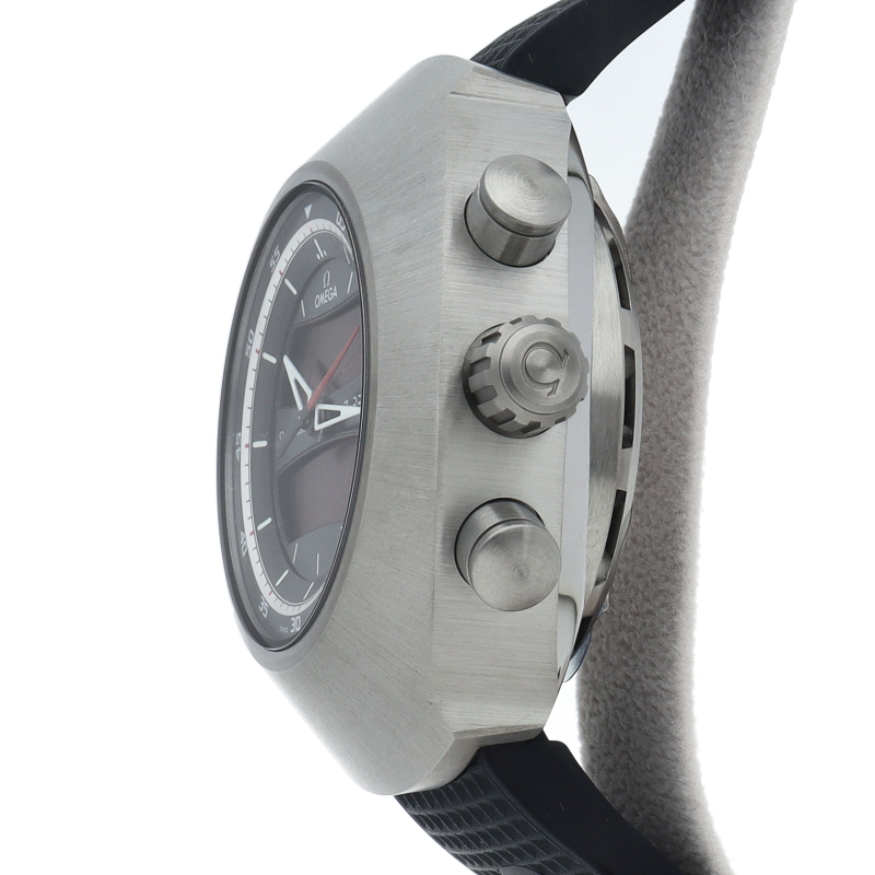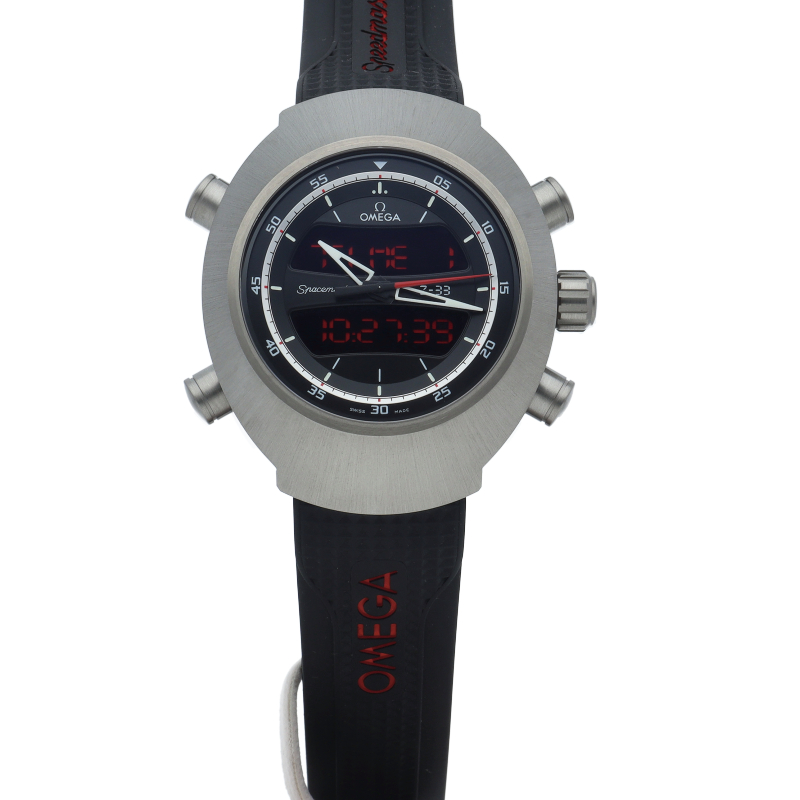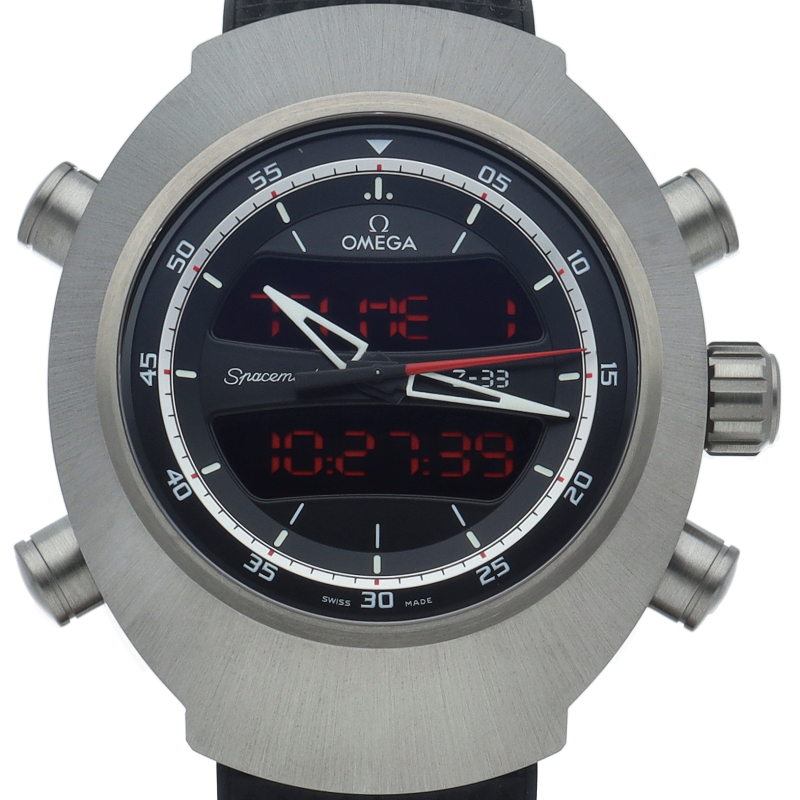 | The Spacemaster Z-33 is housed in a distinctively shaped case called the Pilot Line, which has been a popular design among the Speedmaster models, and is equipped with the latest multi-function quartz movement, Caliber 5666. In addition, the four pushers on both sides of the case, together with the crown, allow you to control all of the various digital functions. |