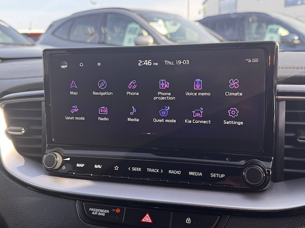 ABS with Electronic Brakeforce Distribution (EBD) and Brake Assist System (BAS), All round 3-point seatbelts, Dual horn, Electric parking brake, Electronic stability control (ESC) and vehicle stability management (VSM), Front passenger airbag cut off switch, Height adjustable front seatbelts, Hill start assist control (HAC), Impact sensing auto door unlocking, Rear door child safety locks, Seatbelt reminder warning, Twin curtain airbags, Twin front airbags, Twin front side airbags, Tyre pressure monitoring system, 10.25 inch touchscreen satellite navigation, 4.2 inch supervision colour cluster display, Android auto with voice control, Apple car play with voice control, Bluetooth with Voice Recognition and Music Streaming, Cruise control + speed limiter, Driver attention warning with leading vehicle departure warning, Emergency call service, Emergency stop signalling system, Forward Collision-Avoidance Assist (FCA) - City/Pedestrian/Cyclist, Kia connect, Lane Following Assist (LFA), Lane keep assist, Motor driven power steering, Rear parking sensor, Reversing camera with dynamic guide lines, Trip computer, 3rd brake light, All-round Electric Windows with Front Auto Up and Down Function, Auto dimming rear view mirror, Automatic defog system, Automatic headlights, Body colour bumpers, Body colour side sill mouldings, Body coloured rear roof spoiler with high gloss black trim, Electric adjustable/heated/folding door mirrors with LED Indicators, Exterior front door handle illumination, Heated rear window with timer, High beam assistant, High Gloss Black and Satin Chrome Radiator Grille, High gloss black door mirrors, LED daytime running lights, LED front fog lights, LED full width tail lights, LED Headlights, LED rear combination lights, LED rear fog light, Privacy glass in rear windows and tailgate, Projection headlights, Rain sensing front wipers, Rear side wing doors, Rear wash/wipe, Satin finished beltline, Solid paint, Wide view drivers door mirror, Windscreen Washer Level Warning, 12V power socket in front centre console, 3 seat bench in 2nd row, 3 x passenger assist grips, 60/40 split folding rear seat, All-round height adjustable headrests, Aluminium pedals, Centre Console with Storage Box and Sliding Armrest, Cloth/faux leather upholstery, Cupholders in rear armrest, Dash illumination dimmer switch, Driver and Front Passenger Sunvisors with Vanity Mirror Illumination and Ticket Holder, Driver + front passenger electric lumbar support, Driver/front