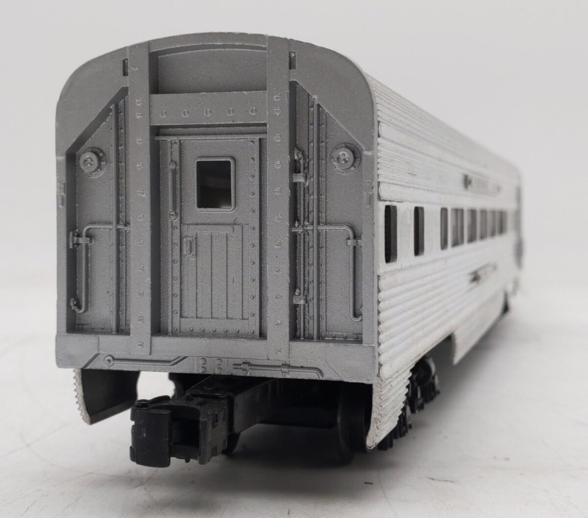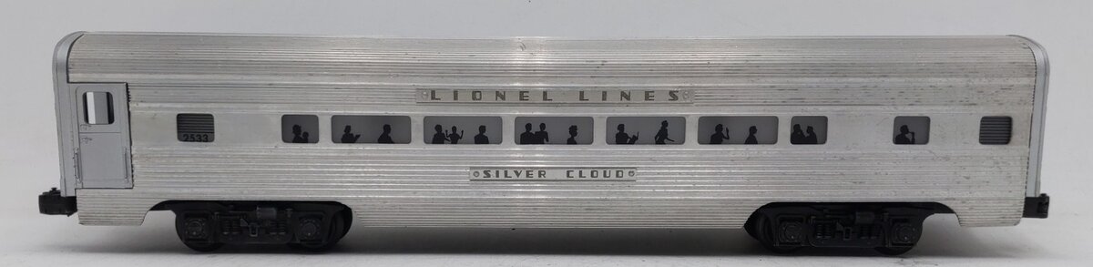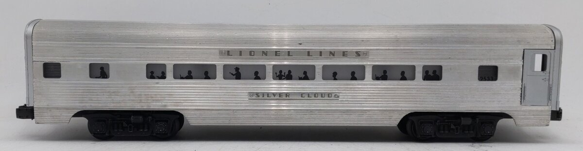 Here is a Lionel 2533 Vintage O Lionel Lines "Silver Cloud" Aluminum Pullman Car from 1952-59. It features an extruded aluminum body, an illuminated interior with passenger silhouetted windows, die-cast trucks with operating metal couplers, metal wheels and axles, and it measures approximately 15" inches in length. This Type II Variation is identifiable by its small silver rivets that were used to attach the "Lionel Lines" and "Silver Range" nameplates to the body rather than the larger or black rivets used in later iterations.