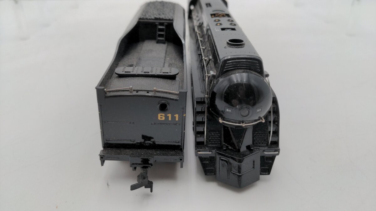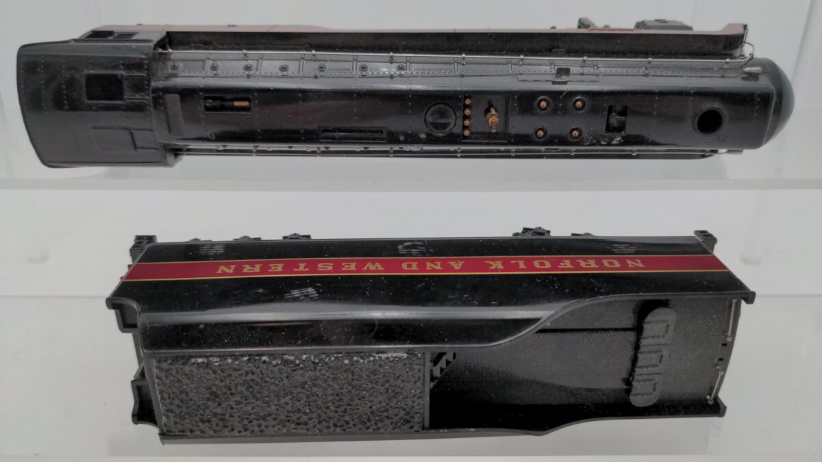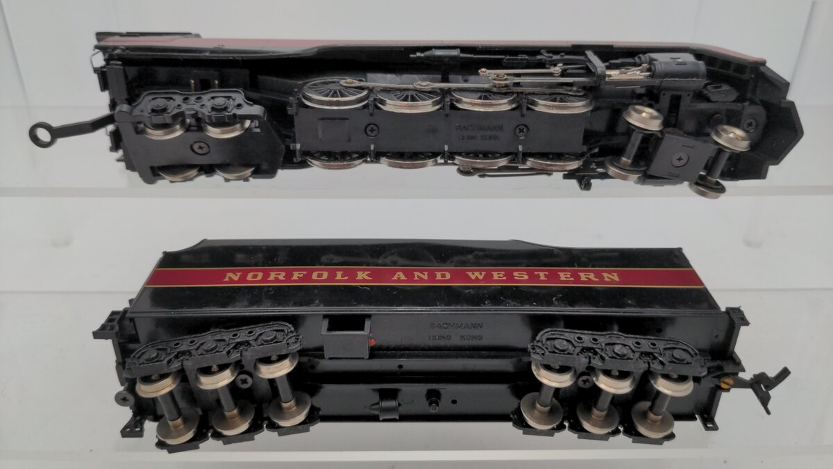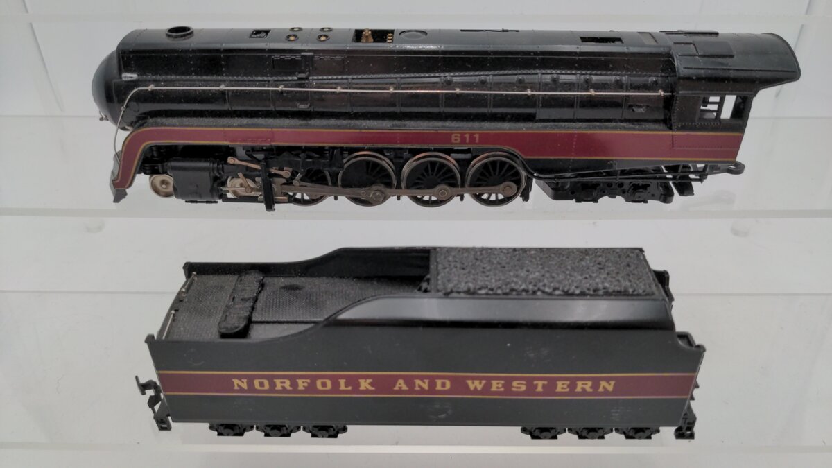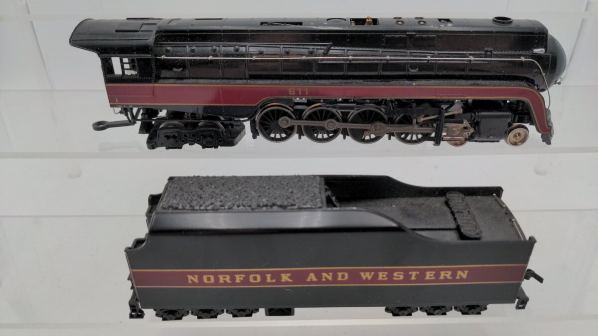 This is a Bachmann 41-0657-A4 Norfolk & Western Class J 611 Steam Locomotive & Tender. Features include operating lights, a powerful motor, plastic trucks with a plastic latch coupler on the tender, working smoke unit, metal side rods, separately applied metal handrails, and metal wheels and axles.