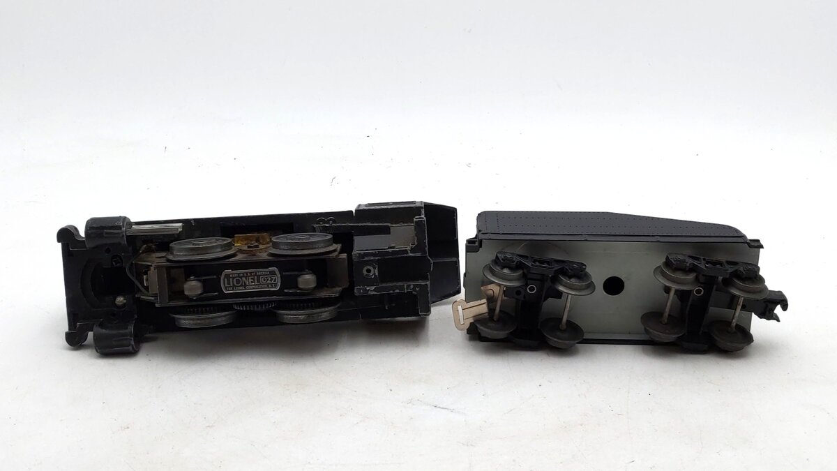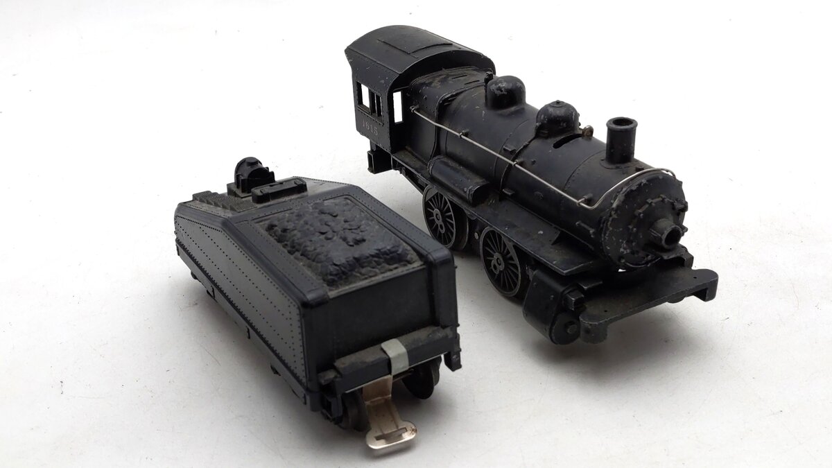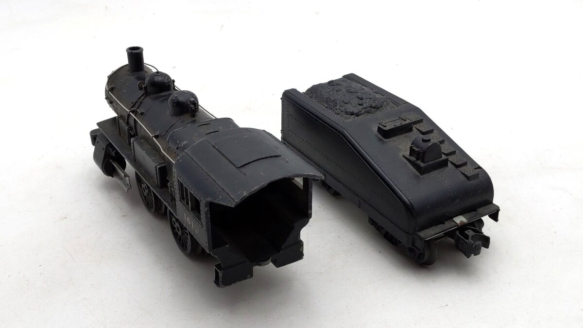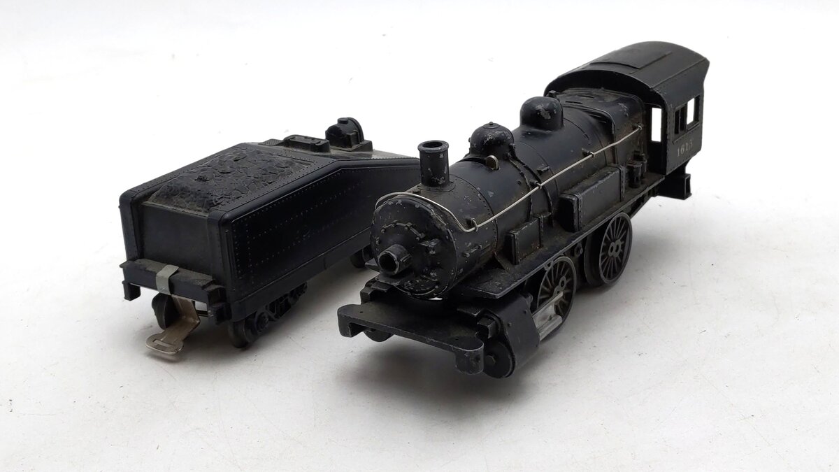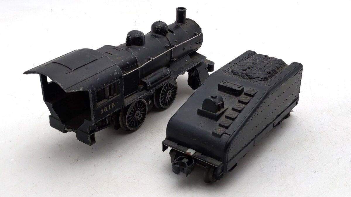 Here is a Lionel 1615 Vintage O 0-4-0 Die-Cast Steam Switcher Locomotive & Tender. Features include an 0-4-0 wheel arrangement with detailed driving wheel hardware, black die-cast boiler, three-position E-unit, headlight, wire hand railings plus a front step and an operating front coupler. The tender features a plastic shell, stamped metal frame, plastic trucks, and a knuckle coupler.