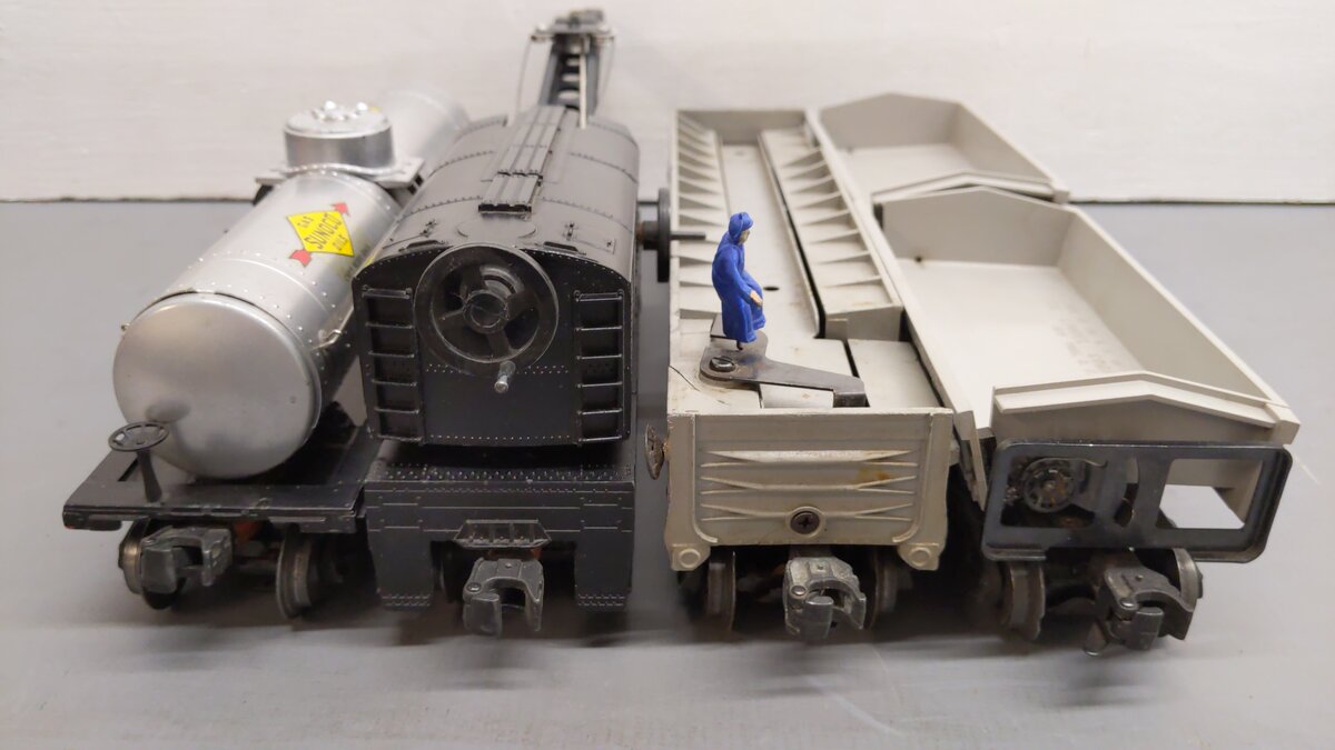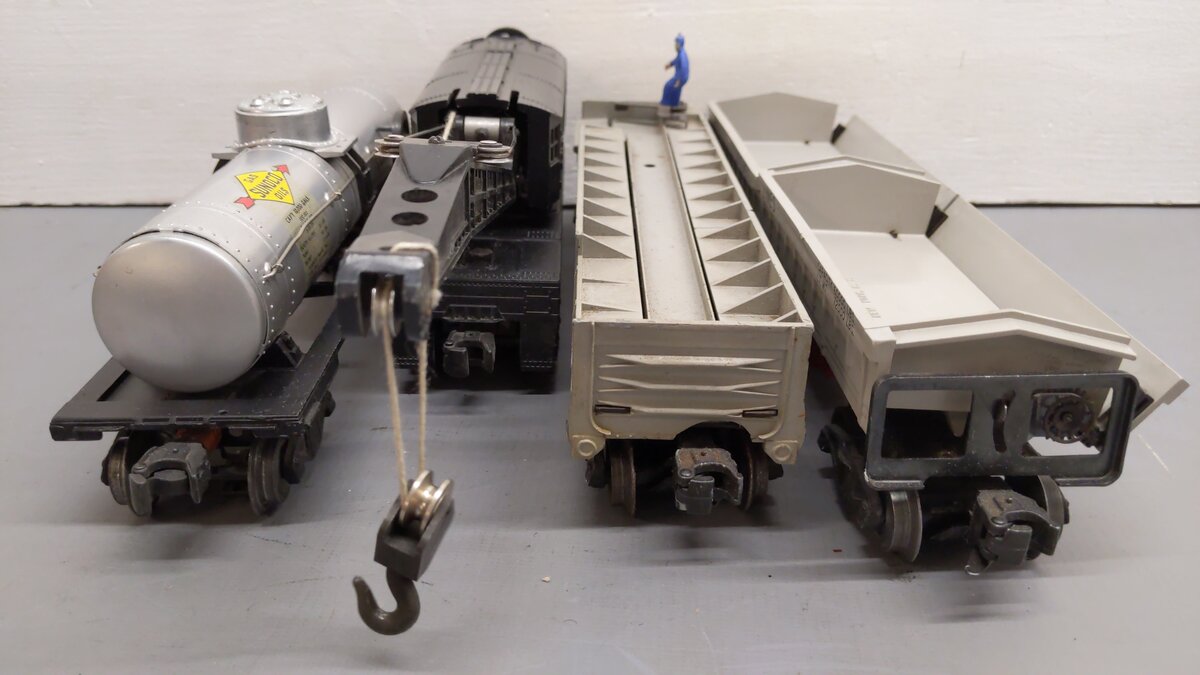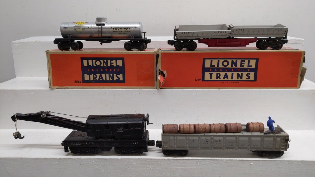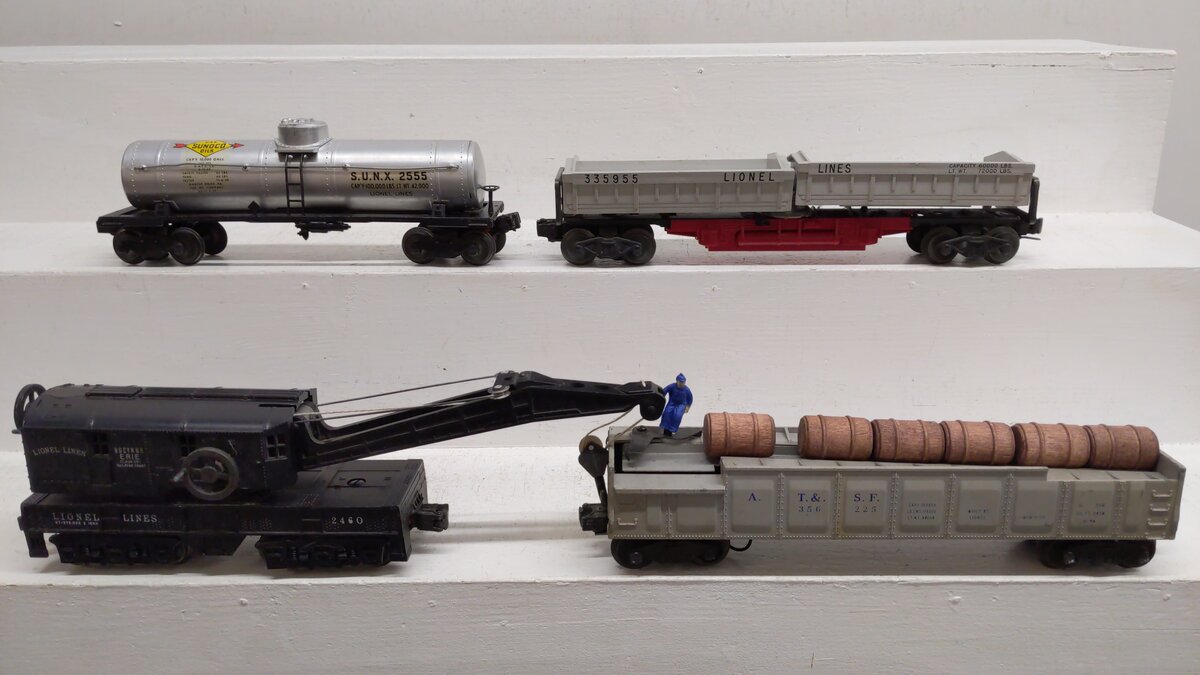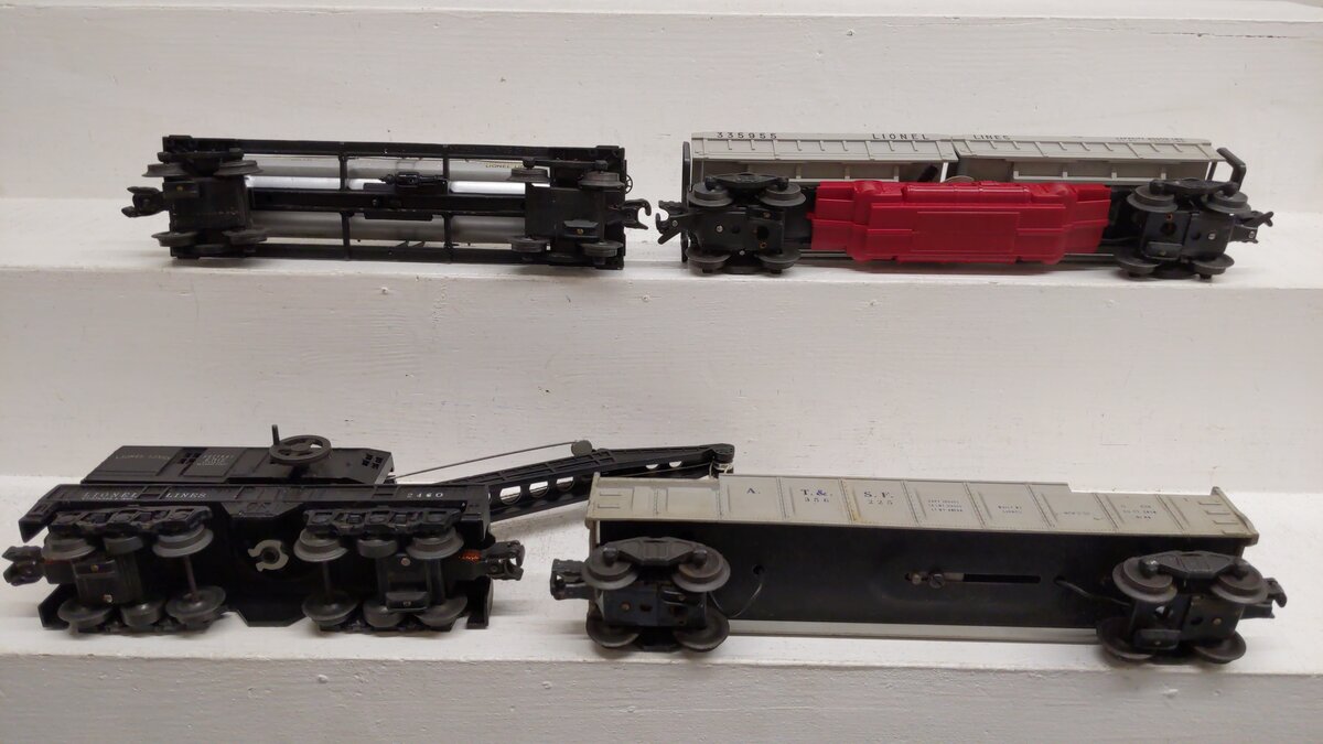 Here we have a Lionel O Vintage Assorted Freight Cars: 2555, 2460, 356225, 335955 [4]. These items feature a plastic body construction as well as metal wheels and knuckle couplers.