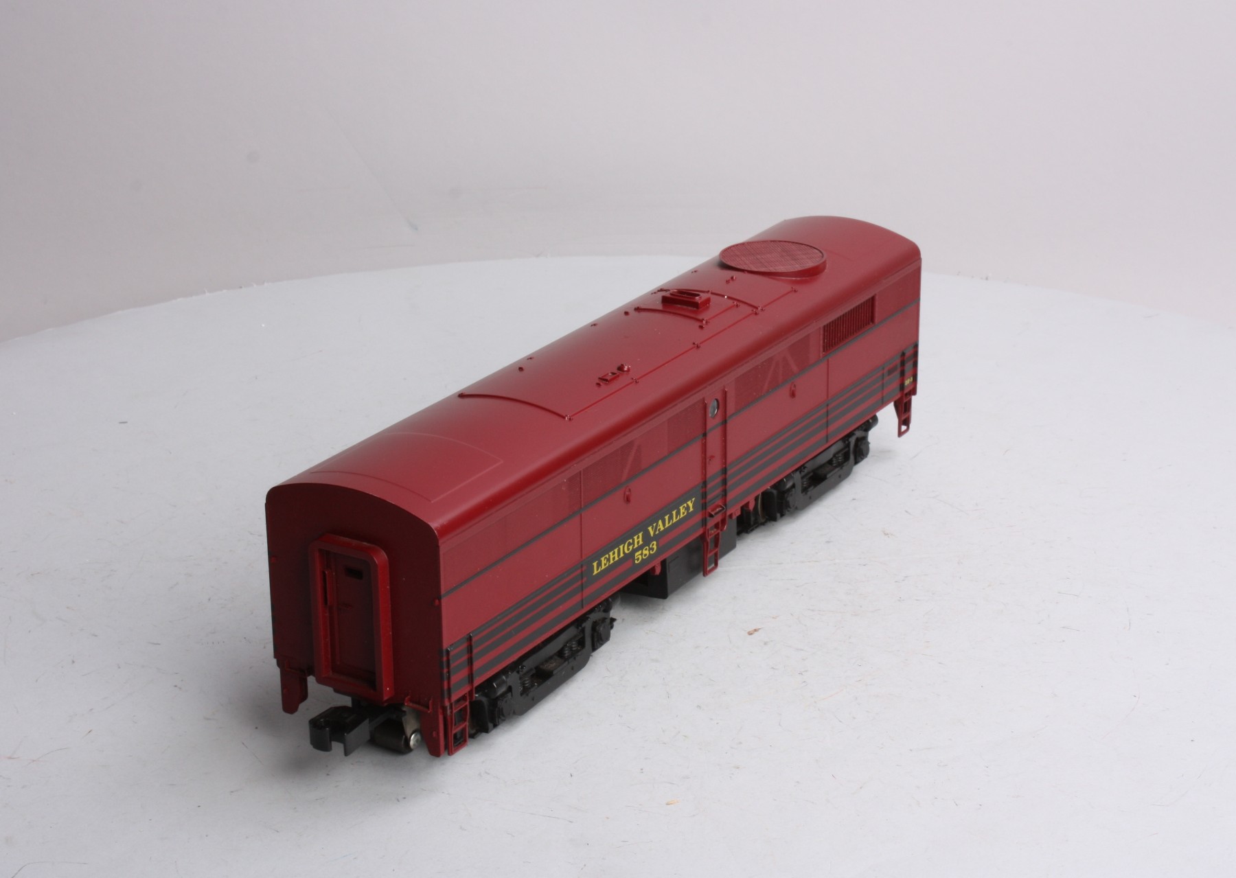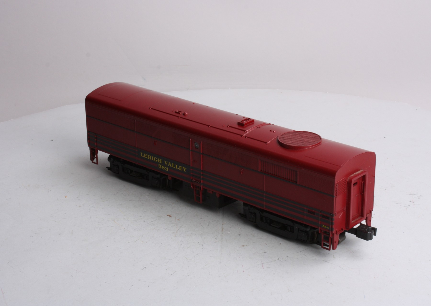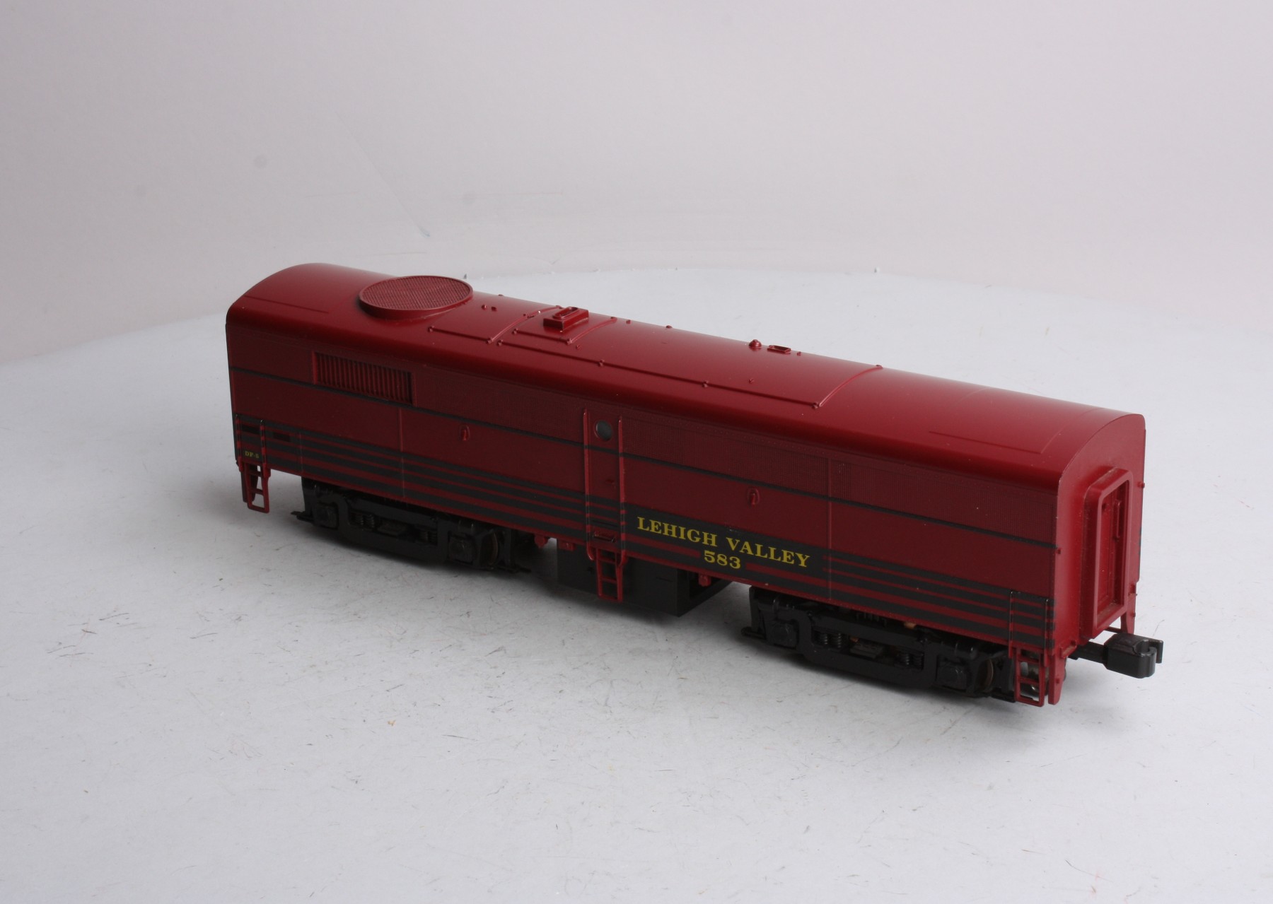 Here is a Weaver 6521 O Gauge Lehigh Valley Hi-Rail FA-2 Powered B-Unit Diesel Locomotive. Features include plastic construction, motor, plastic trucks, plastic fixed knuckle couplers, and metal wheels.