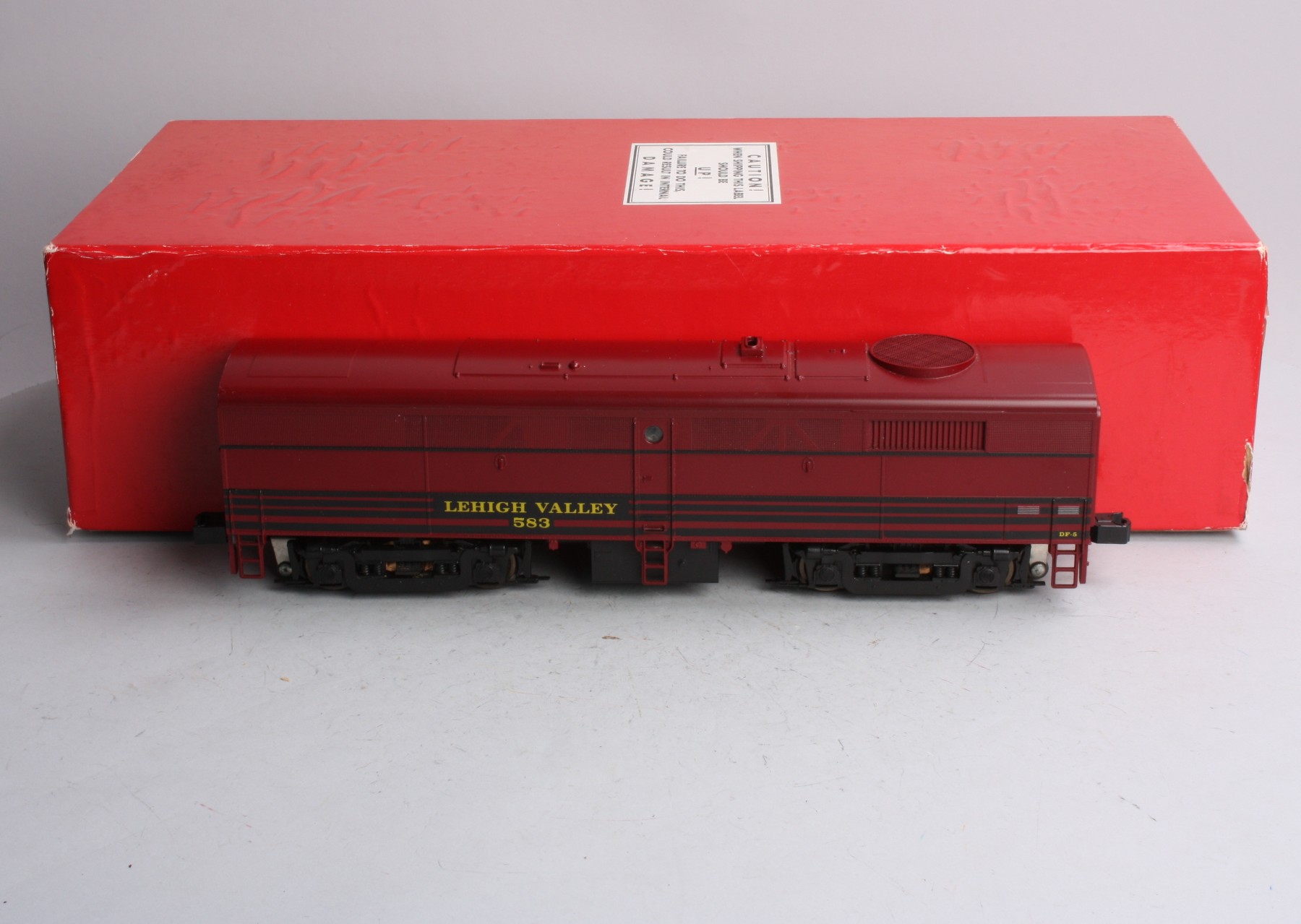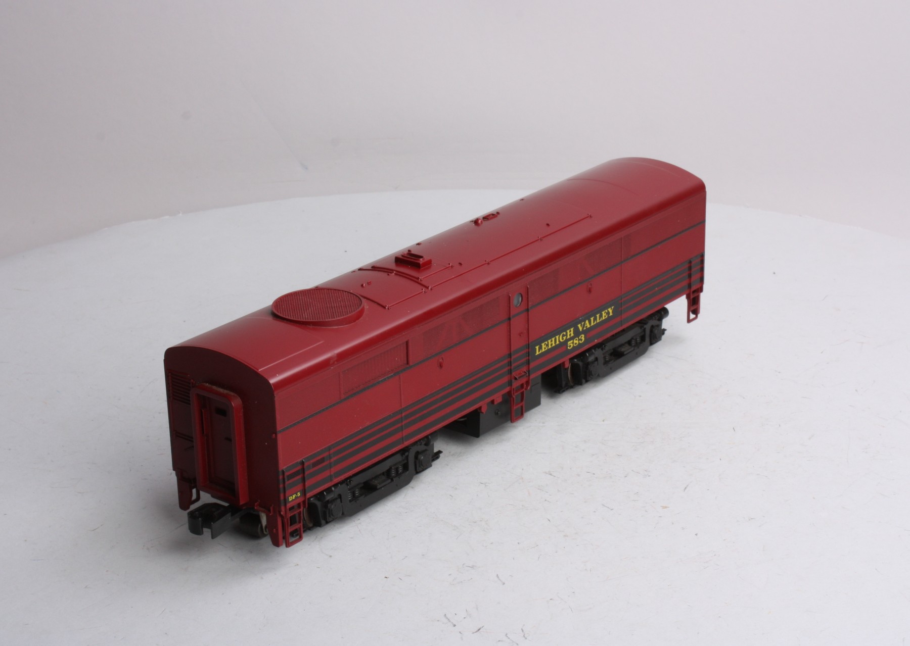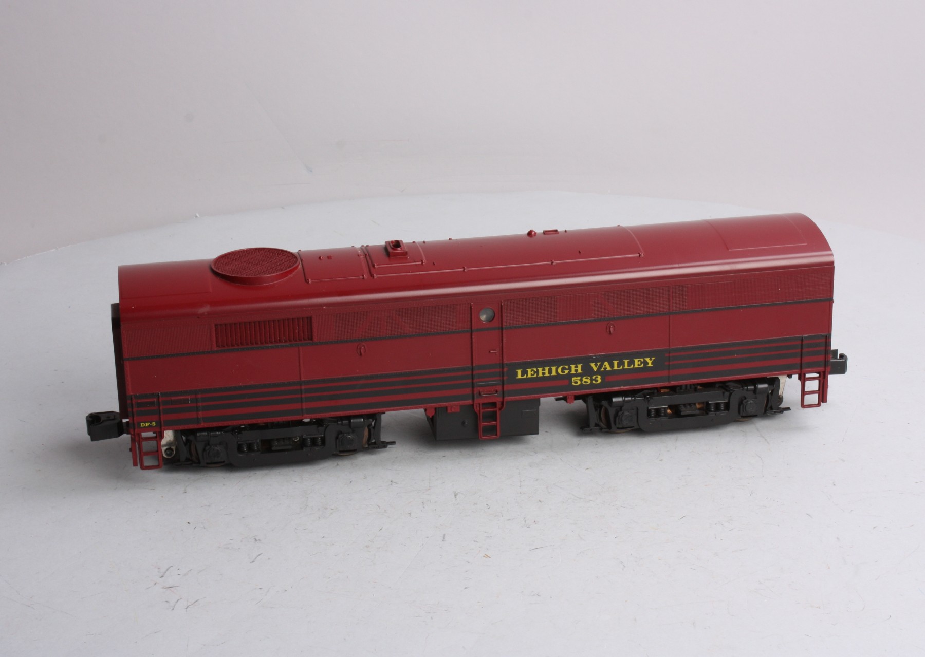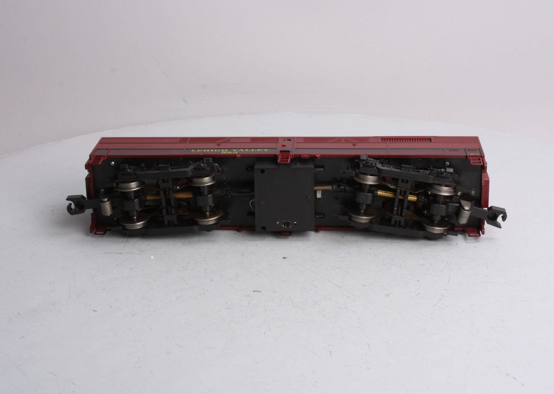 Here is a Weaver 6521 O Gauge Lehigh Valley Hi-Rail FA-2 Powered B-Unit Diesel Locomotive. Features include plastic construction, motor, plastic trucks, plastic fixed knuckle couplers, and metal wheels.